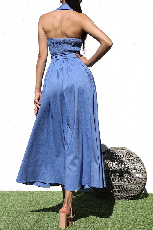 halter maxi dress with slit on one side and pockets.Material: 65% rayon, 30% polyester and 5% spandex