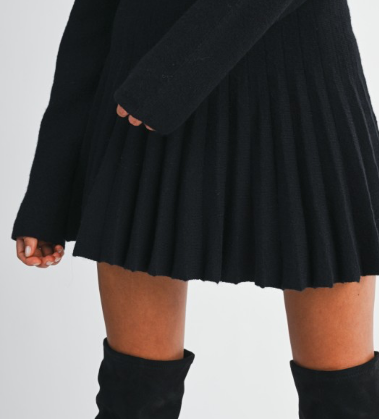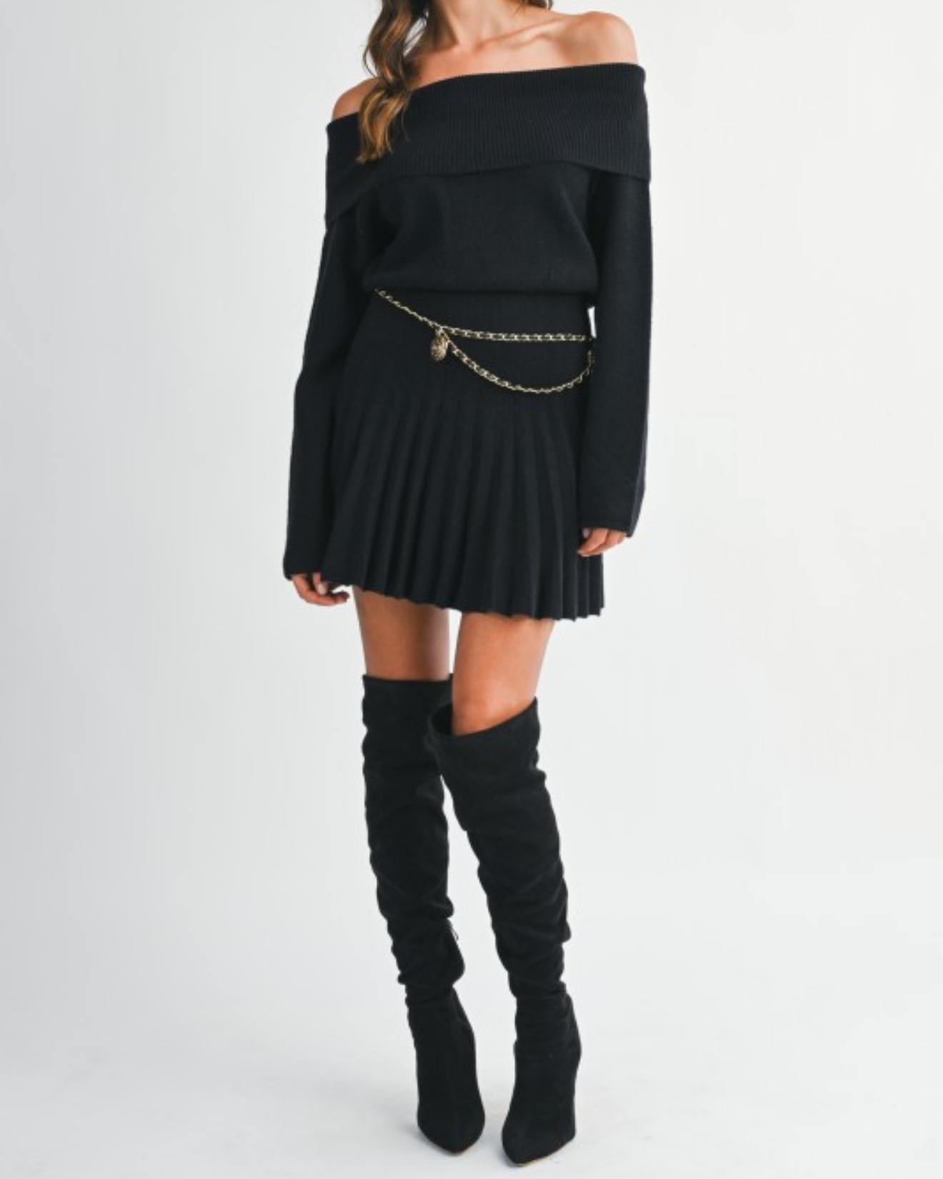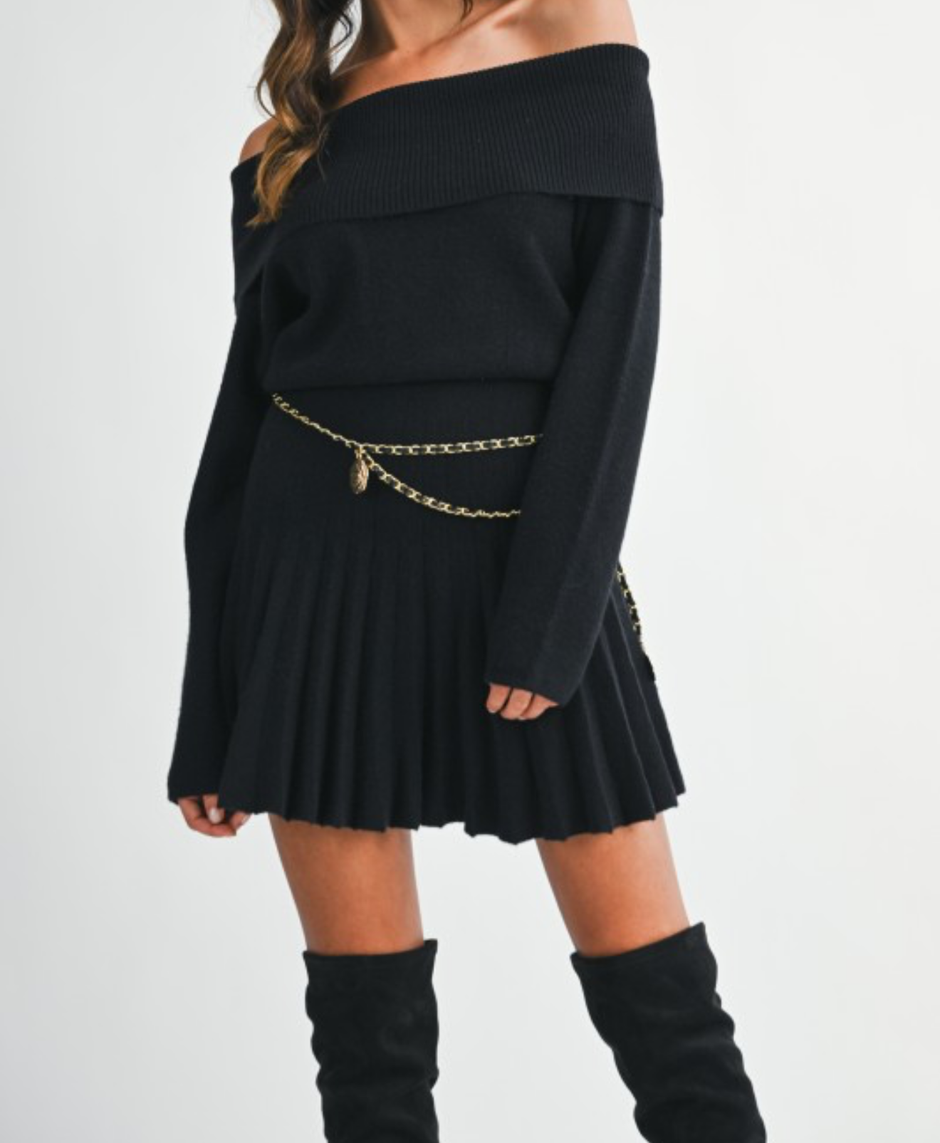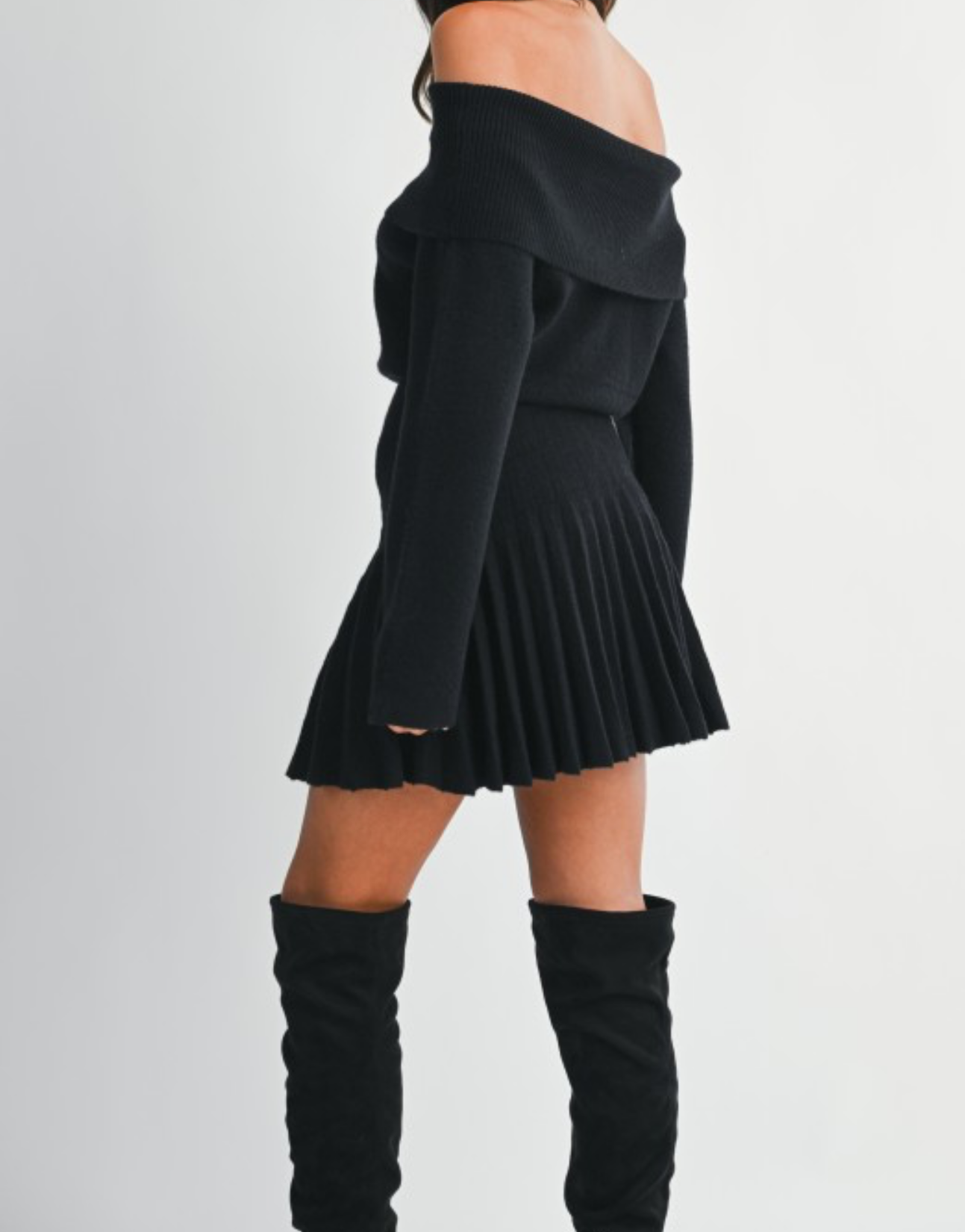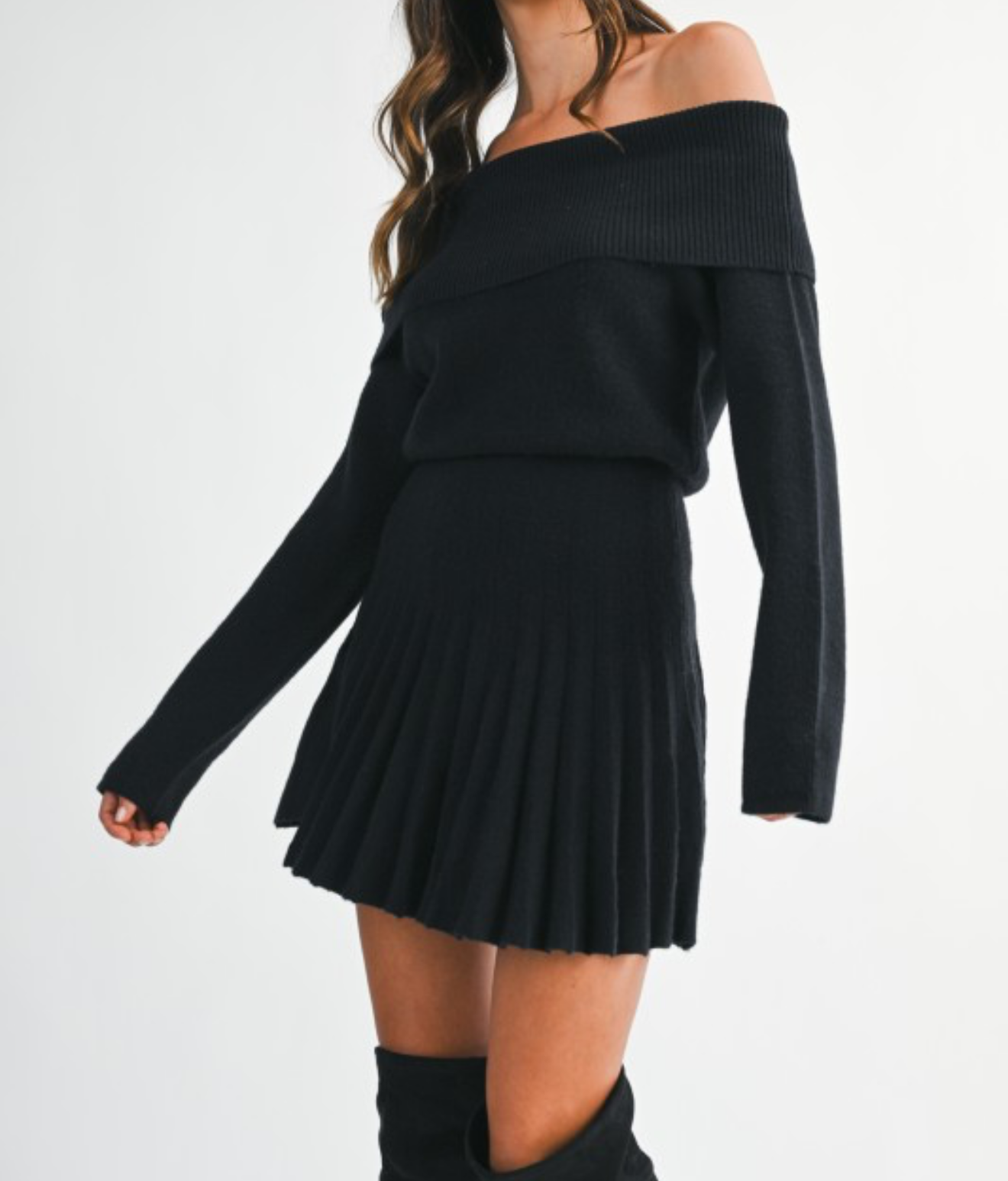 Ribbed knit off shoulder long sleeve fitted waist with pleated skirt mini dress.