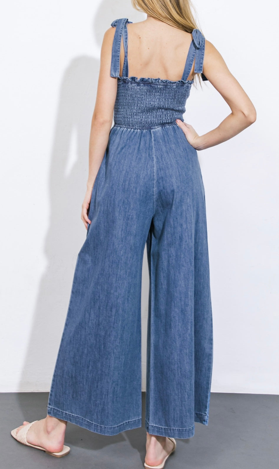 The GETTING IT DONE DENIM JUMPSUIT boasts a clean and crisp washed denim, with a sleek straight neckline and elegant shoulder ties. The smocked bodice cinches the waist for a flattering silhouette, while the wide leg adds a touch of sophistication.