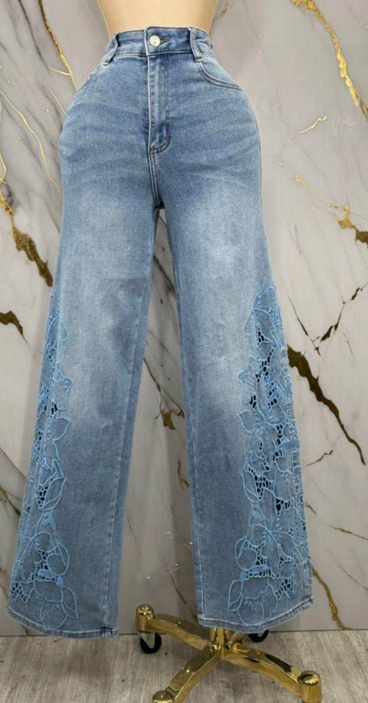 high waisted denim jeans with intricate blue embroidery on the lower sides of legs. Perfect for a chic and casual look.