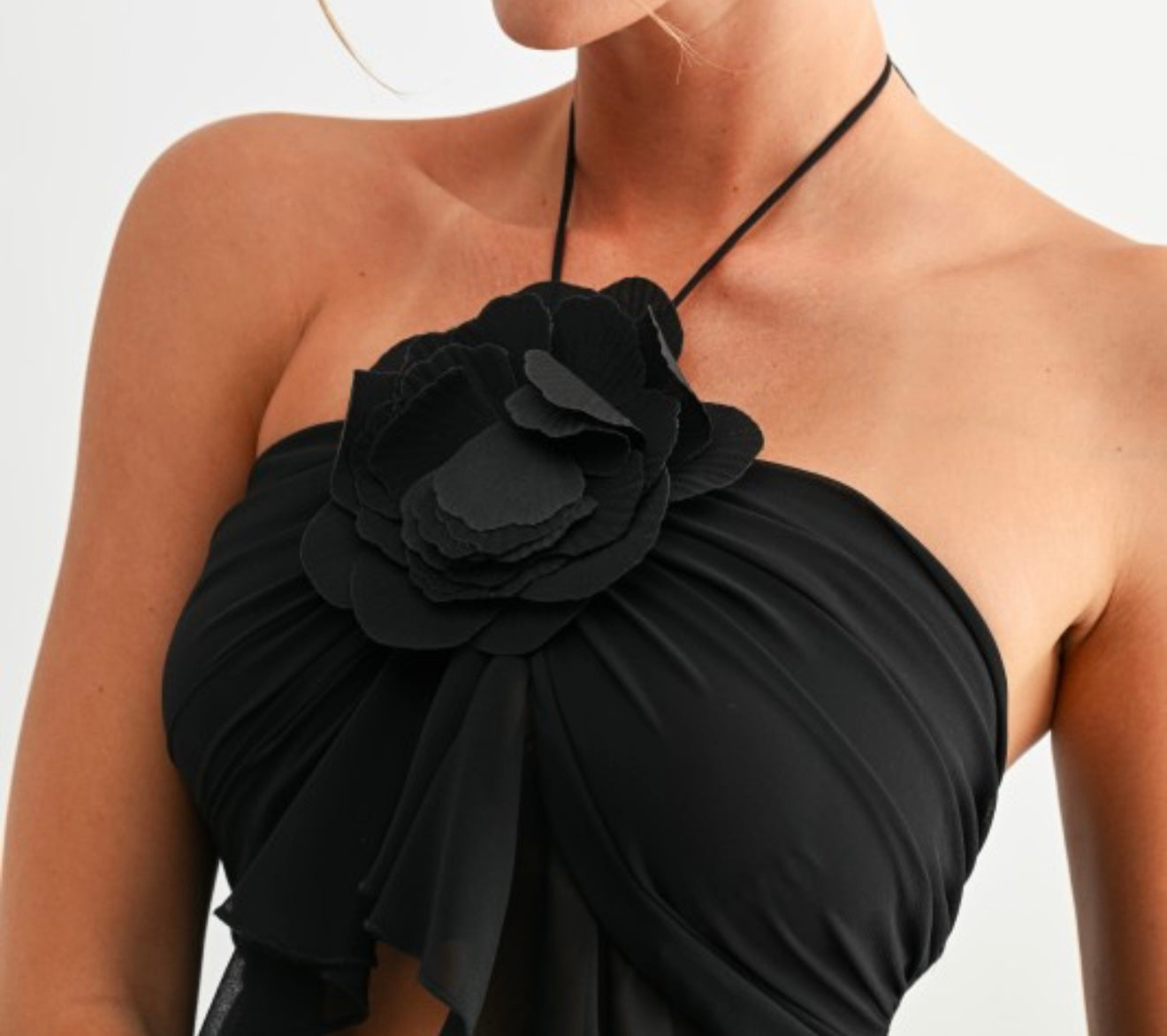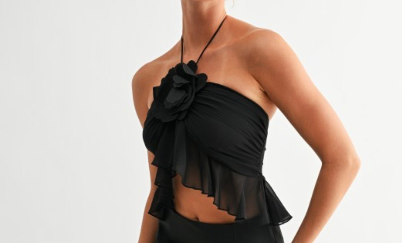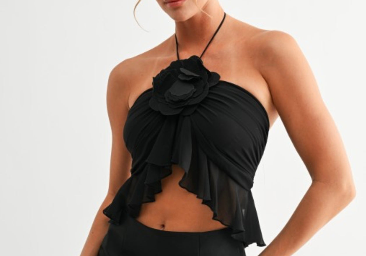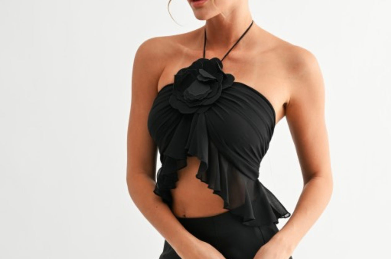 Designed with a halter tie neckline and two secure buttons at the back, it showcases a cascading ruffle front finished with a statement floral applique detail at the center. The layered chiffon ruffles create a soft peplum effect at the waist for a feminine silhouette. The open back adds a sleek touch, making this top versatile for both day and night looks.