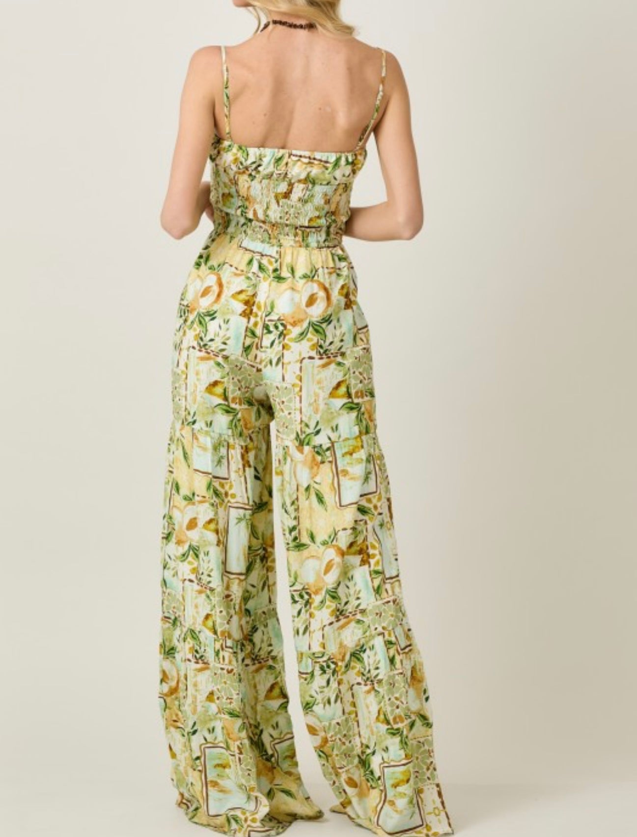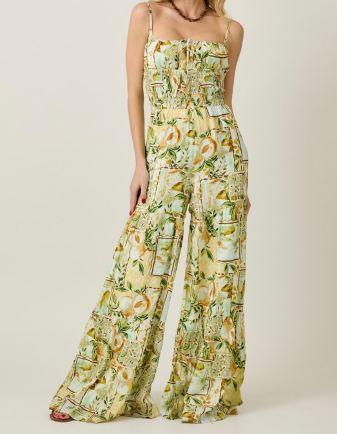 This vibrant lemon-print jumpsuit is the epitome of fresh, summery elegance! Featuring a smocked bodice with a tie-front detail and wide-leg pants, this piece offers a relaxed yet flattering fit.
