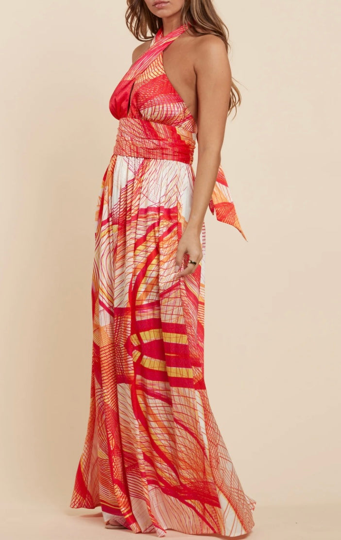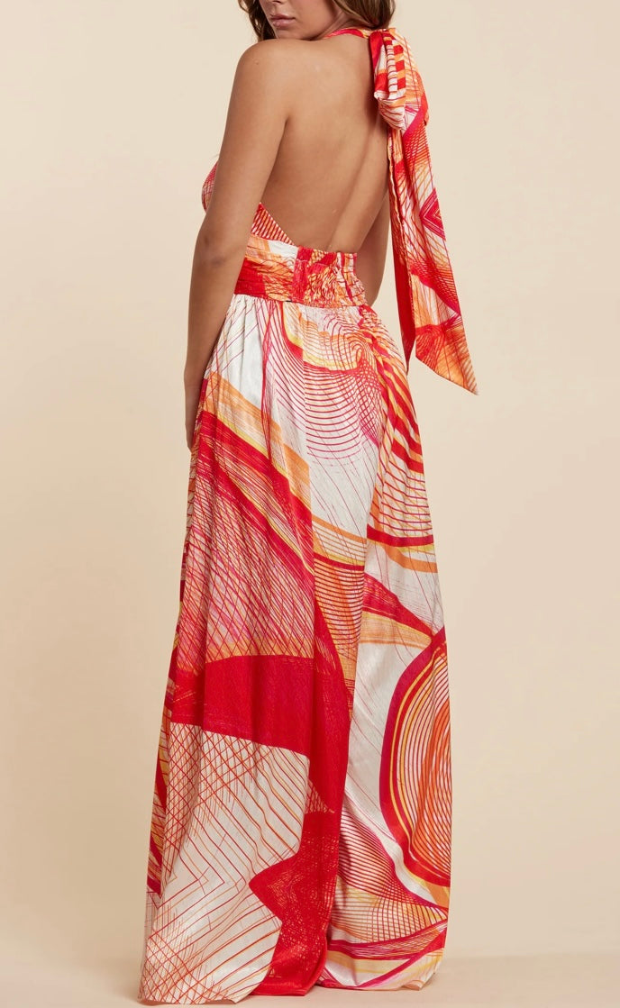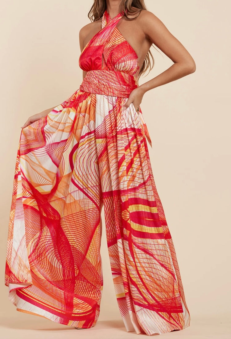 Unleash your vibrant and bold spirit with our stunning Red Radiance Jumpsuit. Crafted with an intricate blend of red and orange hues, adorned with abstract patterns that dance gracefully across the fabric, this piece is a testament to modern elegance fused with a touch of bohemian charm. The halter neck design accentuates the shoulders, while the cinched waist flows into a wide-leg silhouette ensuring both comfort and style. Whether it's a casual day out or an evening soiree, the Red Radiance Jumpsuit promises to be your go-to choice for making a statement
