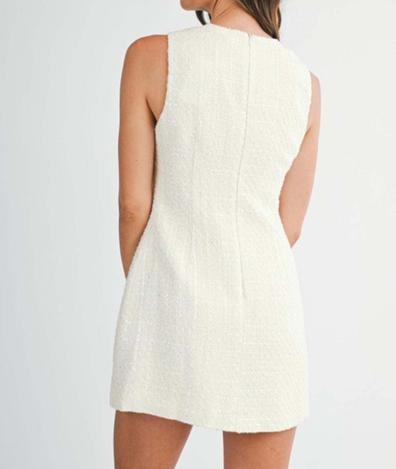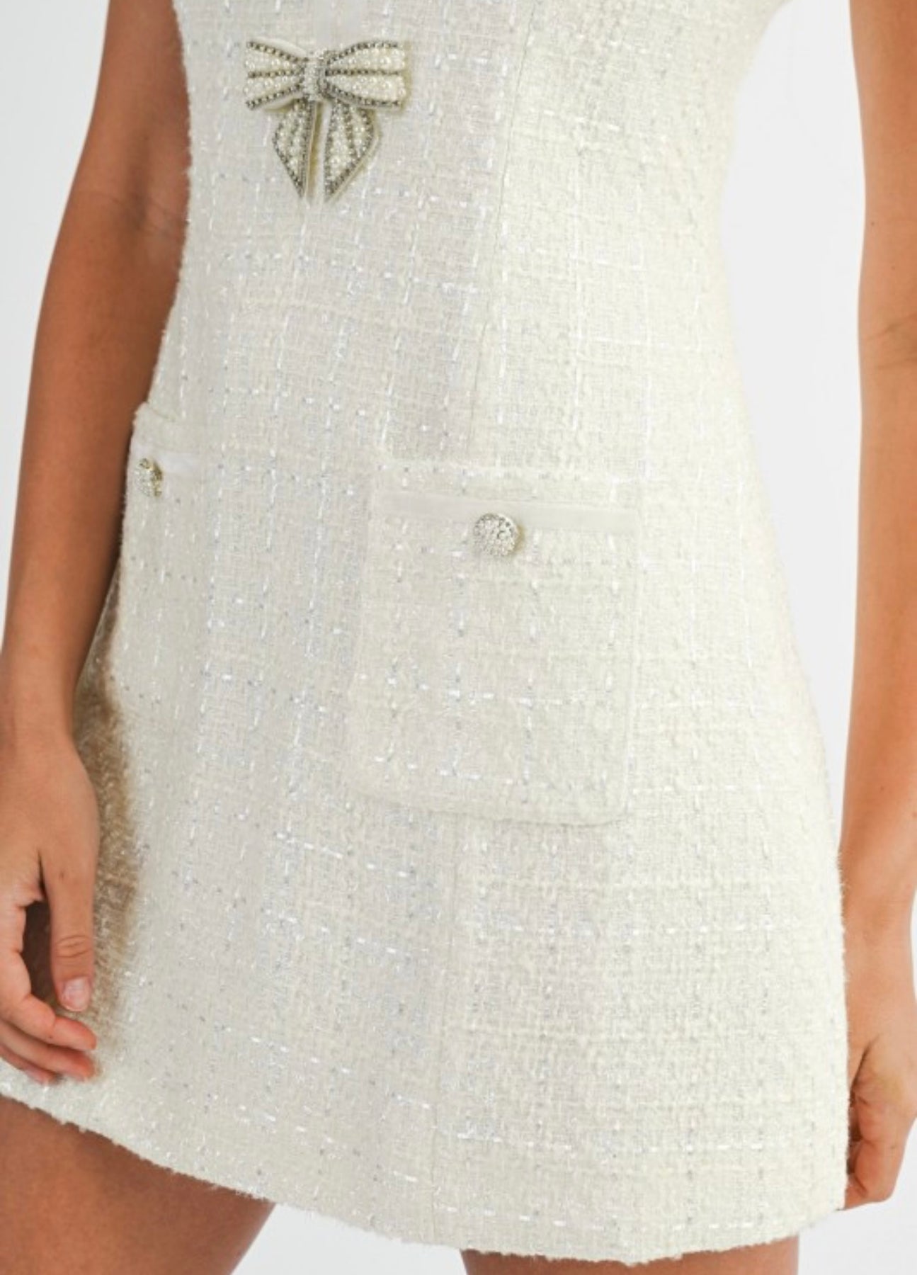 Textured tweed sleeveless rhinestone bow embellishment detail front cutout mini dress. Back invisible zipper. Lining.