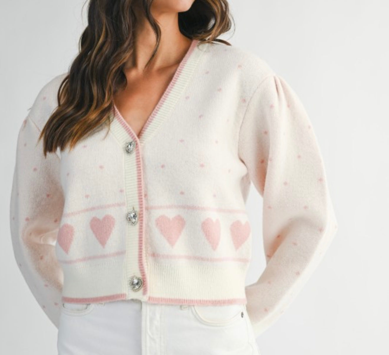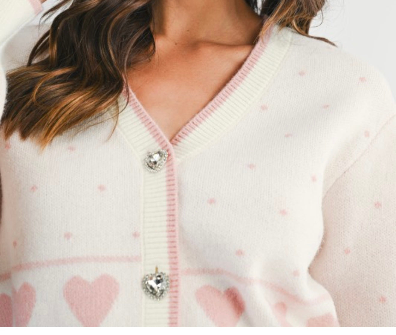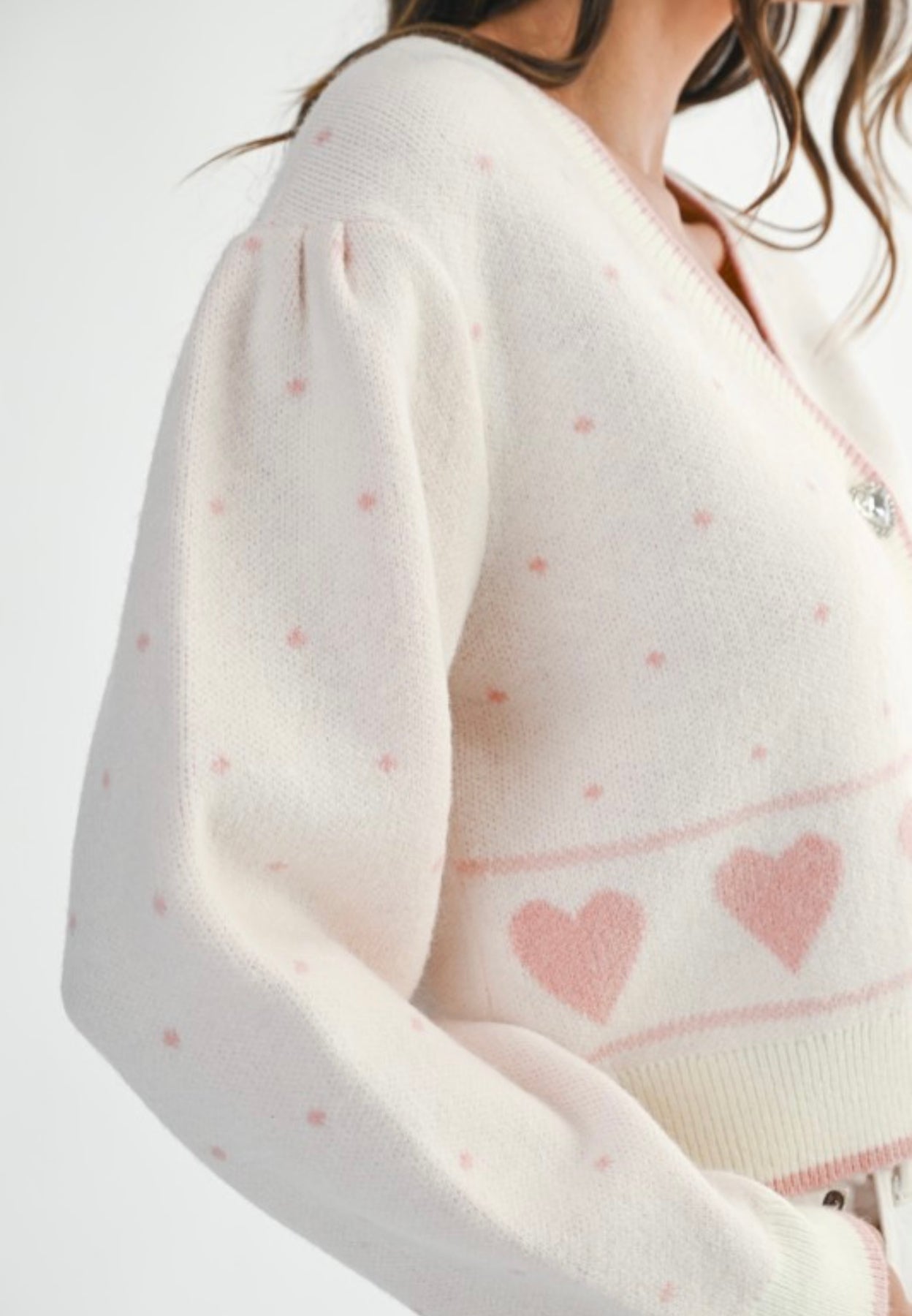 Knit polka dot and heart jacquard v neckline long sleeve crystal heart-shaped button down cardigan top.