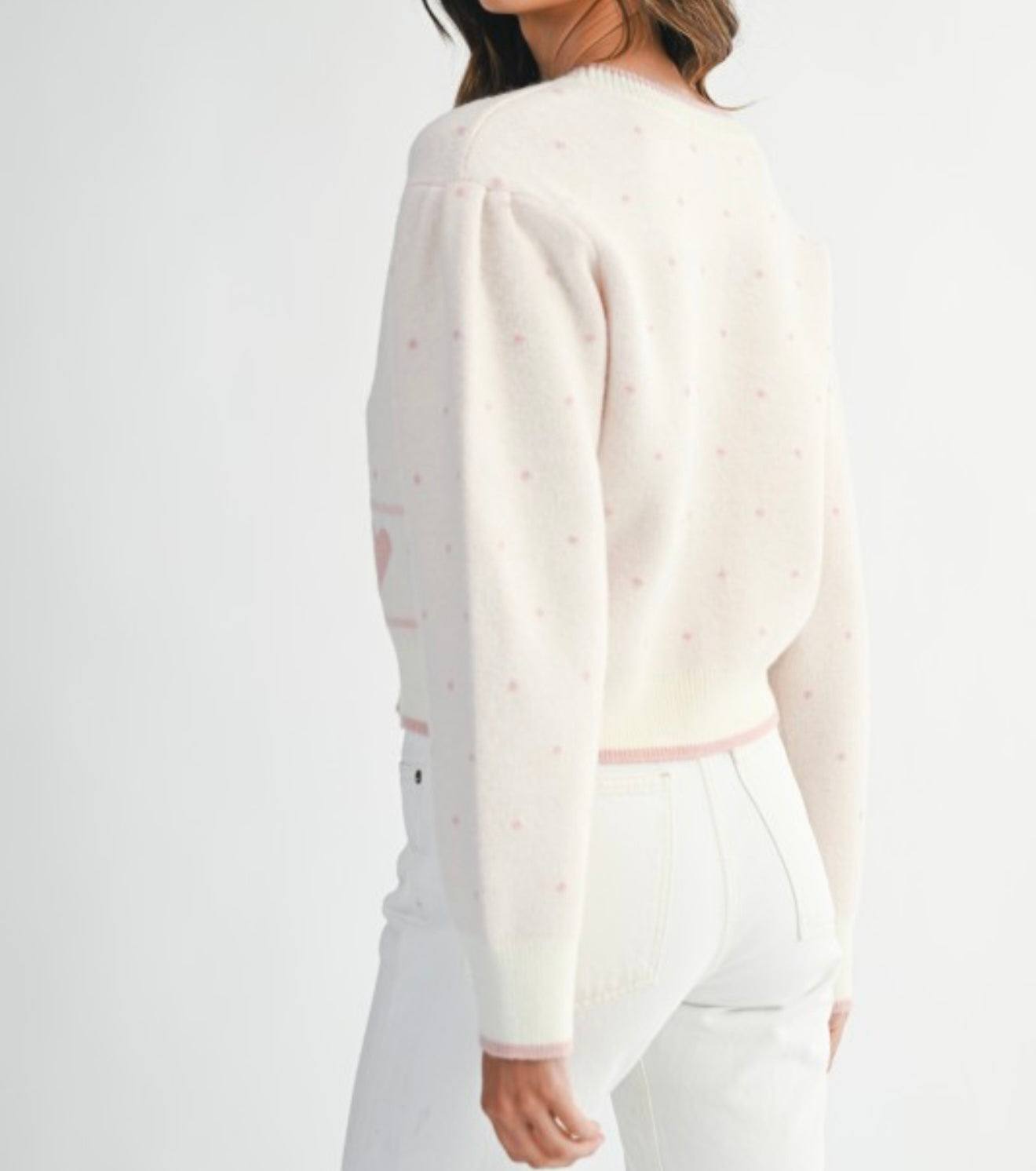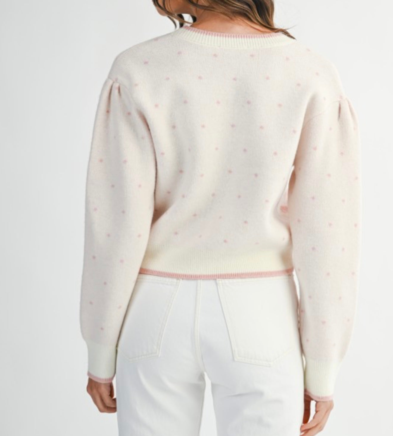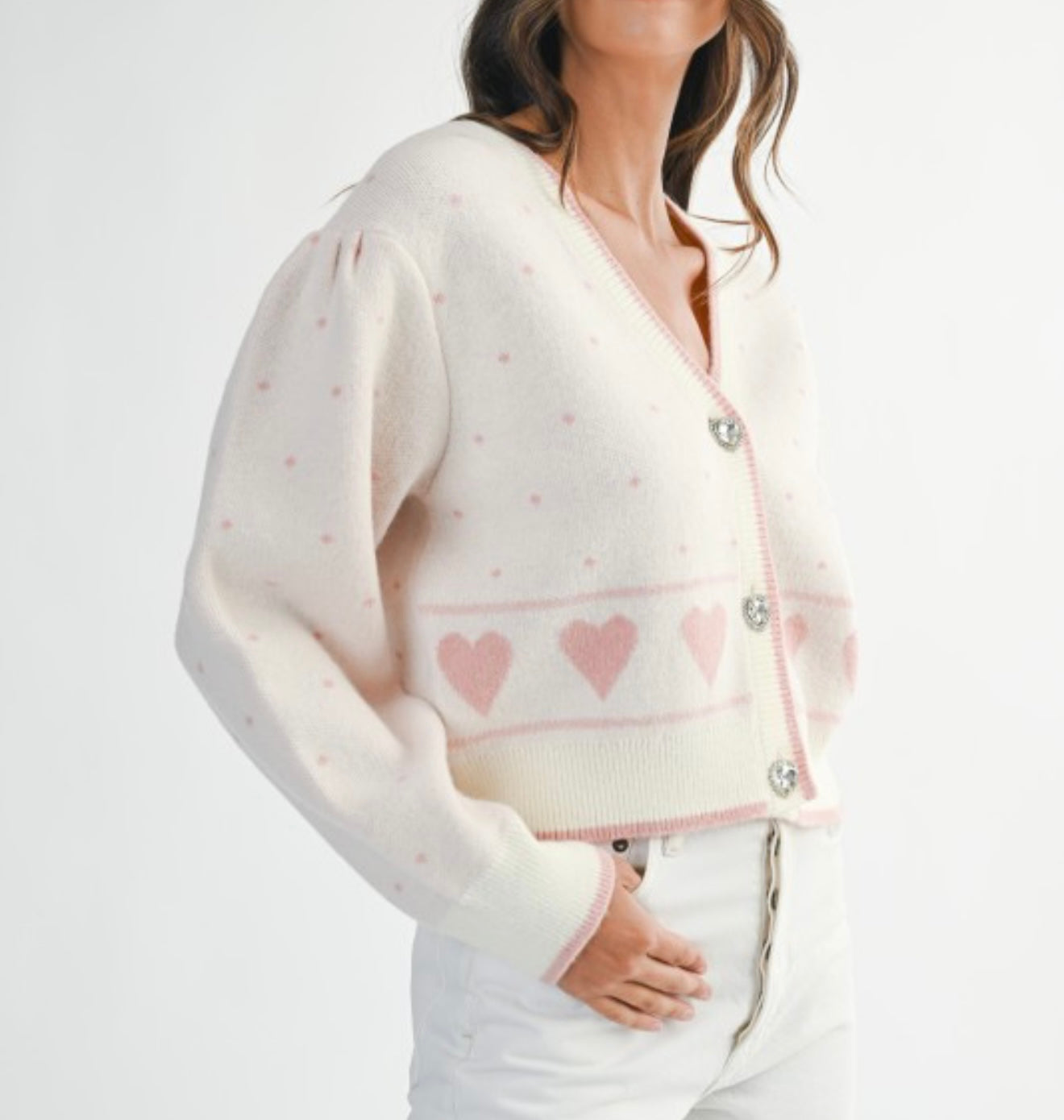 Knit polka dot and heart jacquard v neckline long sleeve crystal heart-shaped button down cardigan top.