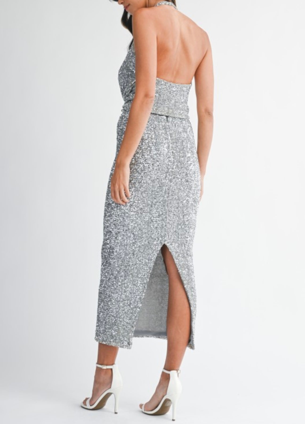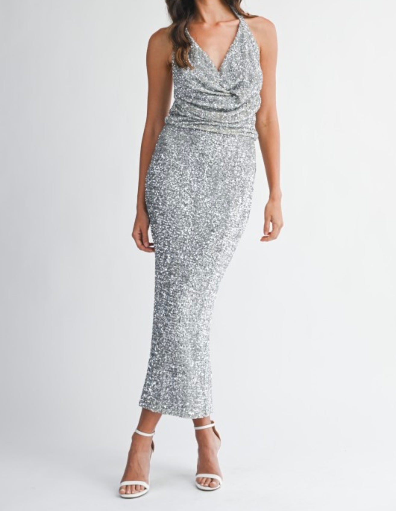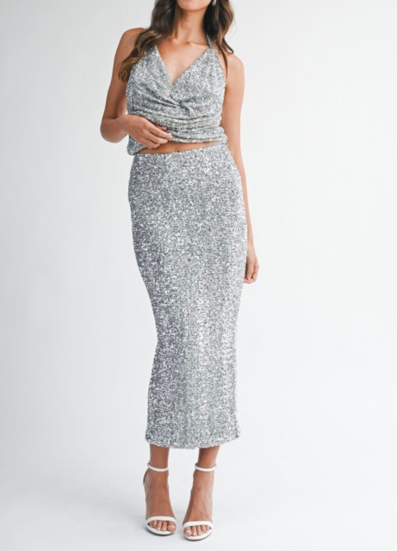 Sequin draped cowl neckline crop top and matching high-waisted midi skirt set. Skirt has back invisible zipper. Lining.