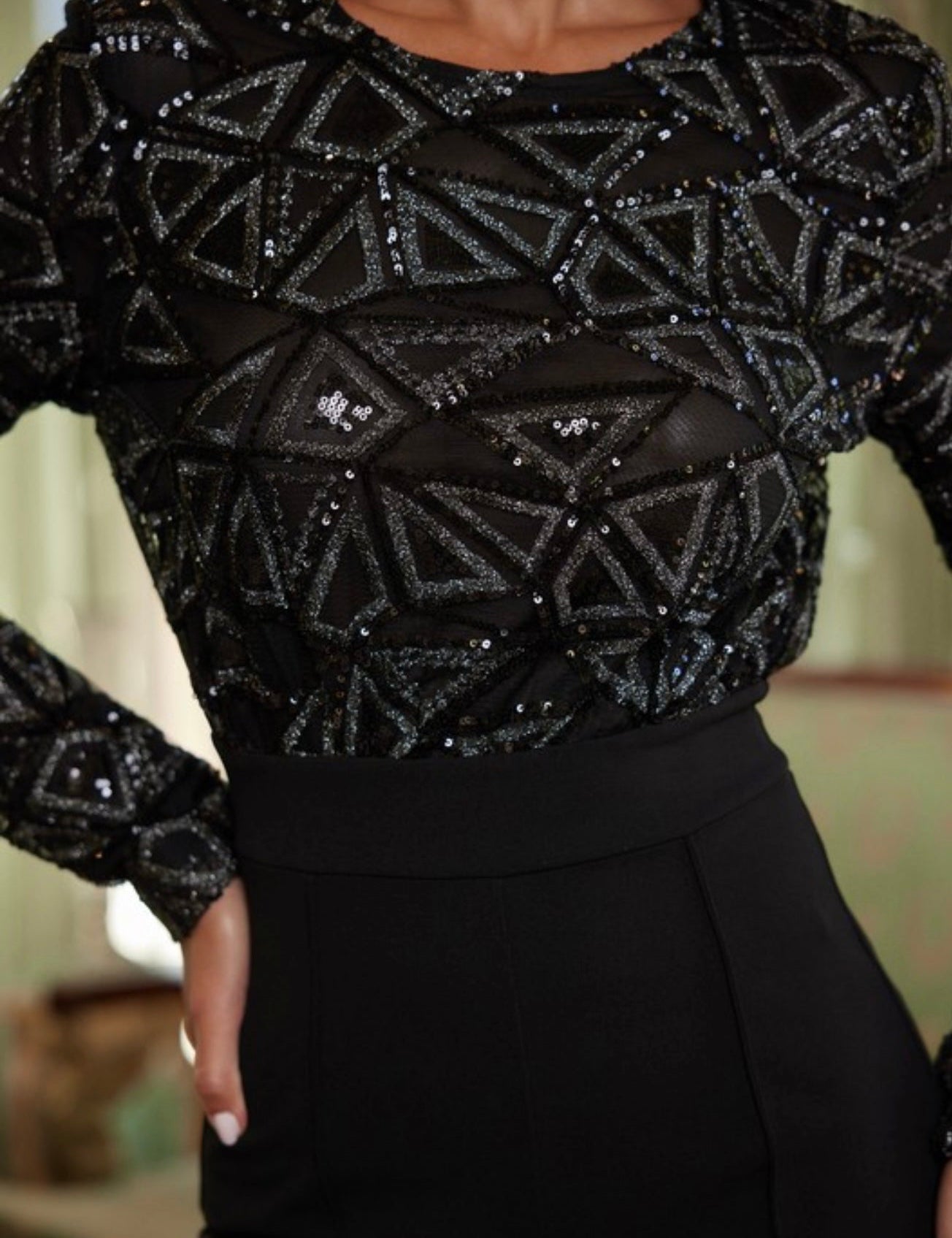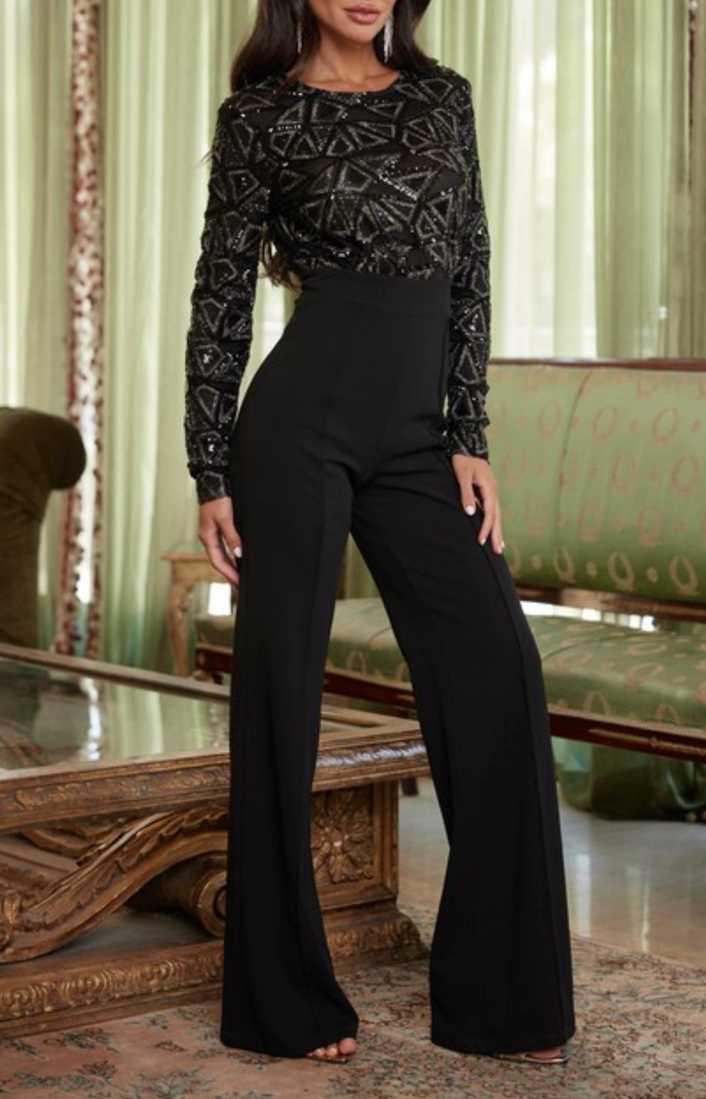 Turn heads in this statement jumpsuit featuring a shimmering sequin print with metallic detailing throughout. Designed with sheer mesh long sleeves and a rounded neckline, it offers a sleek yet glamorous silhouette. The flattering flare leg adds drama, while the hidden back zipper ensures a seamless fit—perfect for nights out or special occasions.