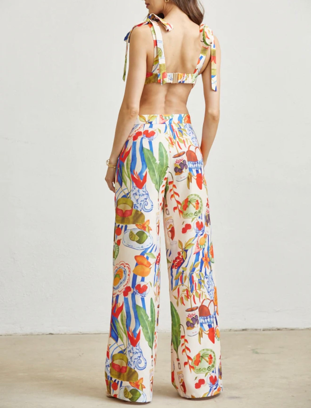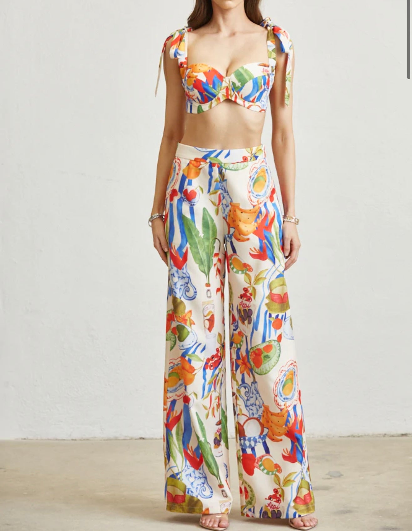 Top and pant set. Linen look woven fabric. Tuscan fruit print. Sweetheart top with self tie straps. Underwire bra plus padding. It has a metal clasp closure. High waist, wide leg pant fit. Side zipper closure.