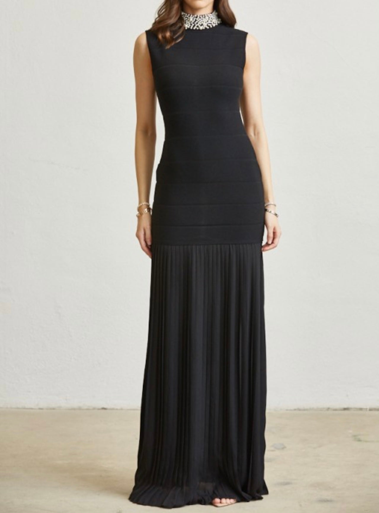 Crafted from a soft, stretchy bandage knit, this gown beautifully contours the body with a sleek, bodycon silhouette and elegant drop waist design. The mock neckline, adorned with hand-embellished rhinestones and pearls, adds a touch of refined glamour. A pleated dobby chiffon skirt flows effortlessly from the fitted bodice, creating graceful movement with every step. Finished with a concealed back zipper closure, this piece blends timeless sophistication with modern allure.