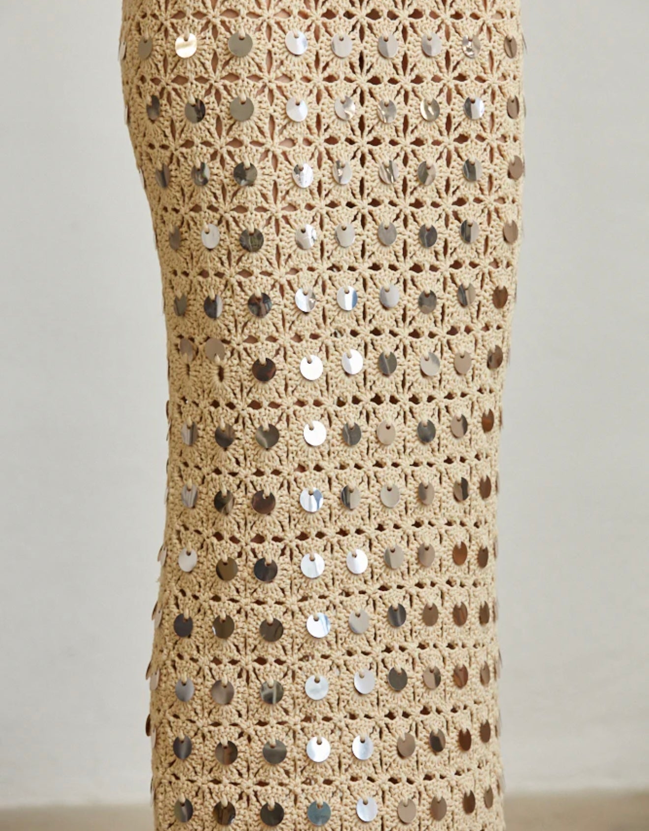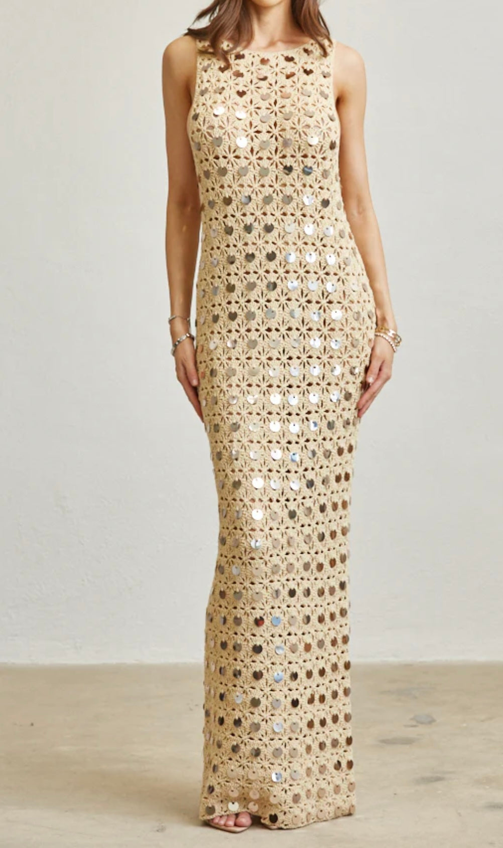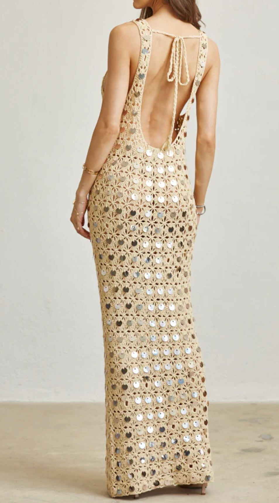Gracefully crafted in an open crochet knit, this piece is adorned with delicate round sequin trim that catches the light beautifully. The scooped low back and self-tie detail add a touch of refined allure, while the straight, pull-over silhouette offers effortless sophistication.