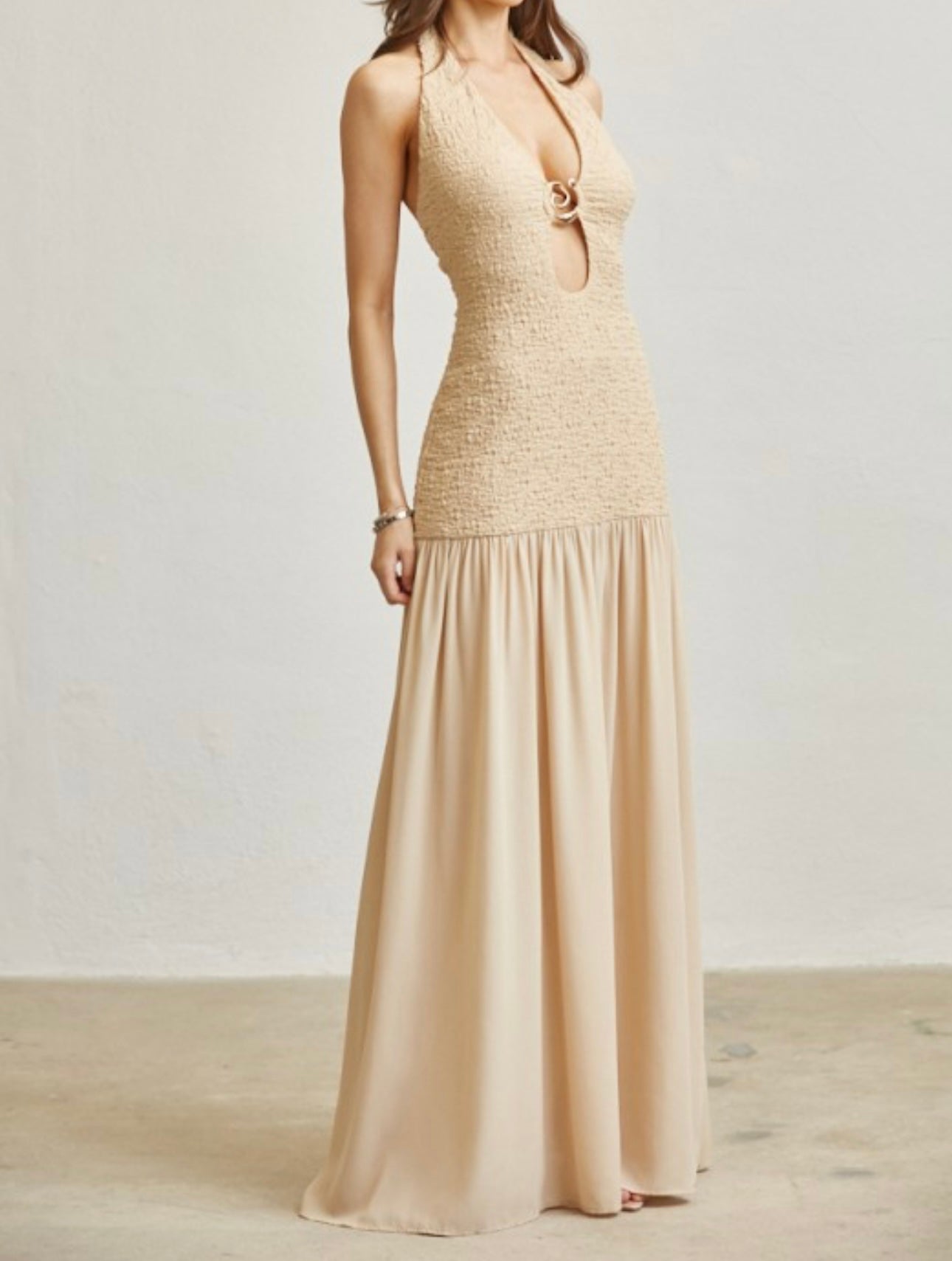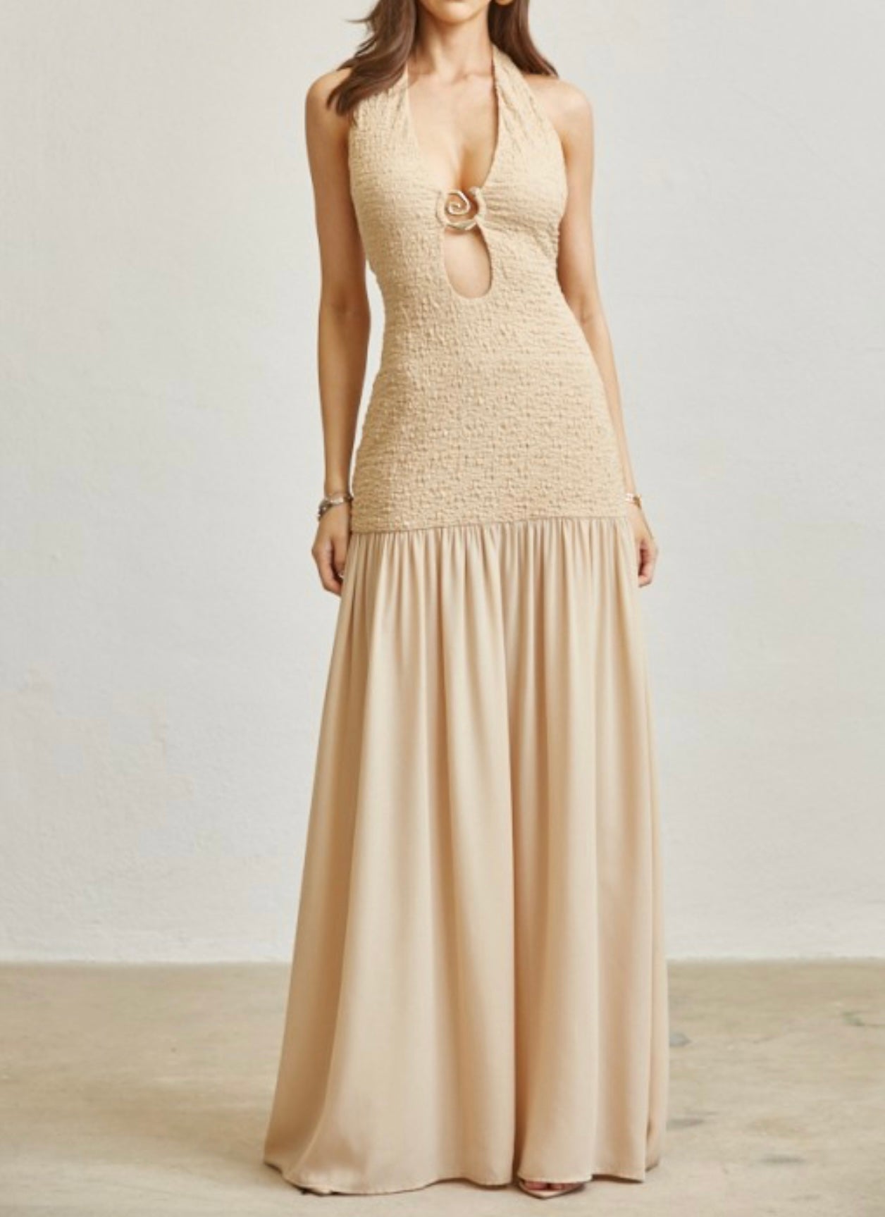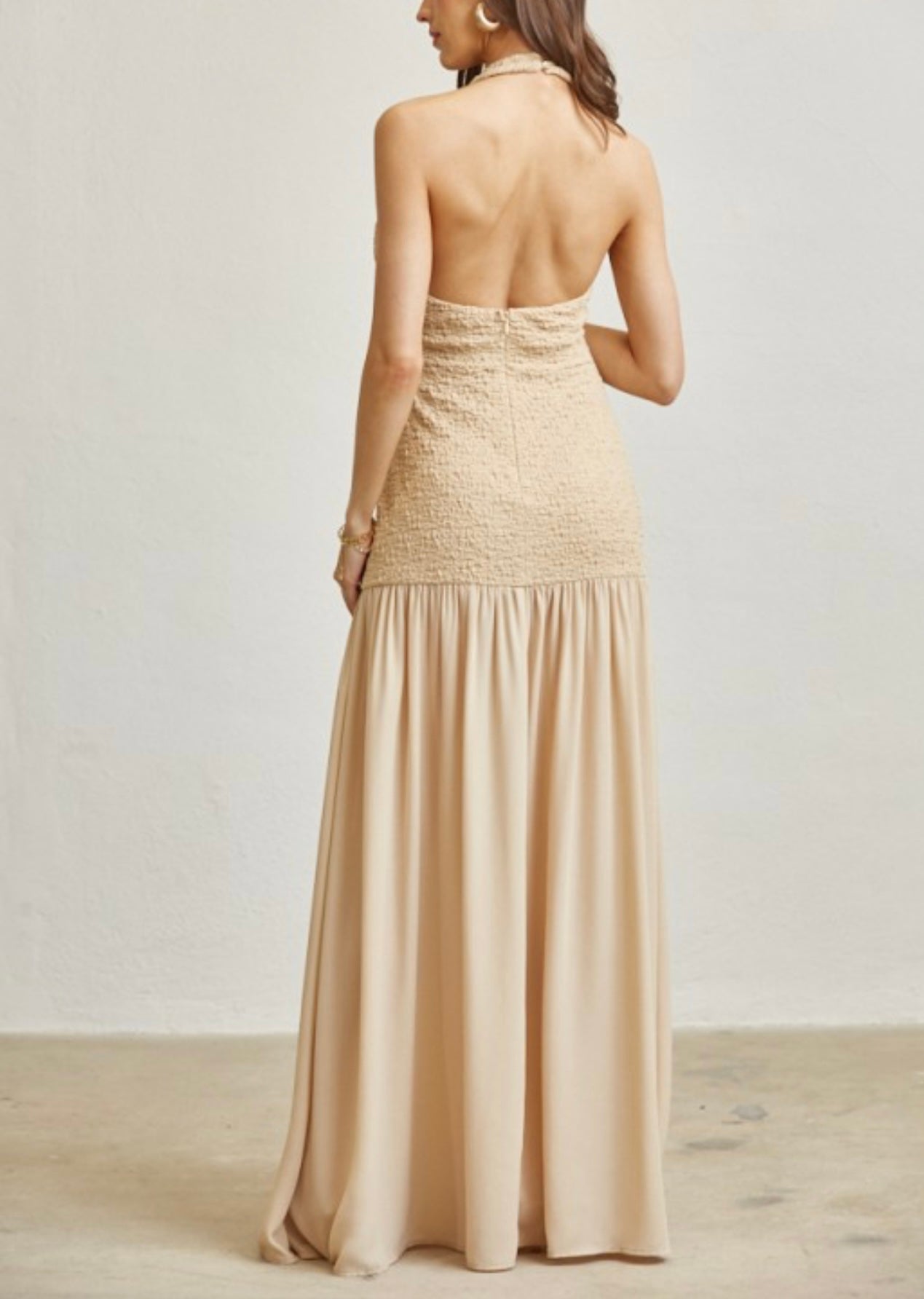 Halter neck dropwaist maxi dress in stretchy textured fabric. Plunging neckline with abstract spiral gold metal. Bodycon fit with contrast chiffon drop waist skirt. Back zipper closure.