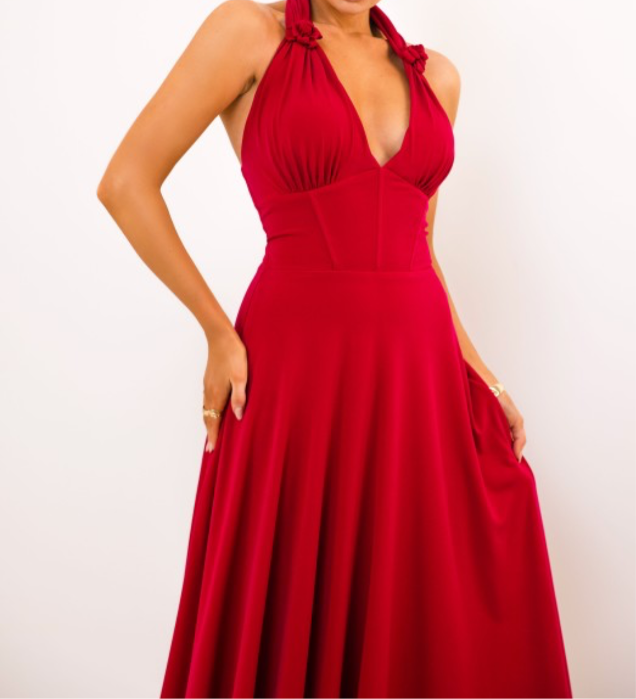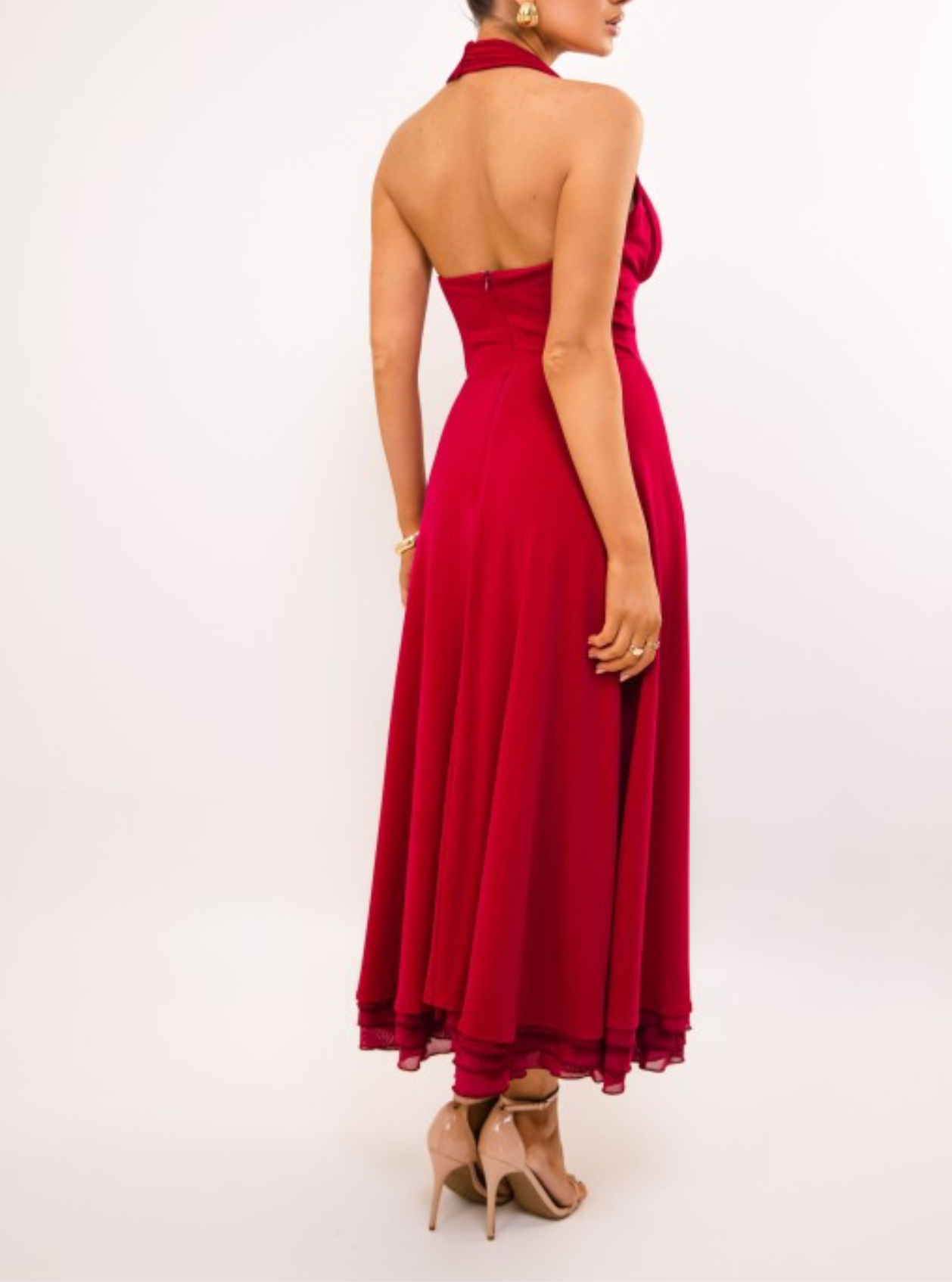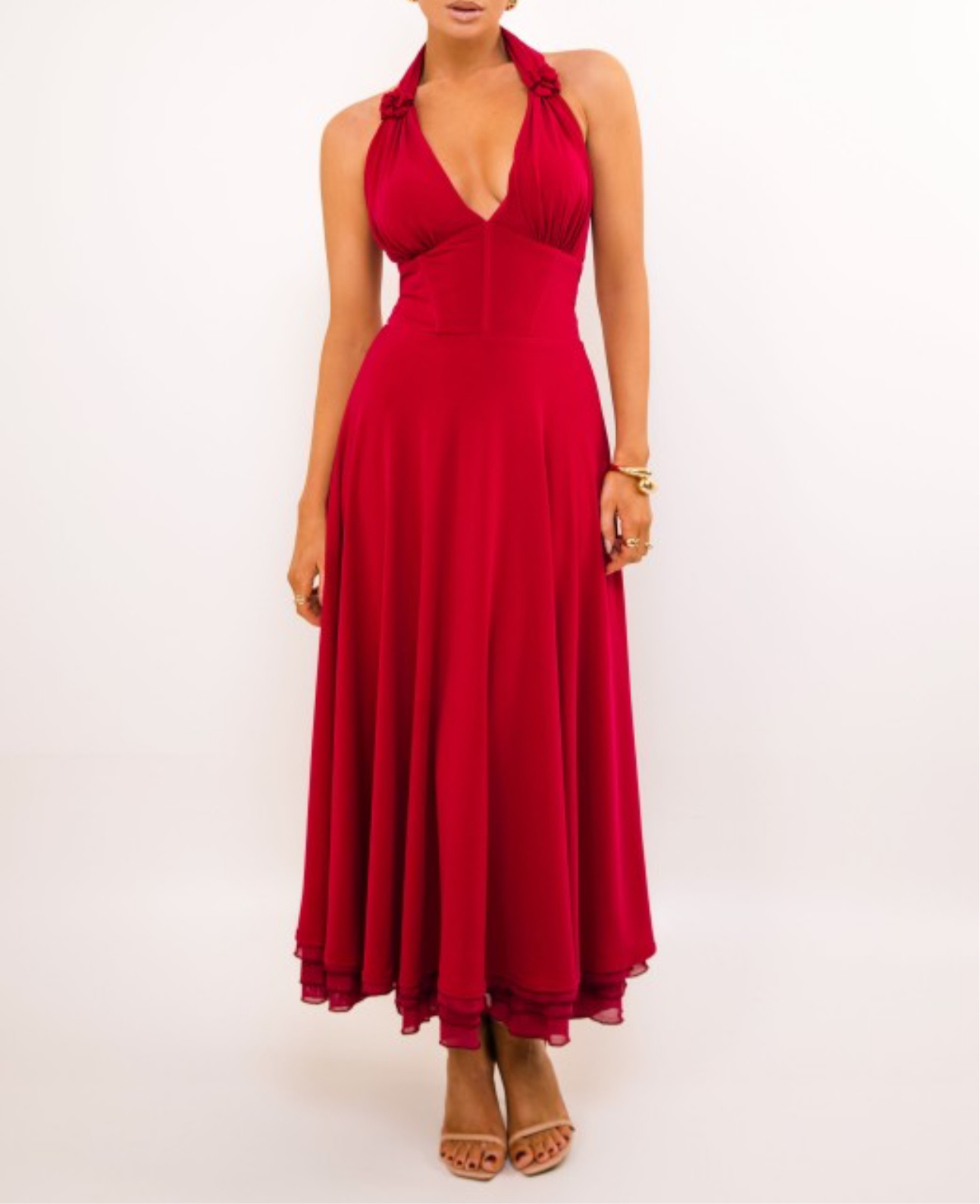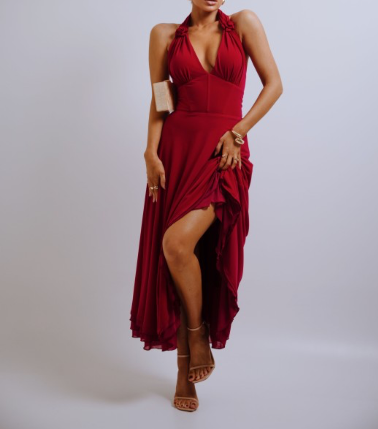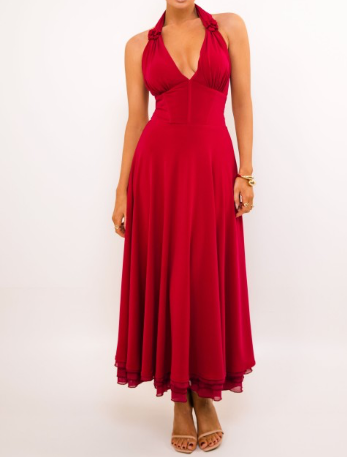 The Marla dress features a halter neckline adorned with delicate rose details, paired with a deep plunging V-cut that enhances the neckline. The bodice is structured and fitted at the waist, while the flowing A-line skirt falls to a graceful midi-maxi length. A layered hemline adds volume and movement, and the lightweight, fluid fabric gives it a soft, elegant drape. This dress is perfect for weddings, cocktail parties, or any event where timeless beauty is the dress code.