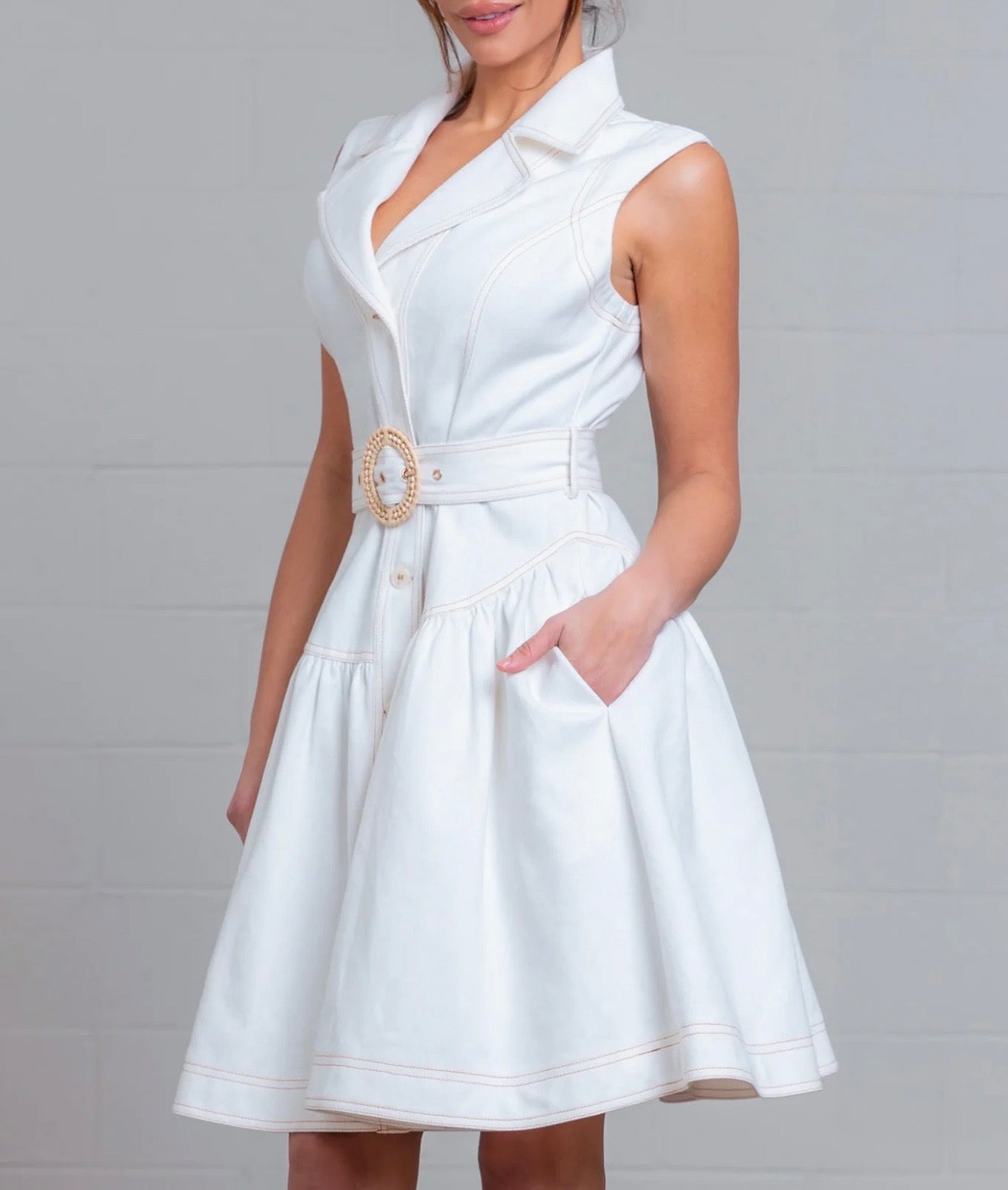 This sleeveless white denim mini dress combines structured style with effortless charm. Crafted from non-stretch denim, it features a flattering fit-and-flare silhouette with a cinched waist that enhances your shape. The V-neckline and classic collar add a polished touch, while the adjustable belt allows for a customizable fit. Functional side pockets and a button-down front bring both style and practicality, making this solid-color piece a versatile staple for chic daytime looks or casual outings.