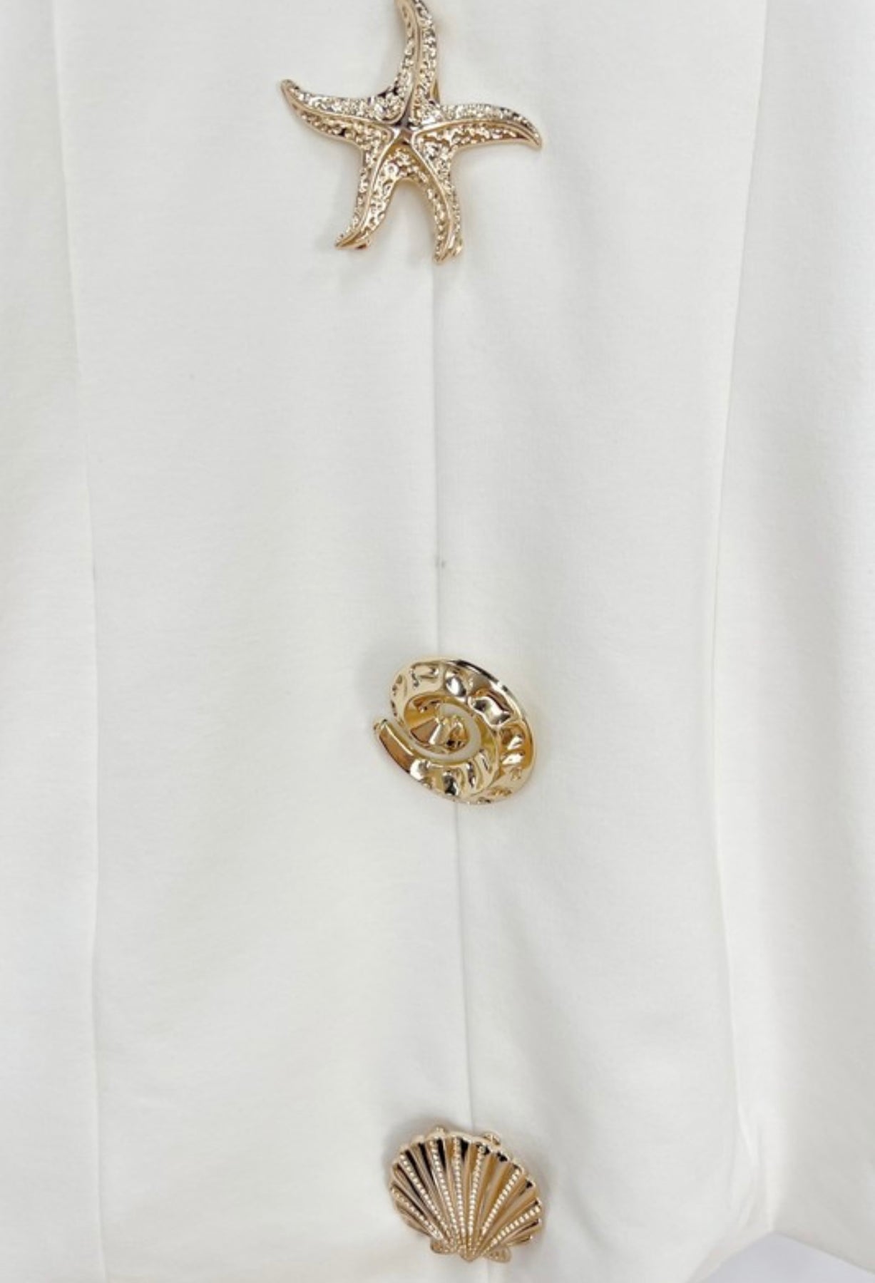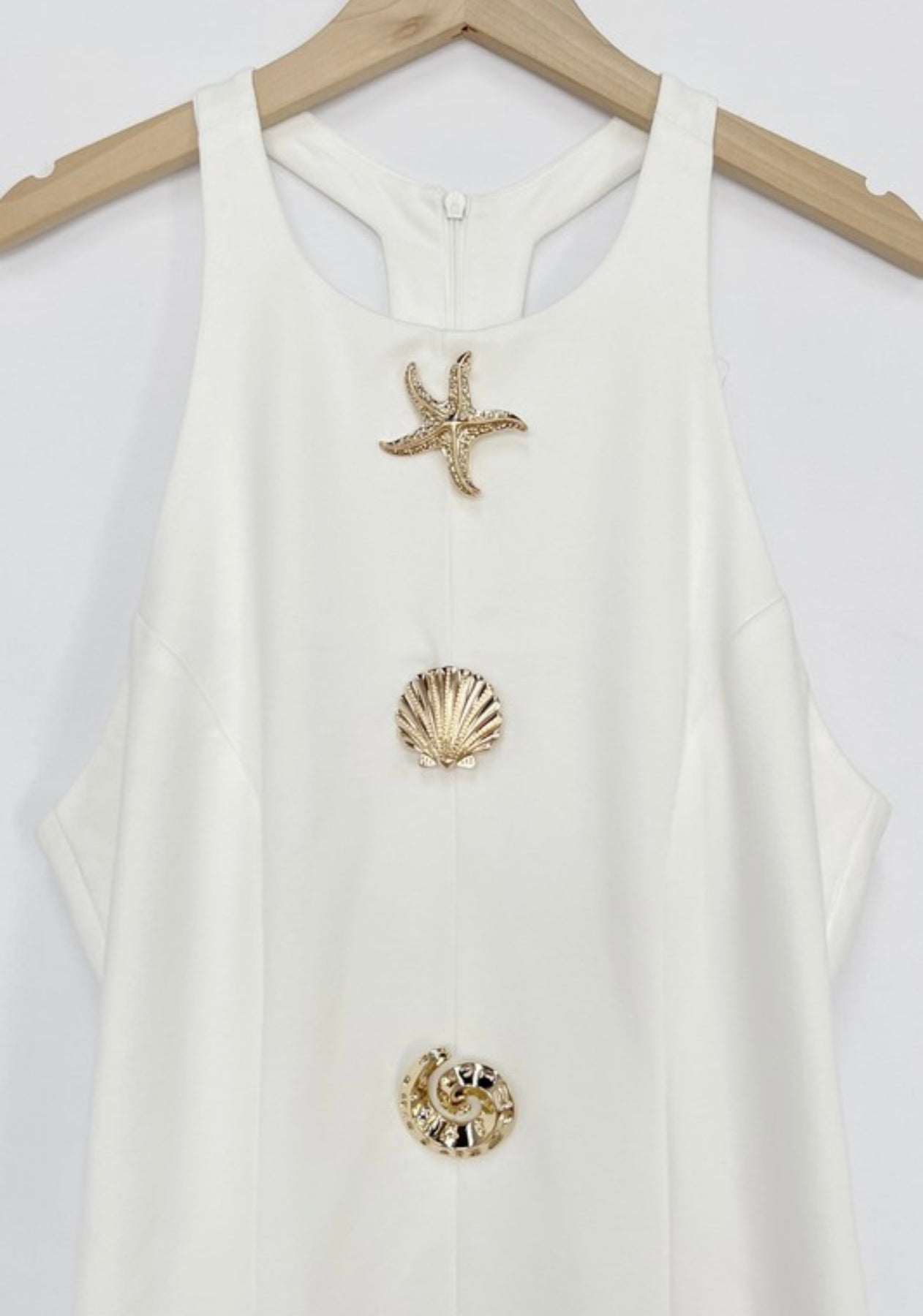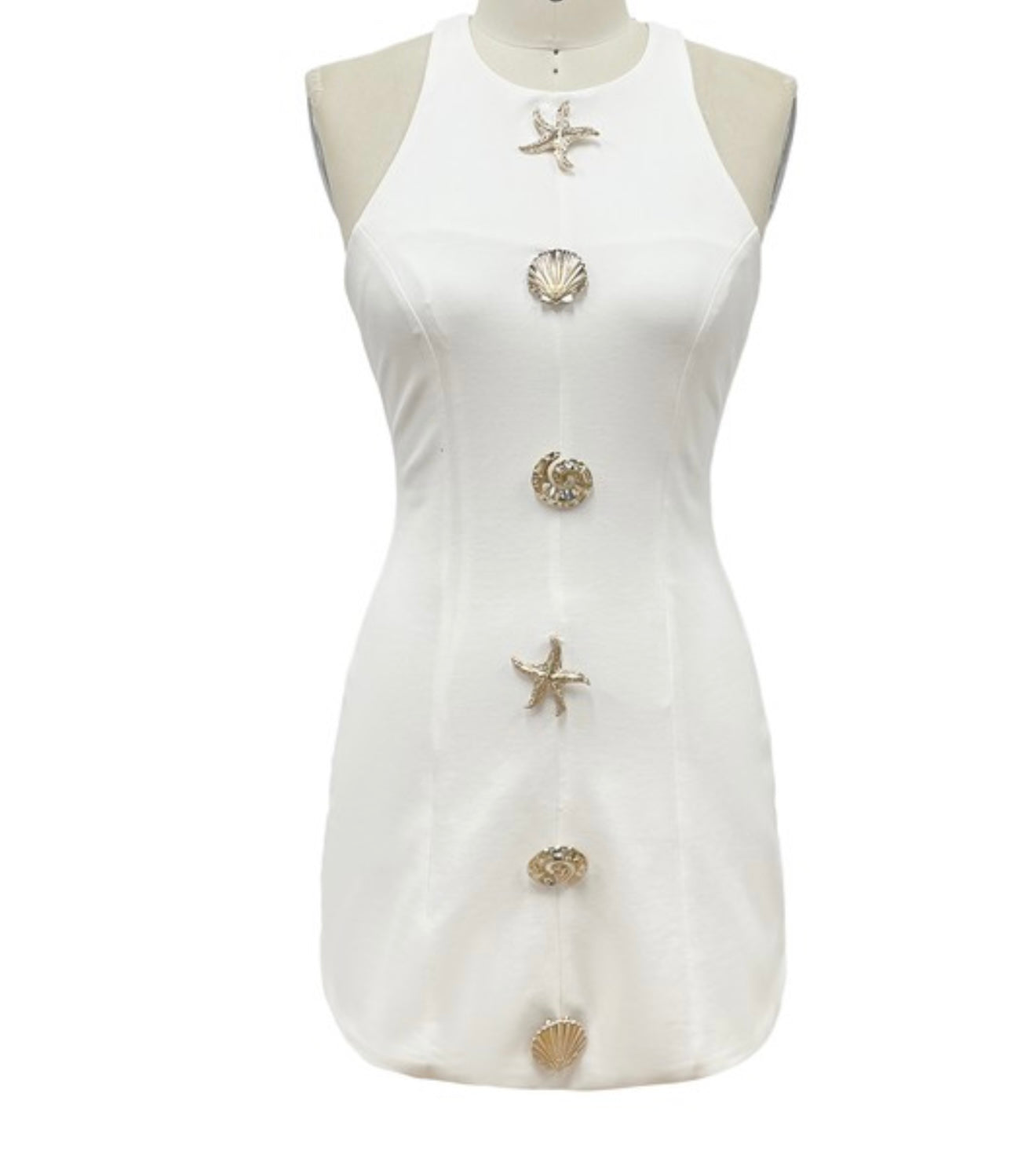 Gold-tone seashell and starfish embellishments down the front Mini length for a bold, modern silhouette Adds a playful ocean-inspired twist to your outfit Perfect for summer parties, vacation dinners, or coastal chic styling.