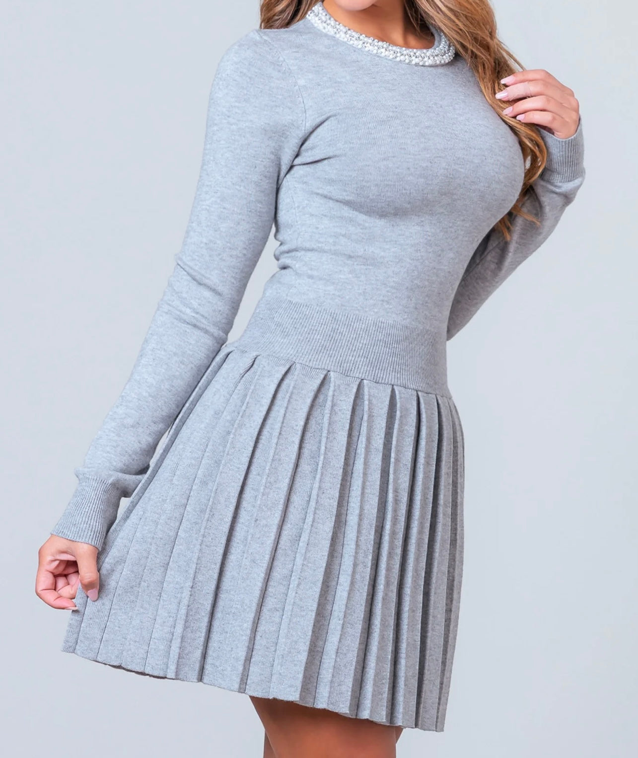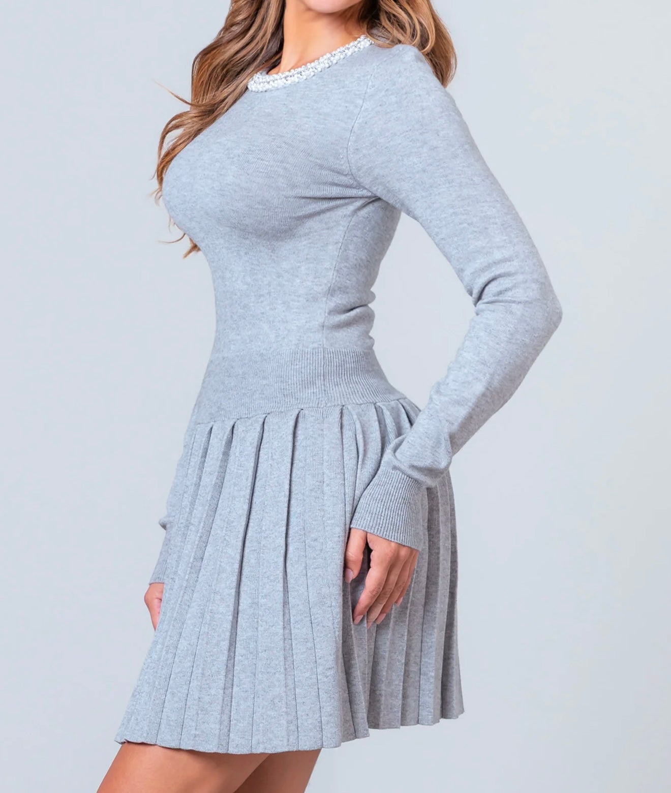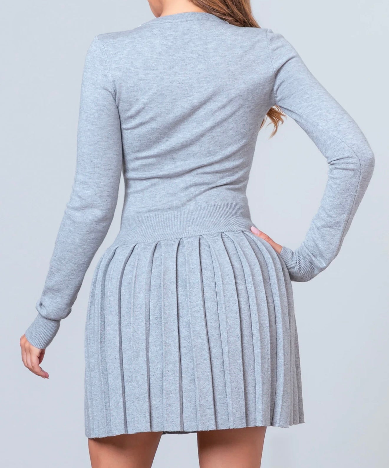 Elegant yet effortlessly chic, this pleated sweater dress is a timeless staple for the season. Designed with a flattering fit-and-flare silhouette, it features a cinched waist, long cuffed sleeves, and a classic round neckline. The soft knitted fabric offers structure without stretch, while the pleated mini skirt adds graceful movement. perfect for dressing up or keeping it cozy-chic.