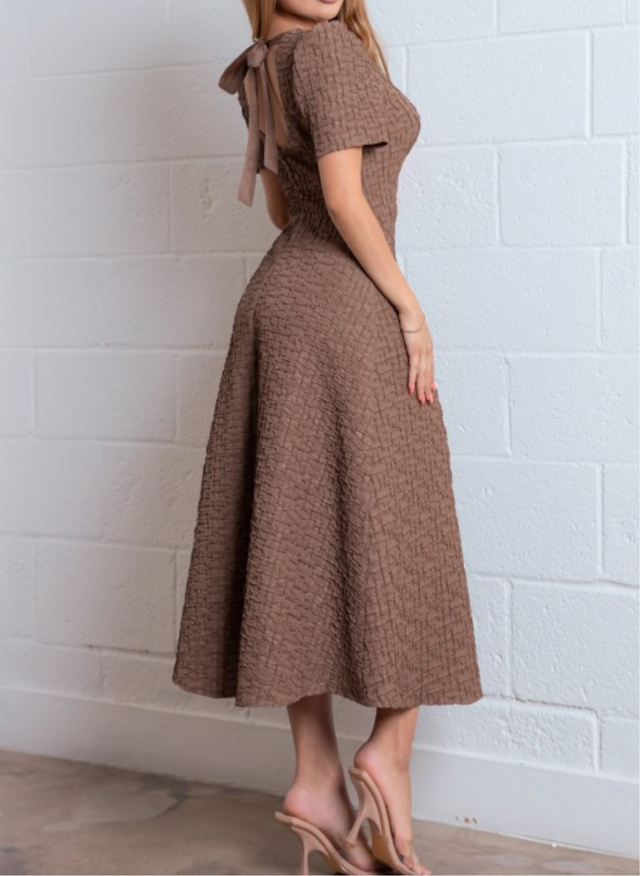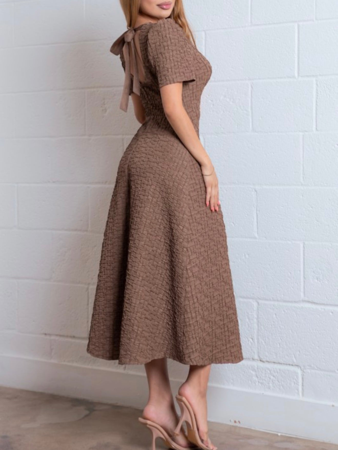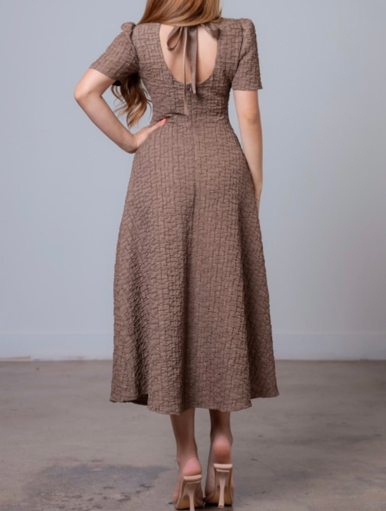 - Details: Back Bow Tie, Cinched Waist, Puff Sleeve, Midi, Jewel Rhinestones Neckline, Back Keyhole, Back Concealed Zipper, Lining.