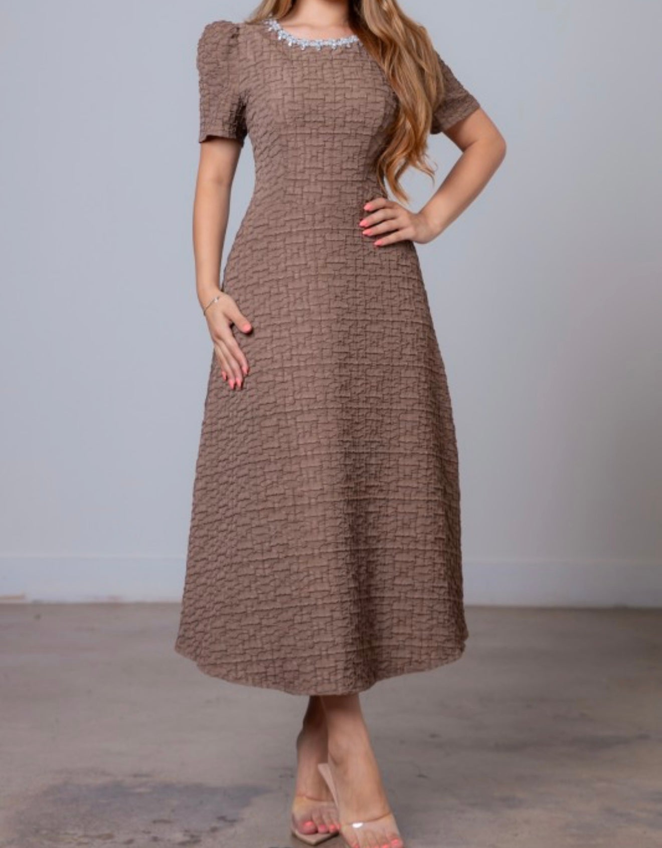 Rhinestone Neckline Midi Dress