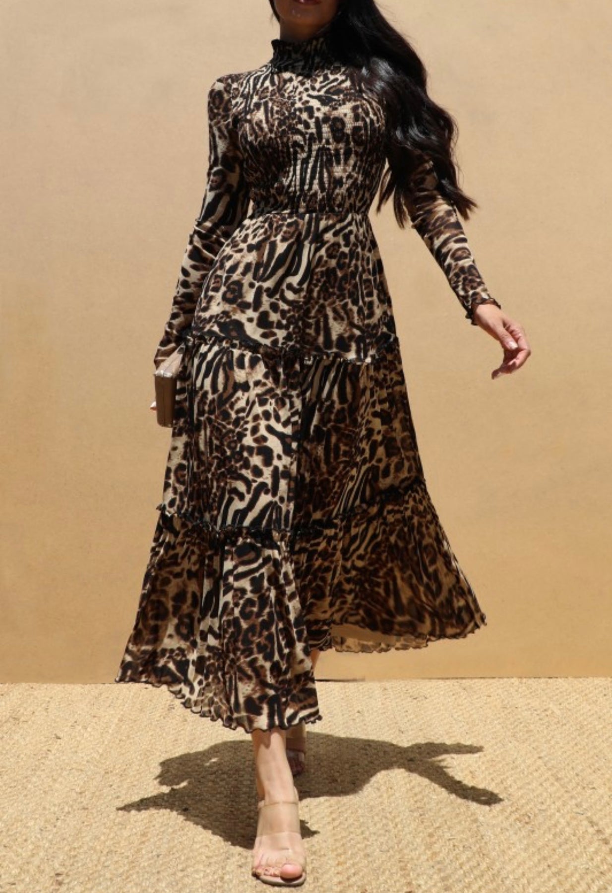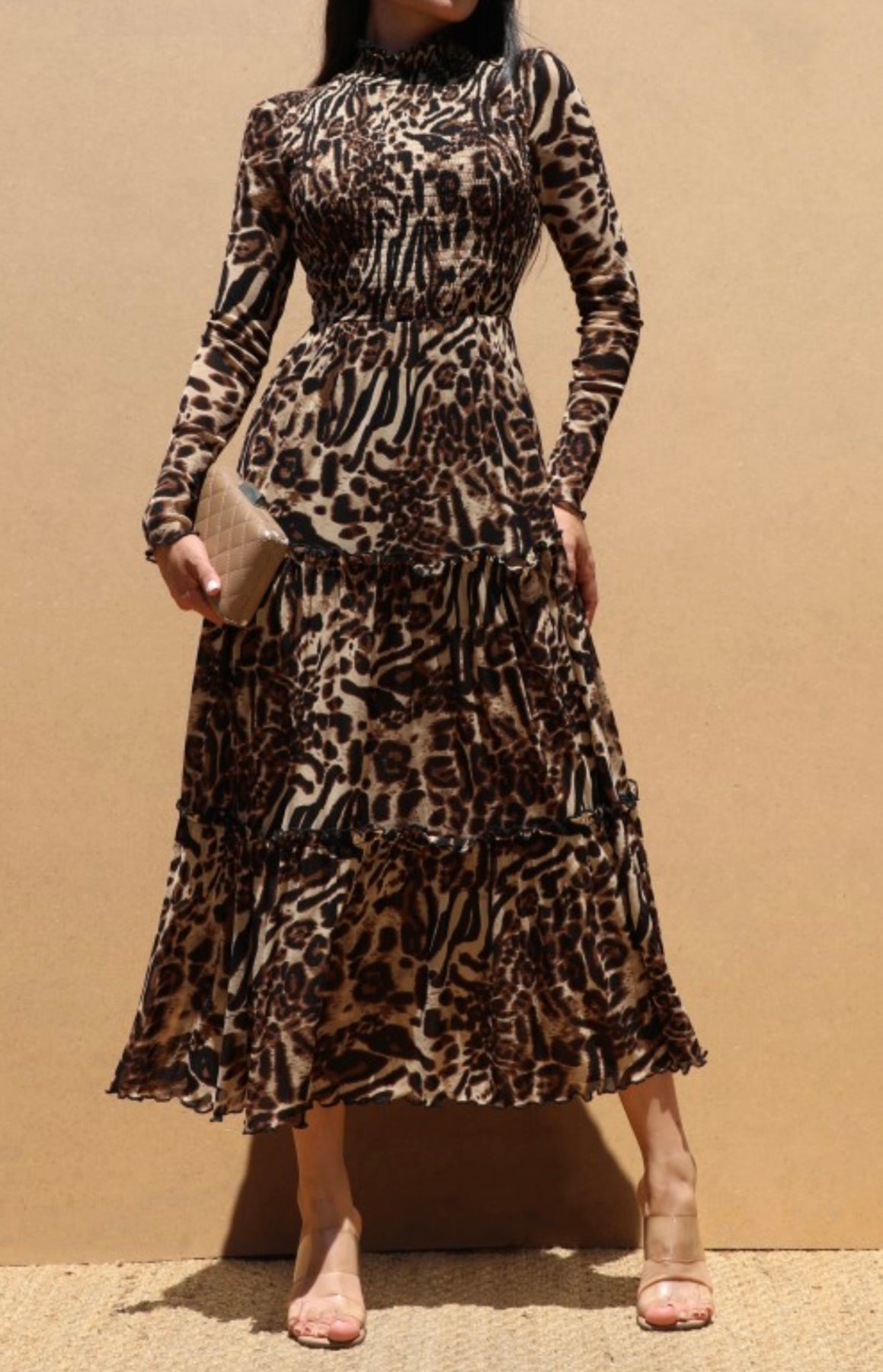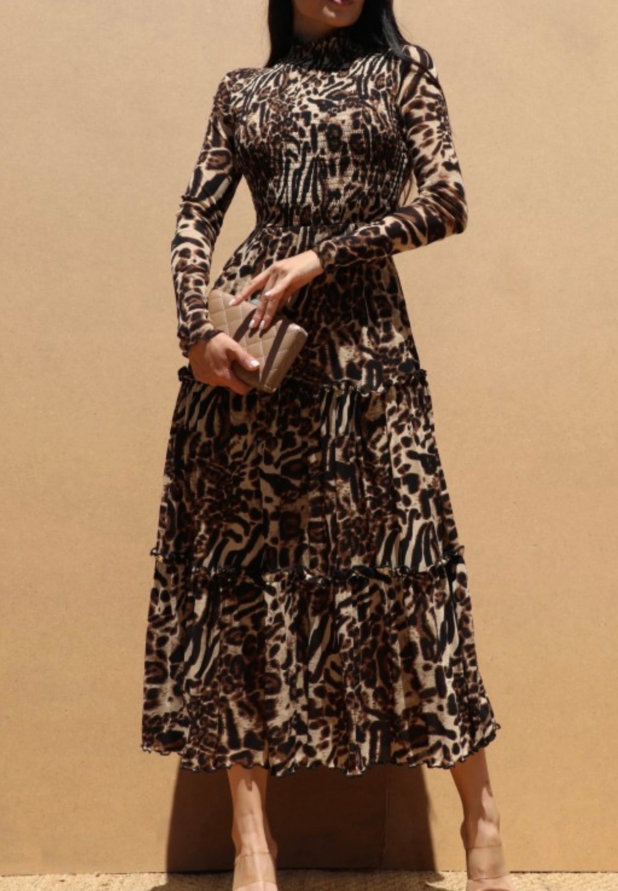 Turn heads in our Wild Elegance Midi Dress – a stunning blend of elegance and edge. Featuring a bold animal print in earthy tones, this flowy midi dress is designed with a smocked bodice, high neckline, and long sleeves for a flattering fit. The tiered ruffle skirt adds movement and effortless sophistication, perfect for day-to-night styling. Pair it with strappy heels for a chic evening look or boots for a fierce daytime vibe.