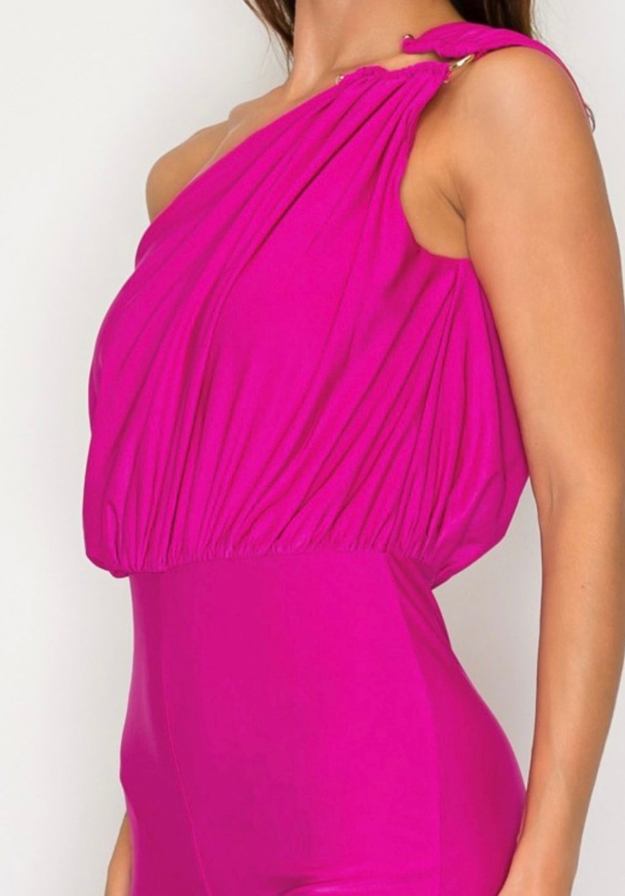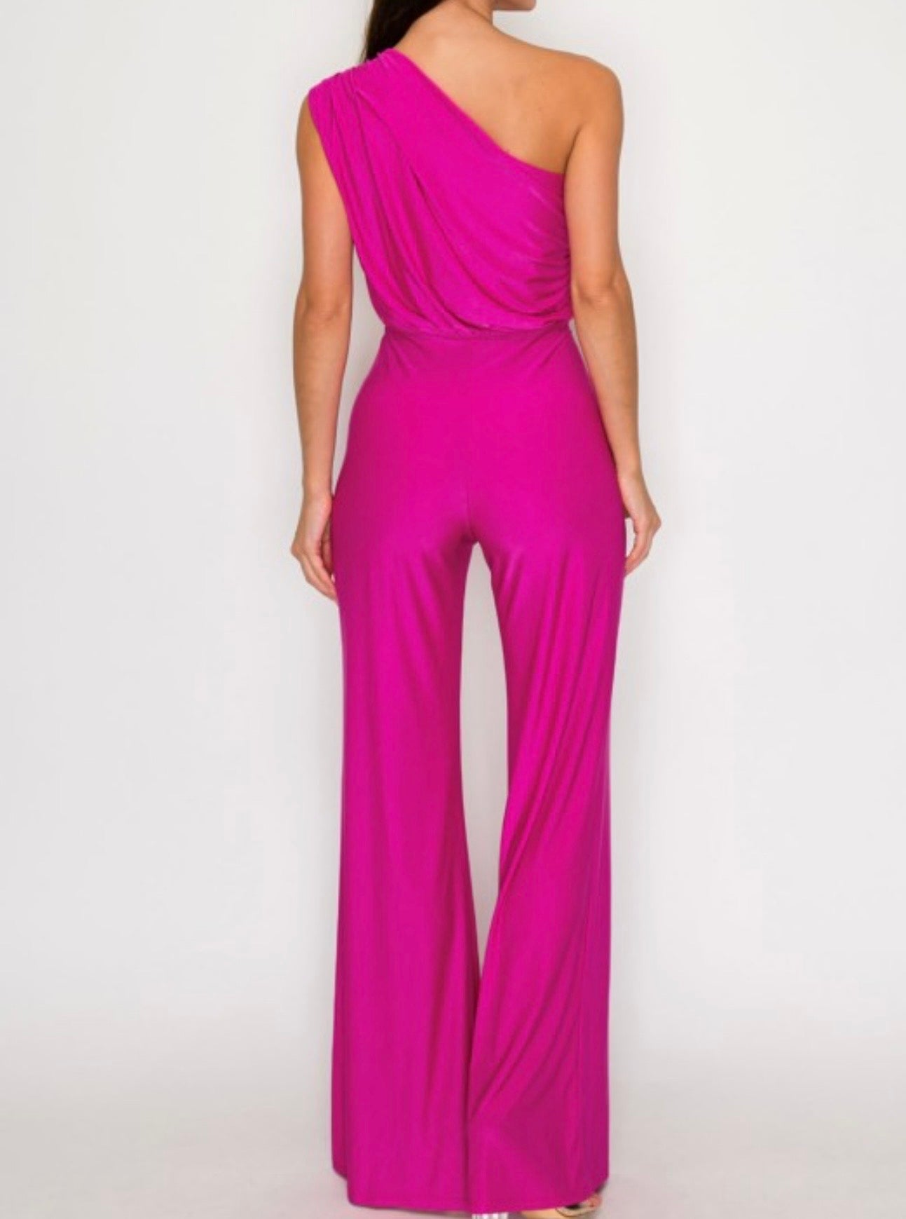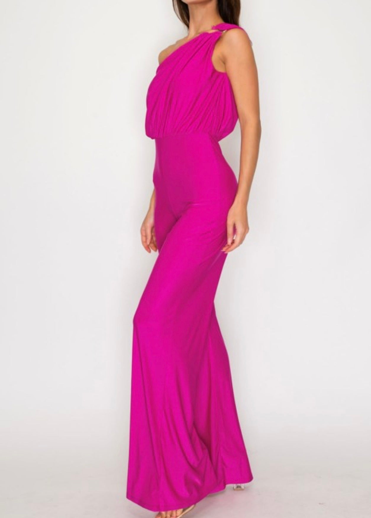 One-shoulder, high-waisted jumpsuit featuring a metal ring shoulder detail. Crafted from a soft, stretchable fabric with wide-leg pants for a flattering, comfortable fit.
