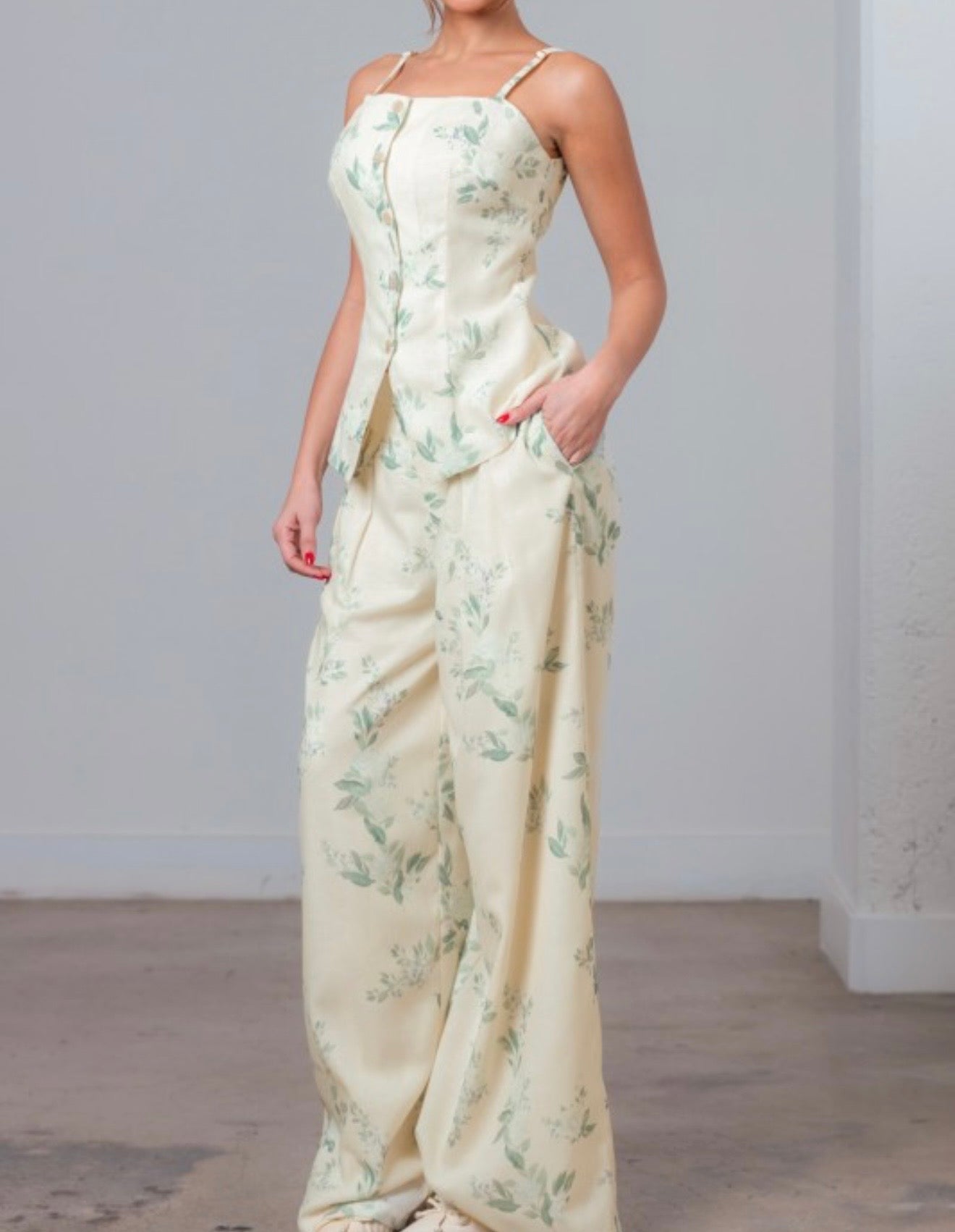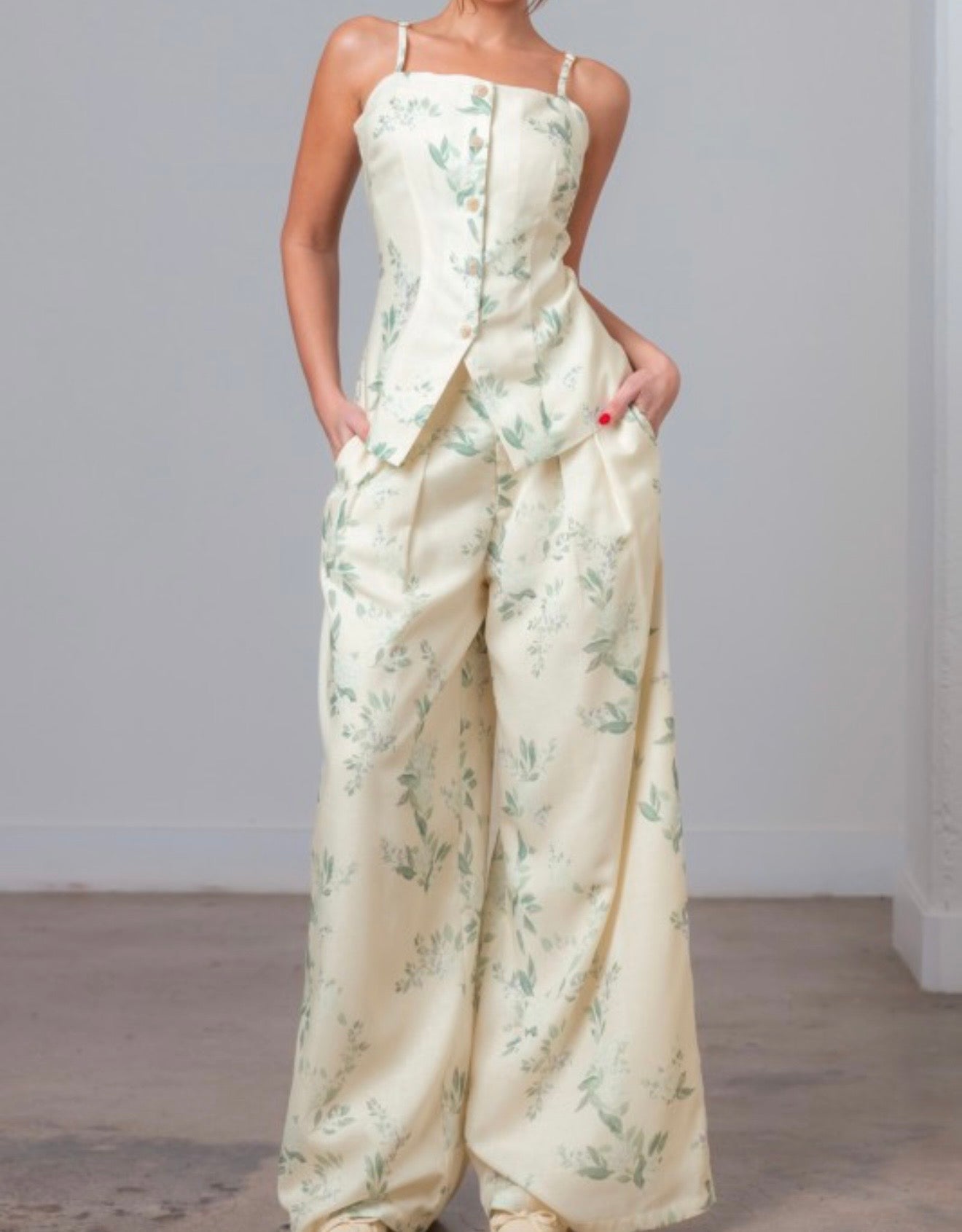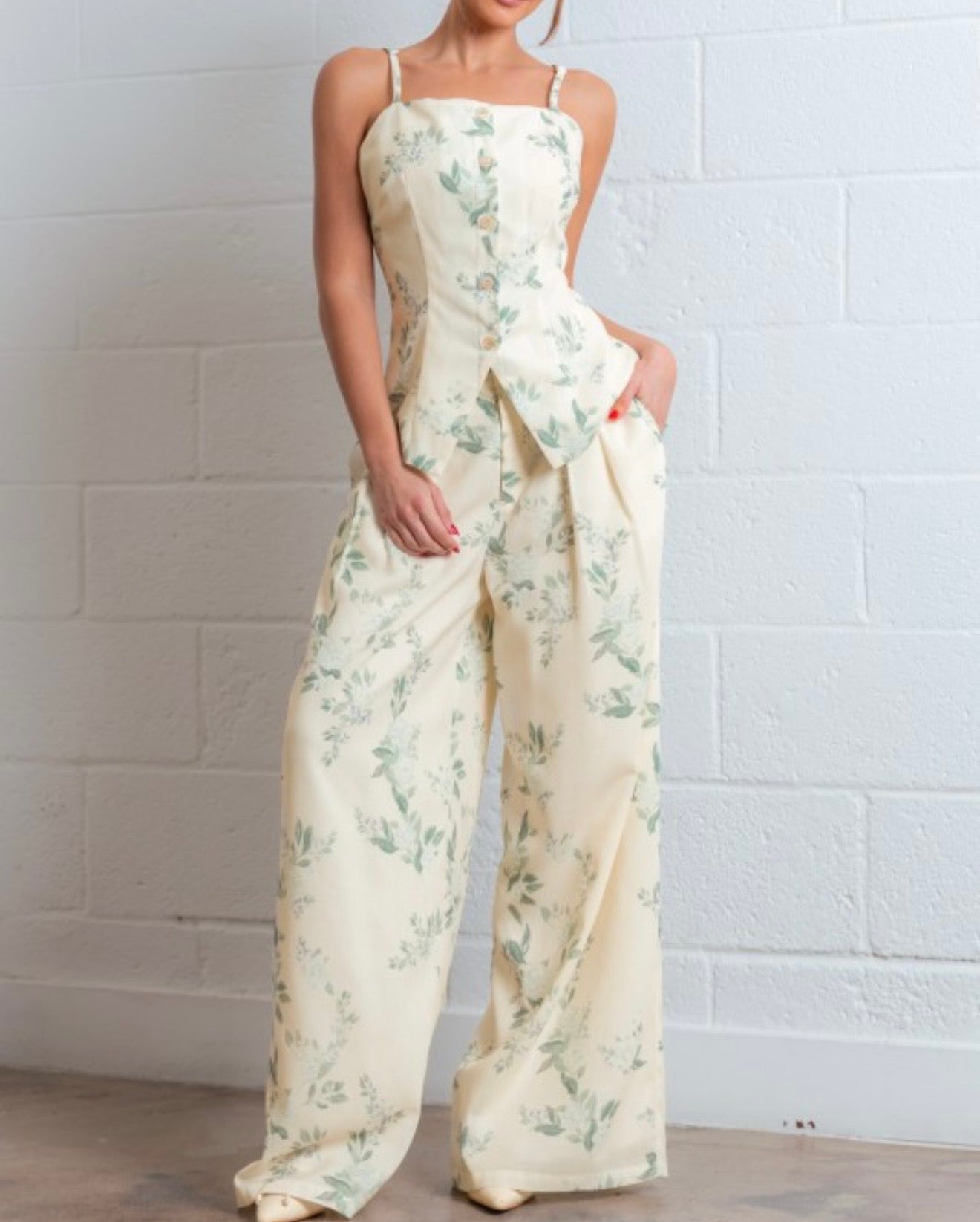 This ivory multi floral set features a flattering fit-and-flare silhouette with a square neckline and delicate spaghetti straps. Designed with a button-down front and zipper closure for easy wear, it includes adjustable straps, a lined finish, and a back elastic waist for added comfort. Sleeveless and lightweight, this no-stretch set is perfect for an effortlessly chic look.