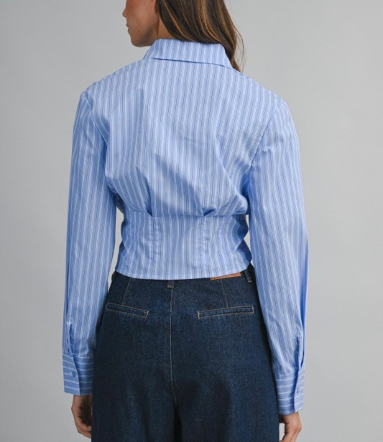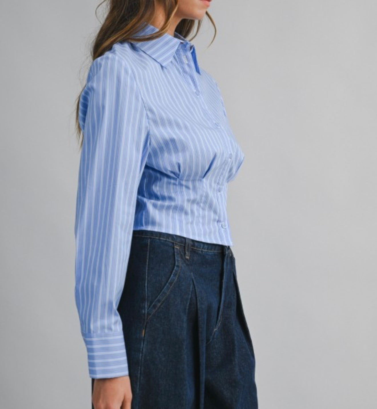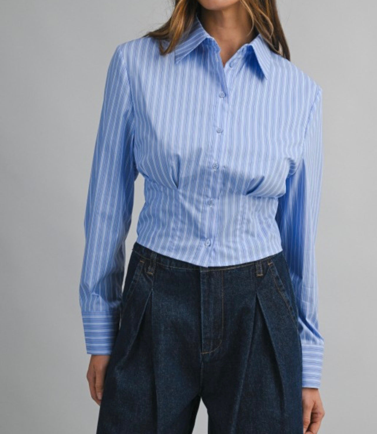 Cotton-blend shirt designed with a subtle vertical stripe pattern throughout. Features a classic pointed collar, full button-front closure, and long sleeves with buttoned cuffs. The fitted body is shaped with seam detailing at the waist for a clean, structured fit.