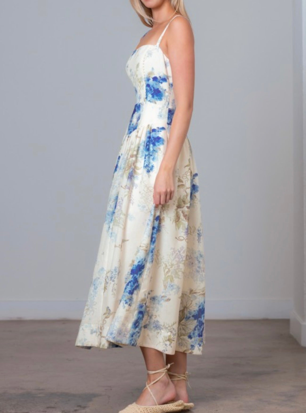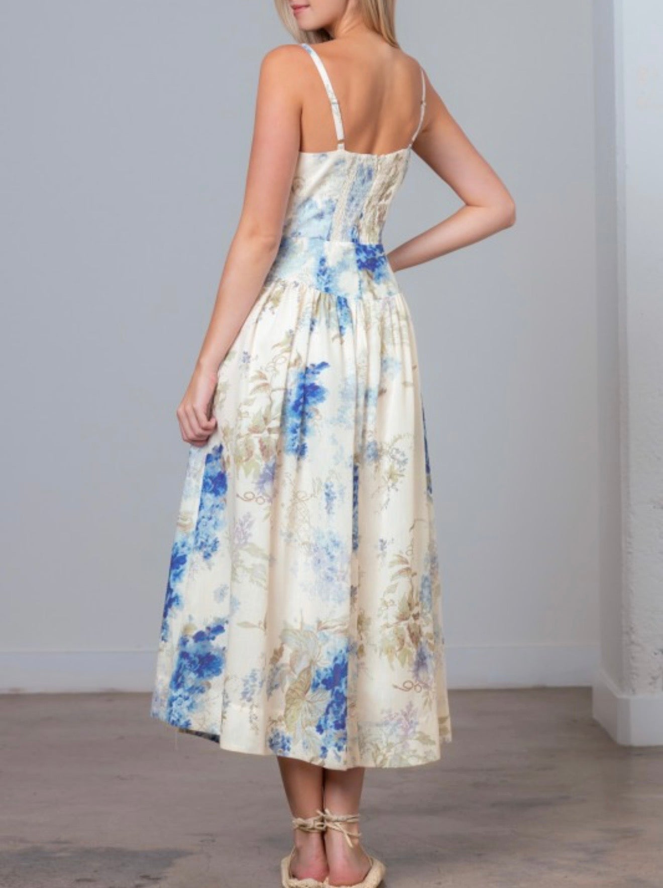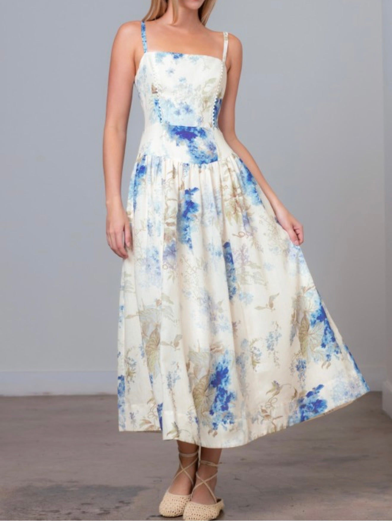 This off-white multi floral midi dress is crafted from a soft, lightweight fabric that feels as beautiful as it looks. Designed with a charming floral print throughout, it features adjustable spaghetti straps and a flattering squared neckline for a feminine touch. The back smocking with elastic and zipper closure ensures both comfort and an easy fit, while the sleeveless, relaxed silhouette drapes effortlessly for a breezy, graceful look.