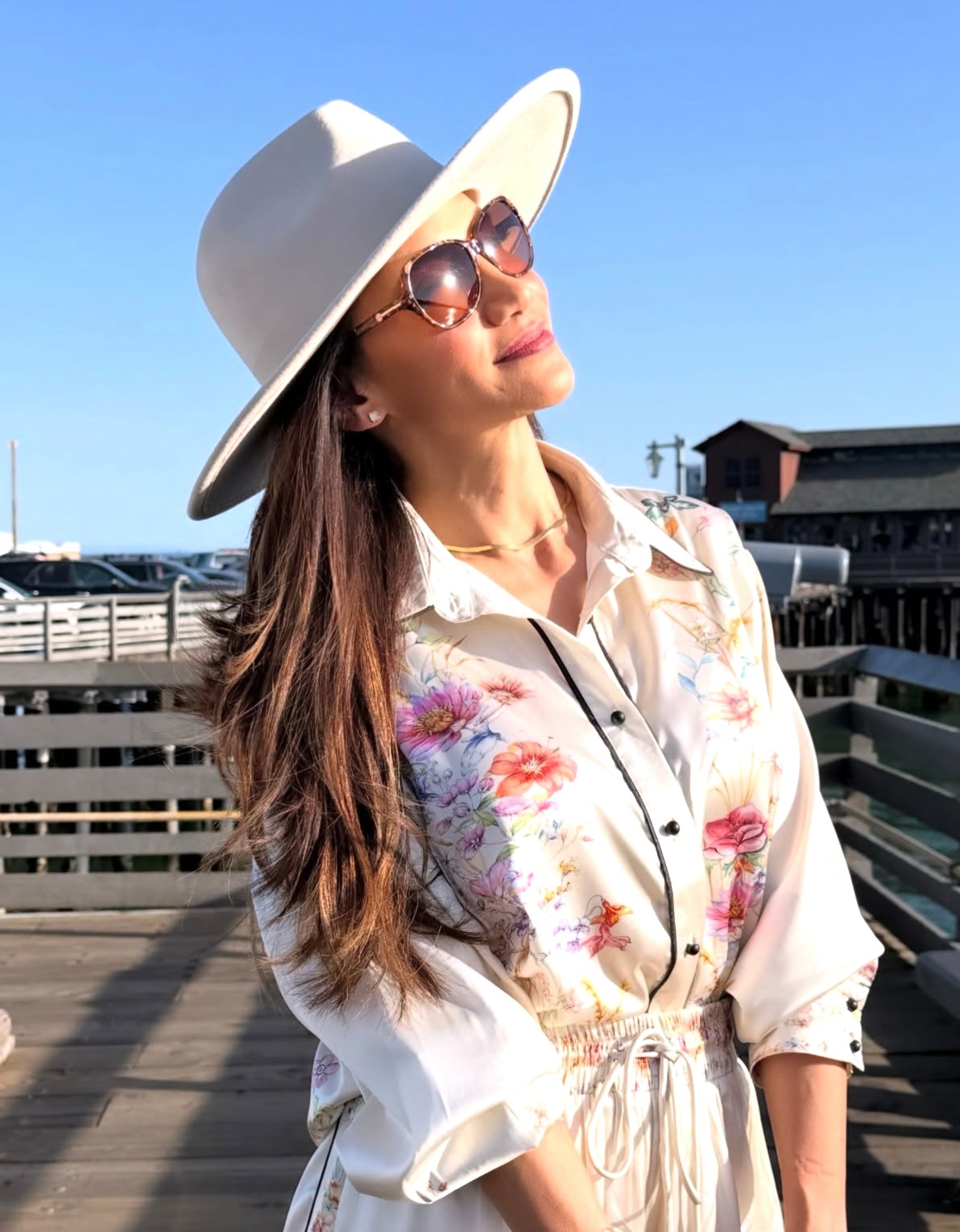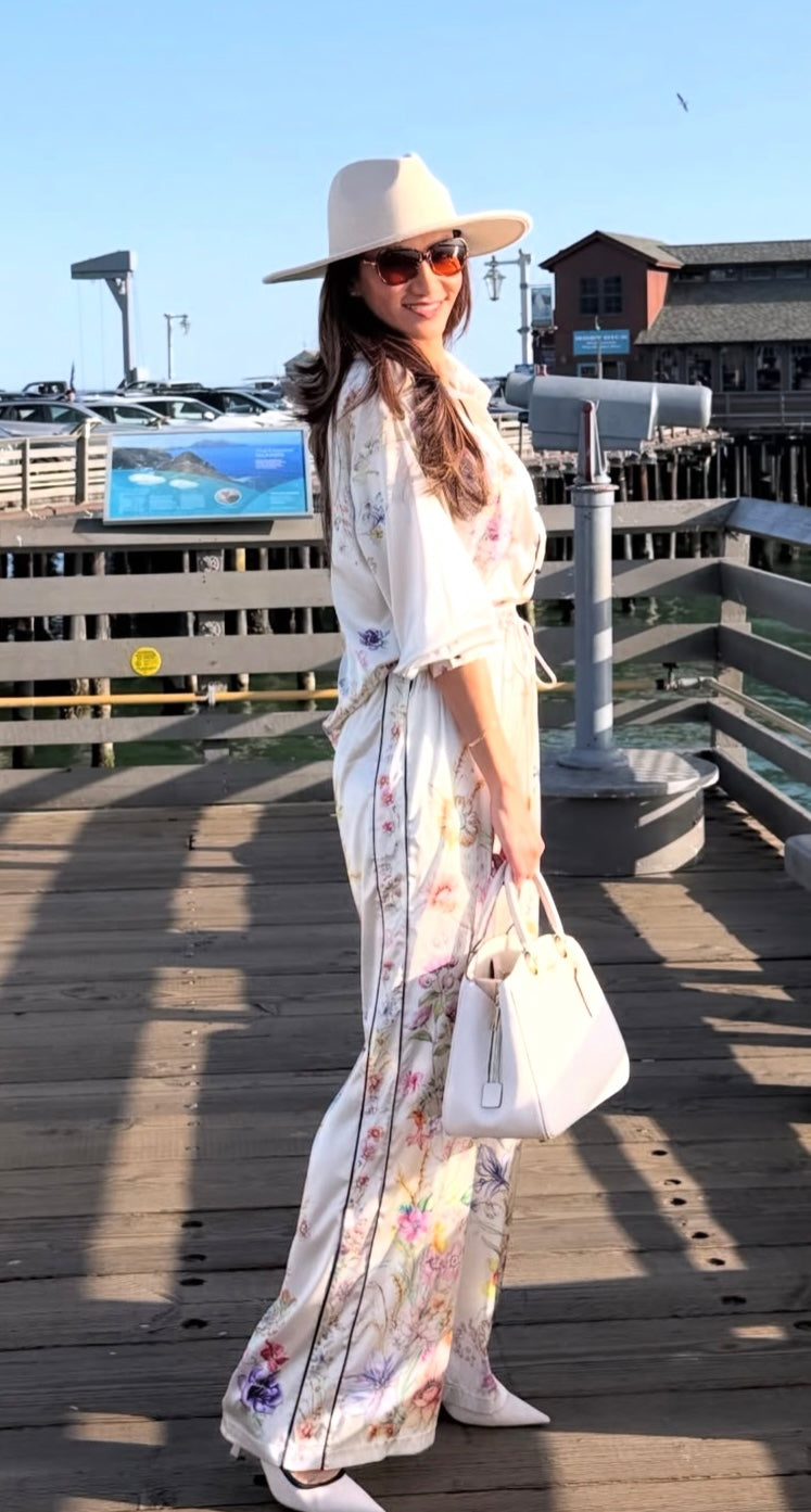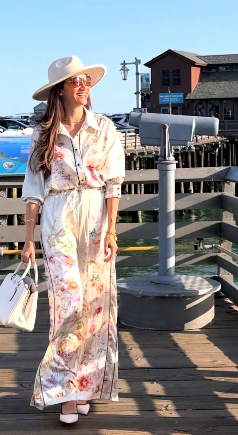 A cream two-piece pant set featuring a soft floral print in pastel tones. The top is a button-down blouse with a classic collar and rolled long sleeves, giving it a polished yet effortless feel. It’s paired with high-waisted, wide-leg pants with an adjustable drawstring waist, creating a comfortable and flattering silhouette. The flowy fabric adds movement and sophistication, making it perfect for warm days or vacation looks. Styled with white pointed heels, a structured white handbag, oversized sunglasses, and a wide-brim hat for a chic, elevated finish.
