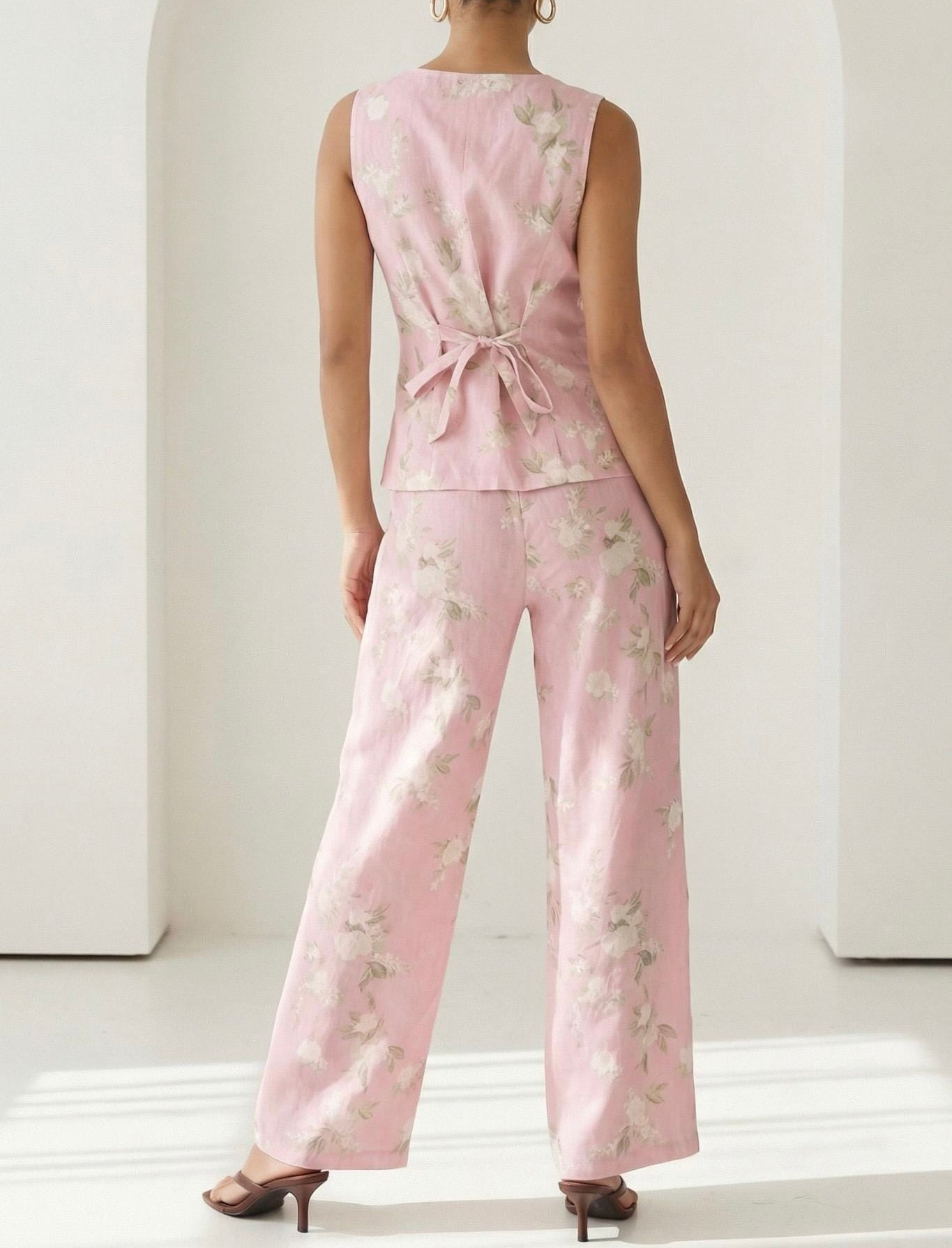 A polished statement ensemble featuring a sleeveless structured vest with gold button detailing and a softly contoured silhouette, paired with wide-leg trousers in a delicate blush floral print. This modern feminine set blends tailored elegance with romantic charm, making it perfect for brunch events, daytime celebrations, or elevated resort styling.