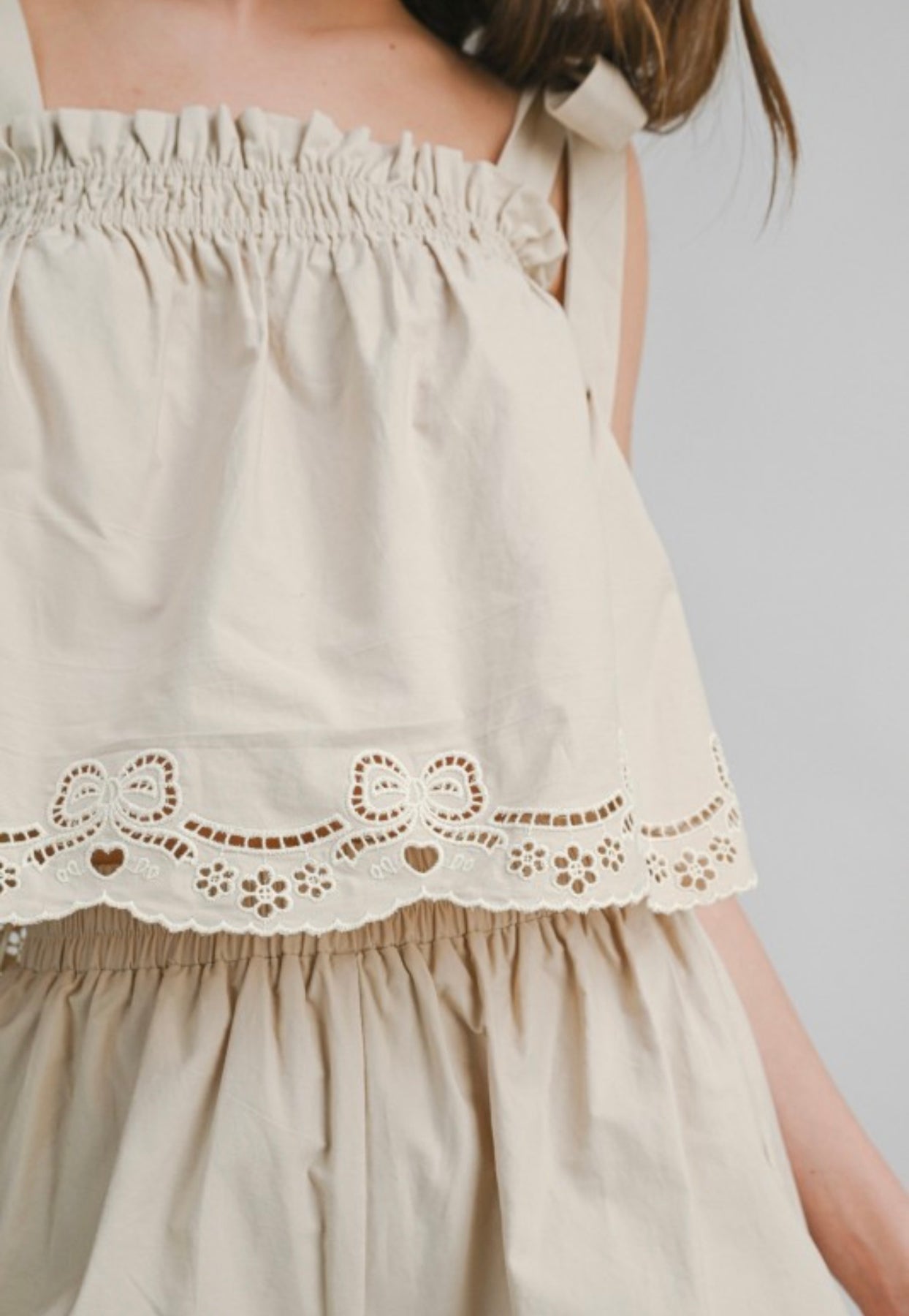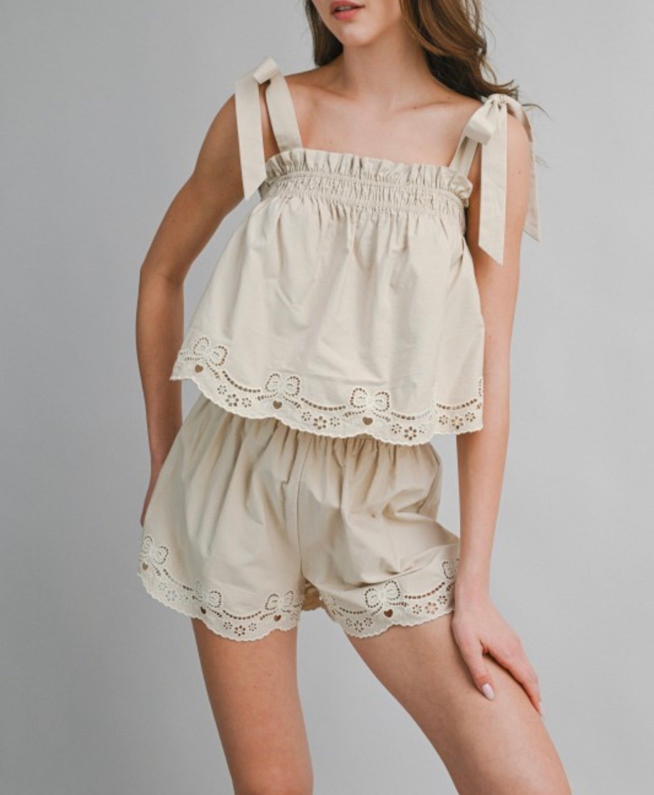 Two-piece woven set designed with a solid finish. The sleeveless top features adjustable shoulder tie straps and a gathered elastic neckline. Finished with eyelet embroidery and a scalloped hem.