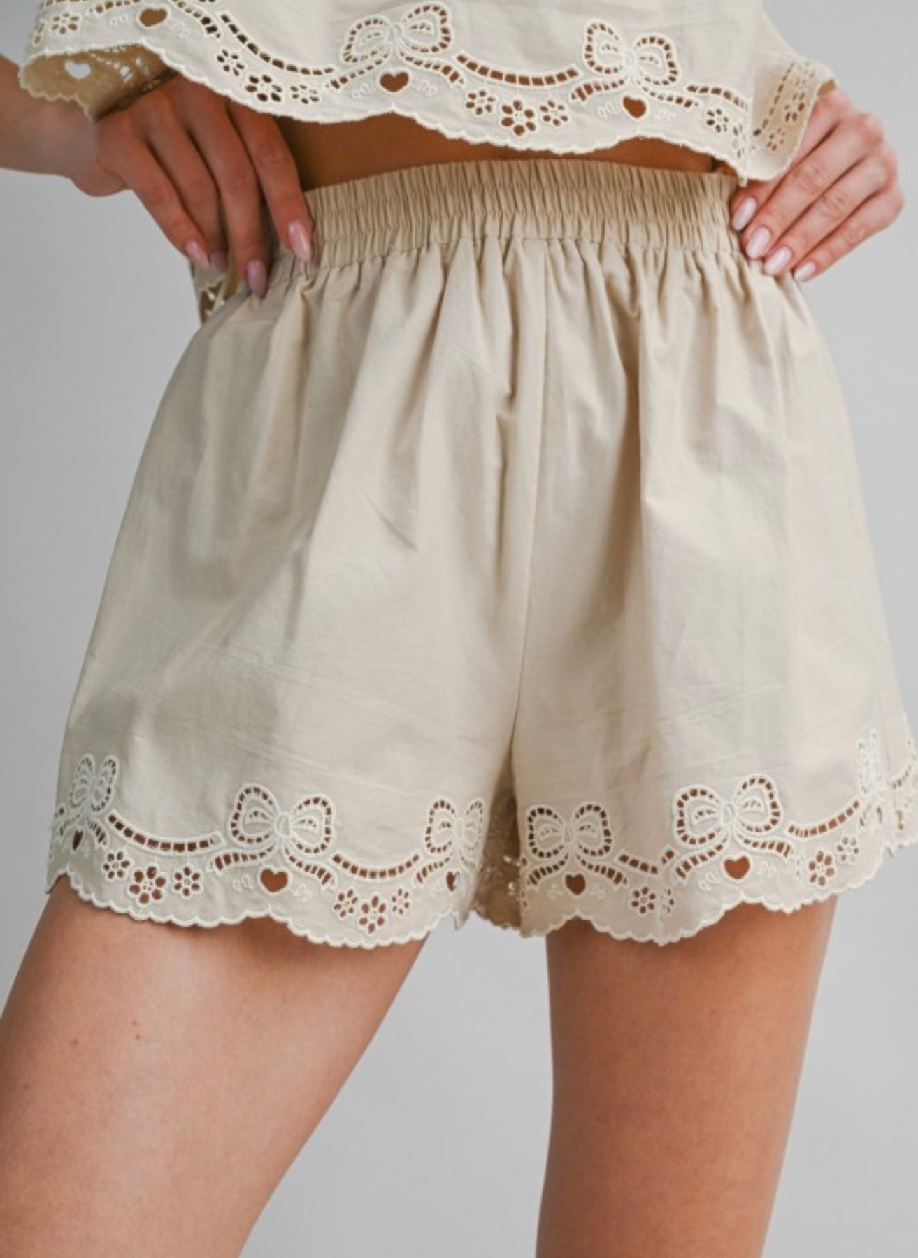 The matching shorts are designed with an elastic waistband and finished with matching eyelet scalloped hem.