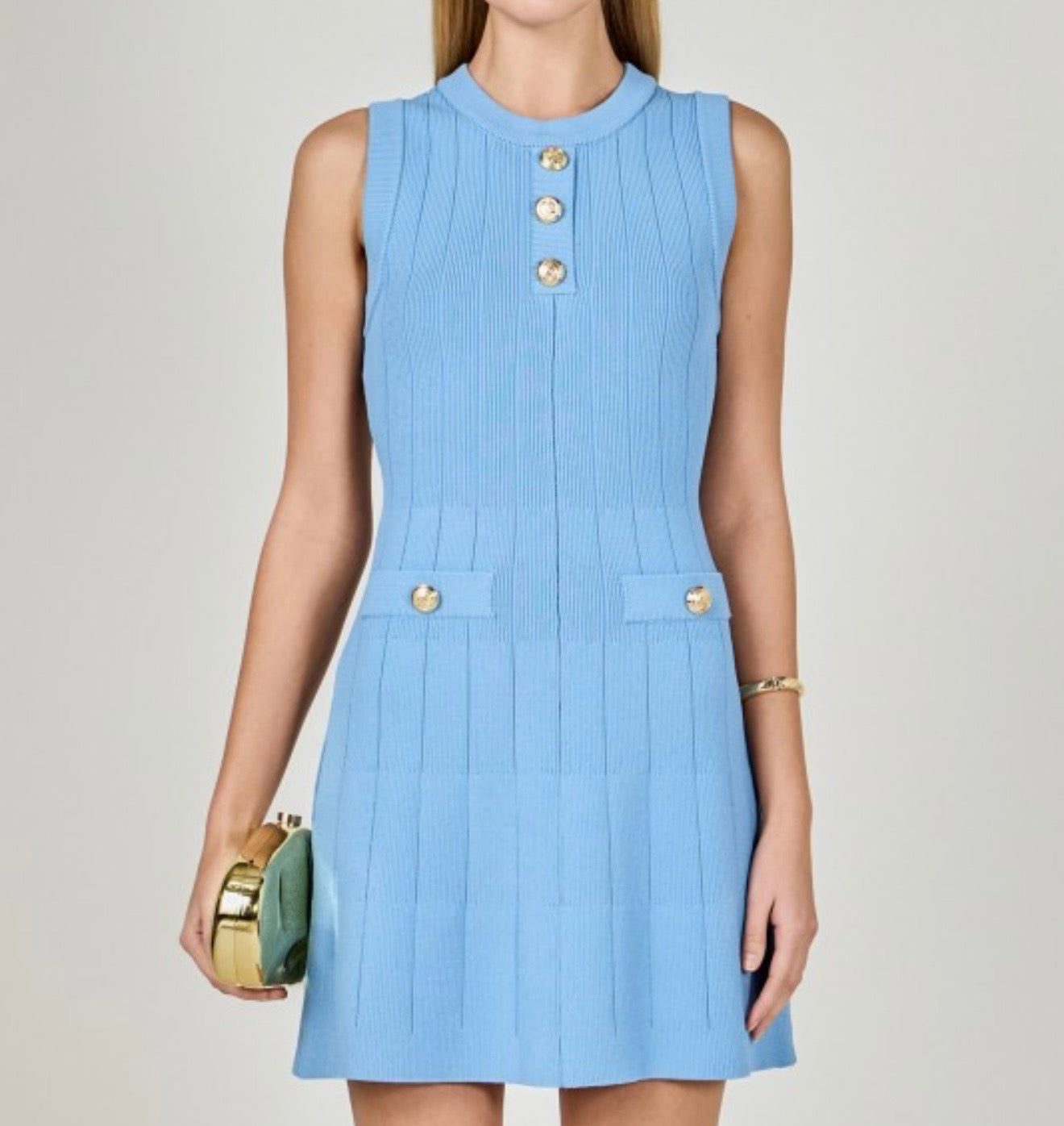 A polished blend of classic tailoring and modern charm, this sleeveless knit mini dress features a refined ribbed texture that contours the body while maintaining structure. Designed with a high neckline and statement gold-tone buttons along the front placket and pockets, it delivers a sophisticated yet effortless look. The fitted waist flows into a subtle A-line silhouette, creating a flattering shape perfect for brunch dates, office styling, or elevated everyday wear.