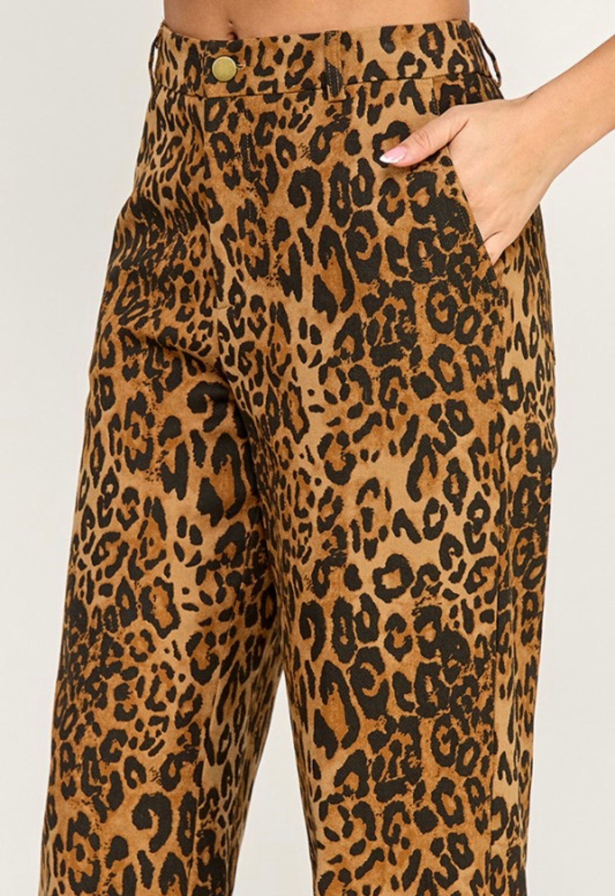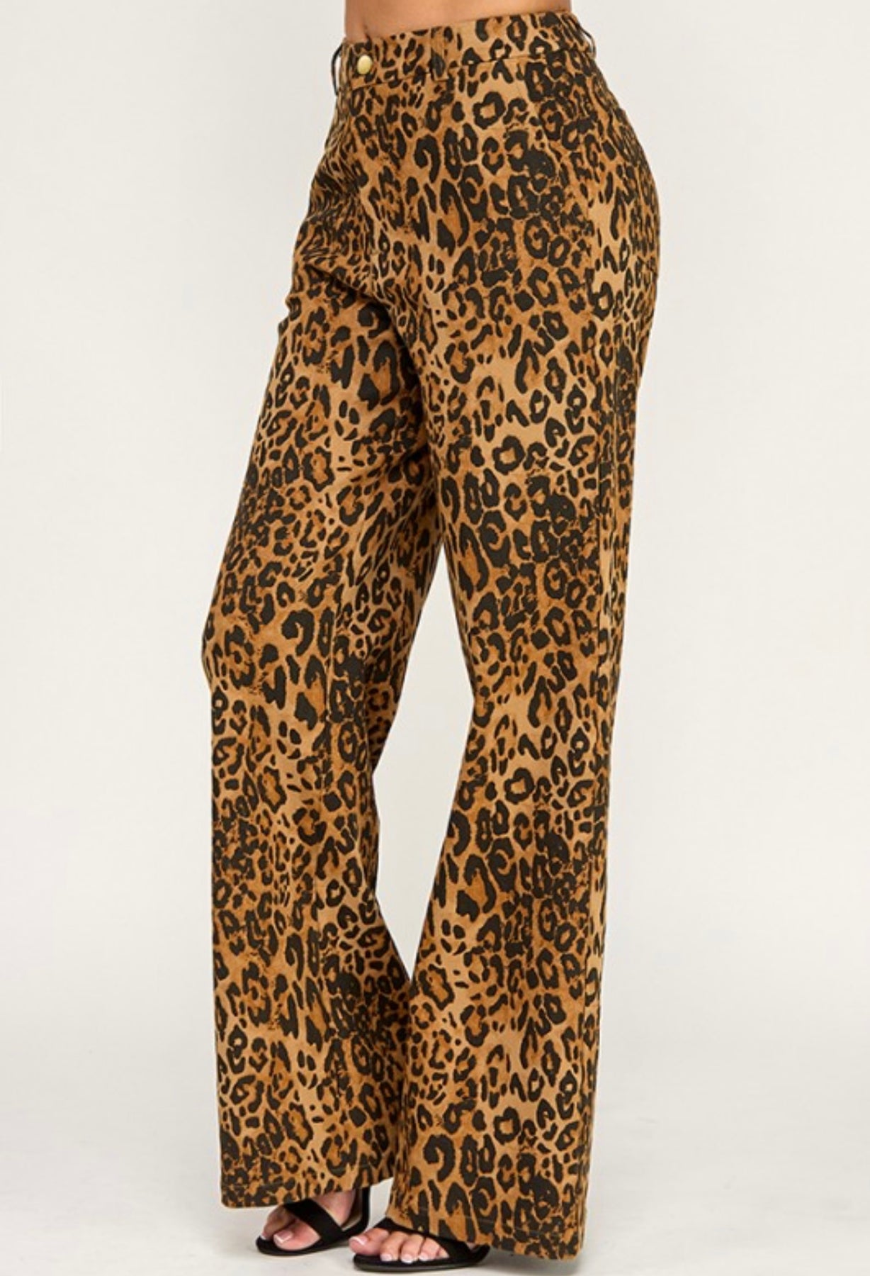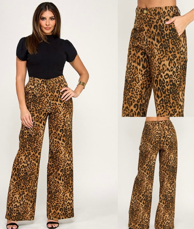 Elevate your style with these chic leopard print wide-leg denim pants. Perfect for any occasion, these pants offer a bold and fashionable look.