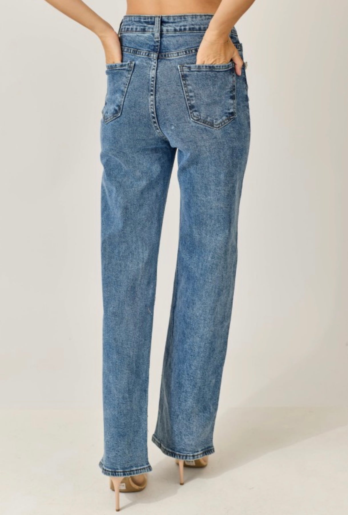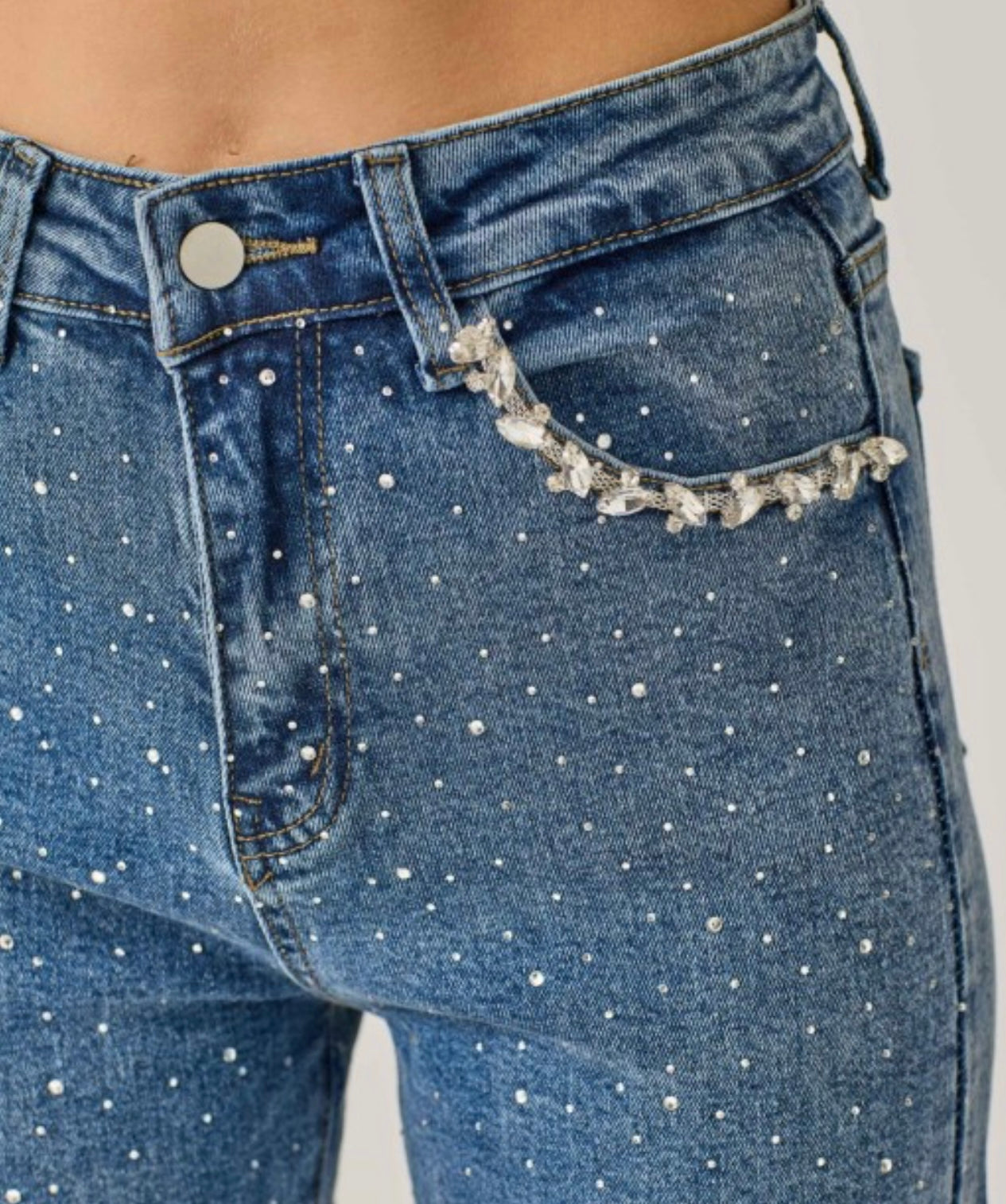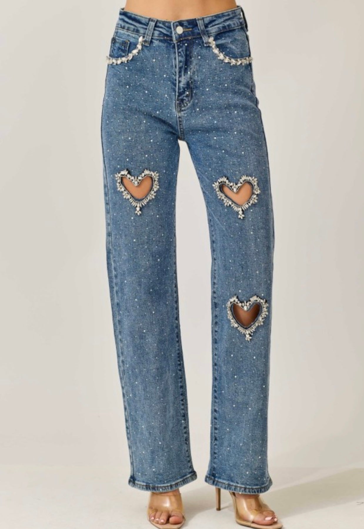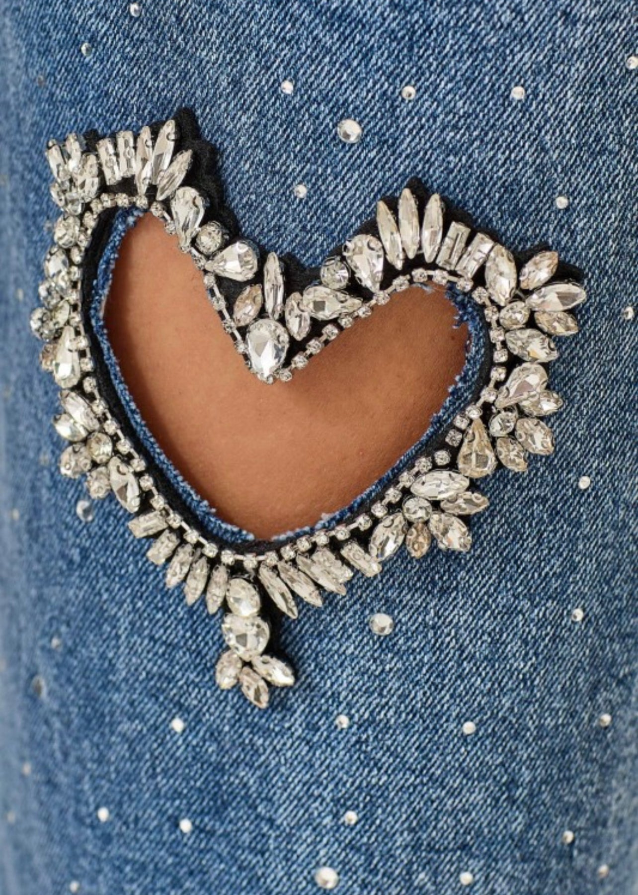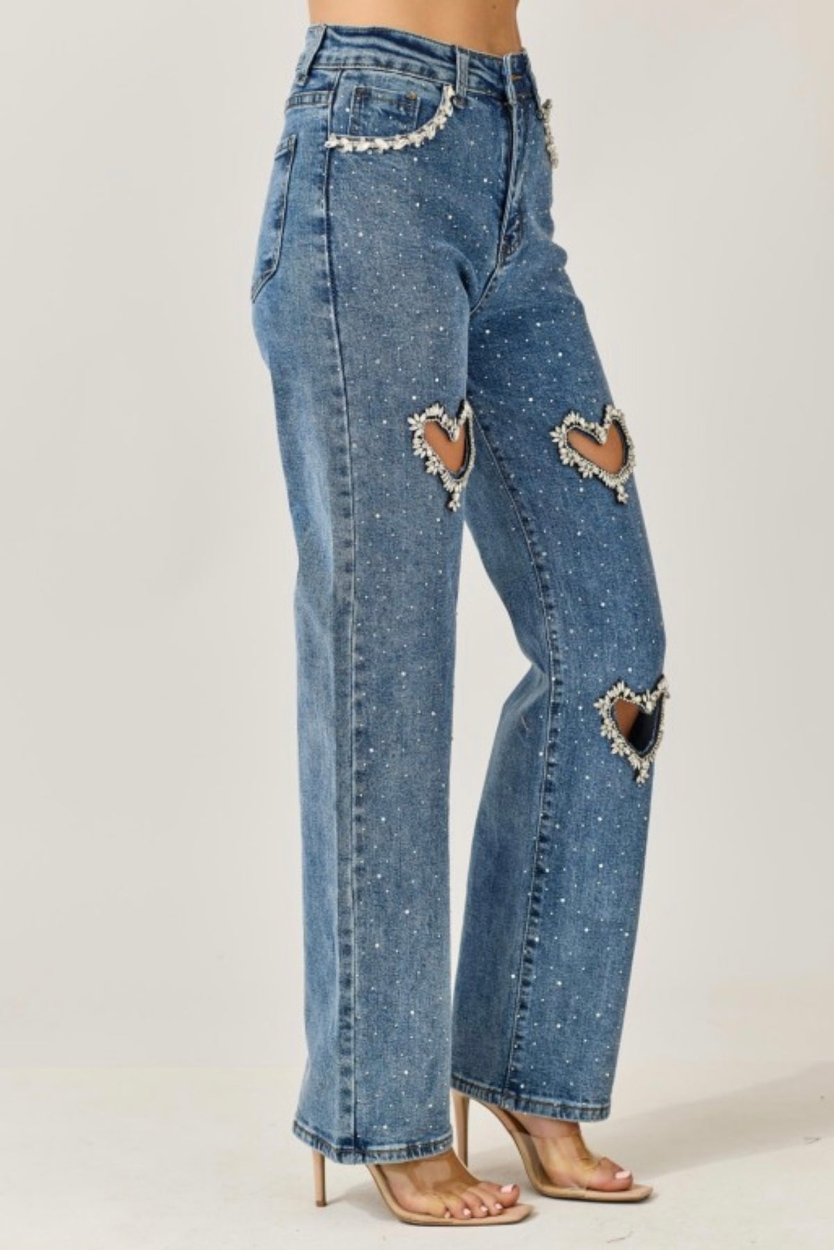 Stretch denim With Rhinestone-embellished heart cutouts/pocket seams. Hotfix embellishment throughout. Light wash high-rise / Straight leg. Zip fly and button closure. Classic 5-pocket.