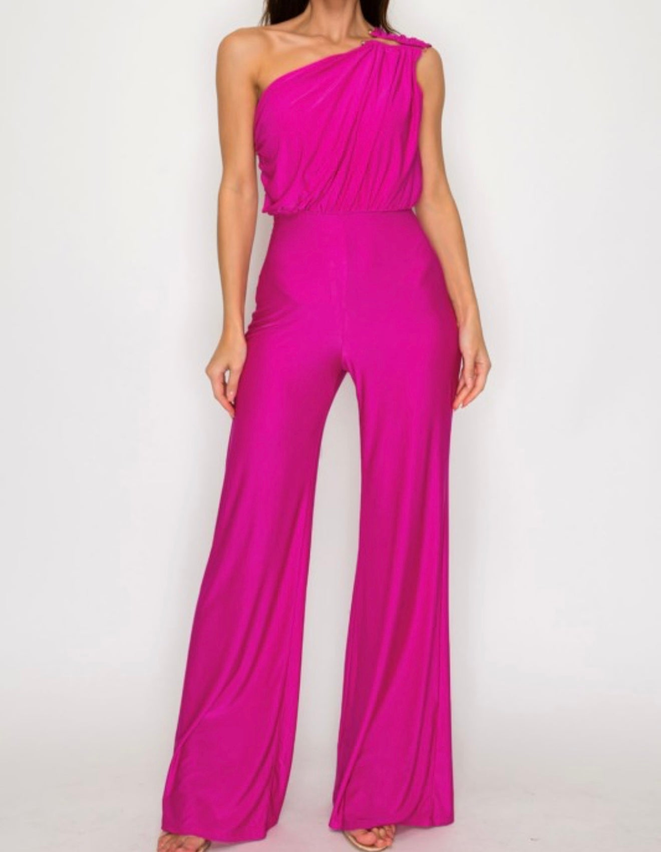 One-shoulder, high-waisted jumpsuit featuring a metal ring shoulder detail. Crafted from a soft, stretchable fabric with wide-leg pants for a flattering, comfortable fit.