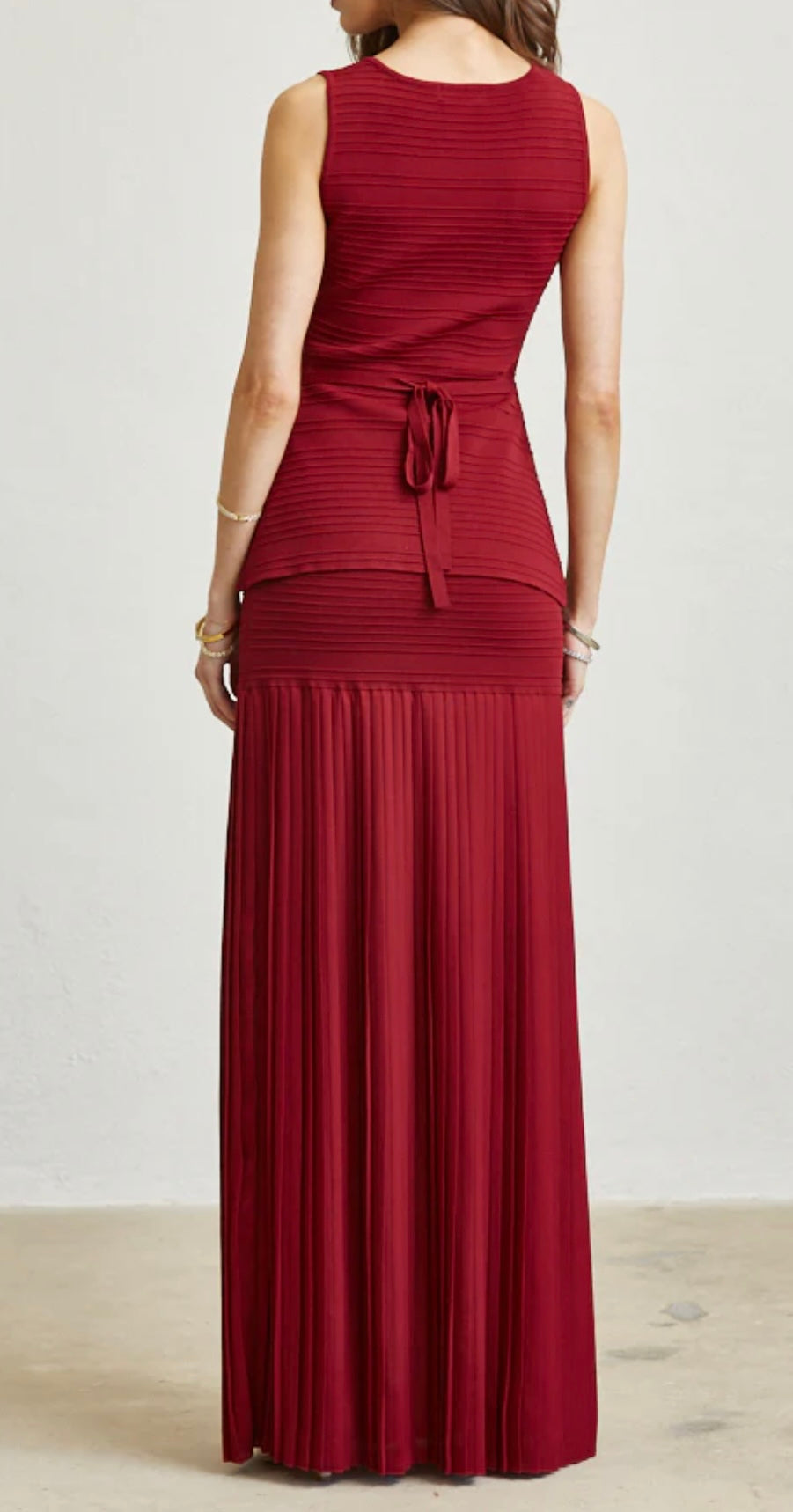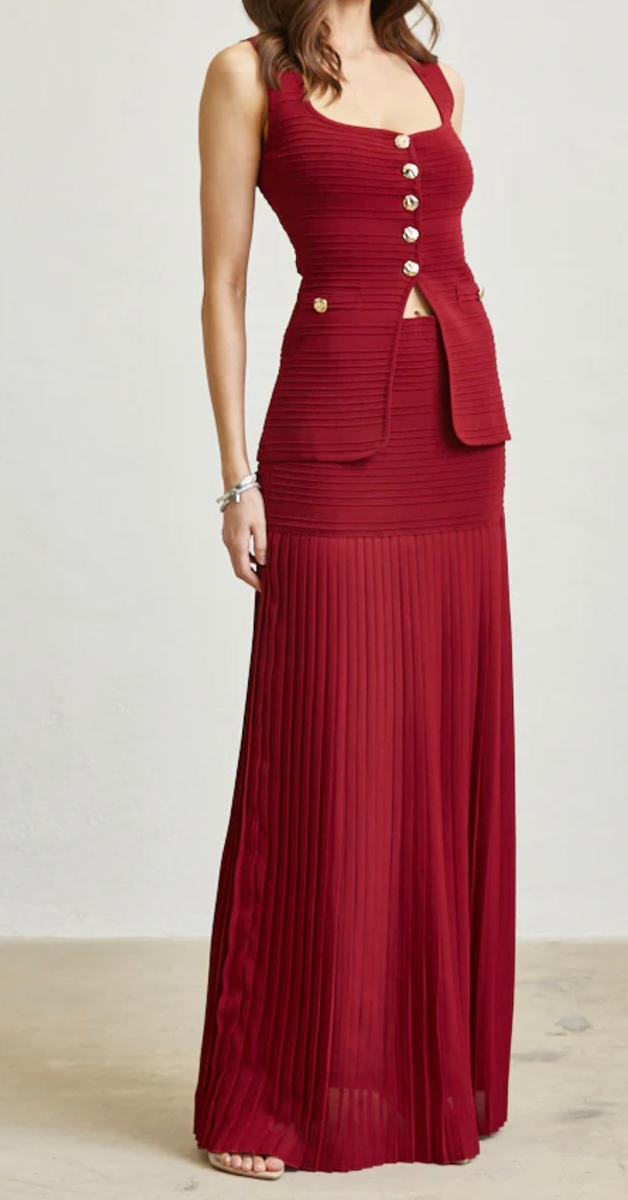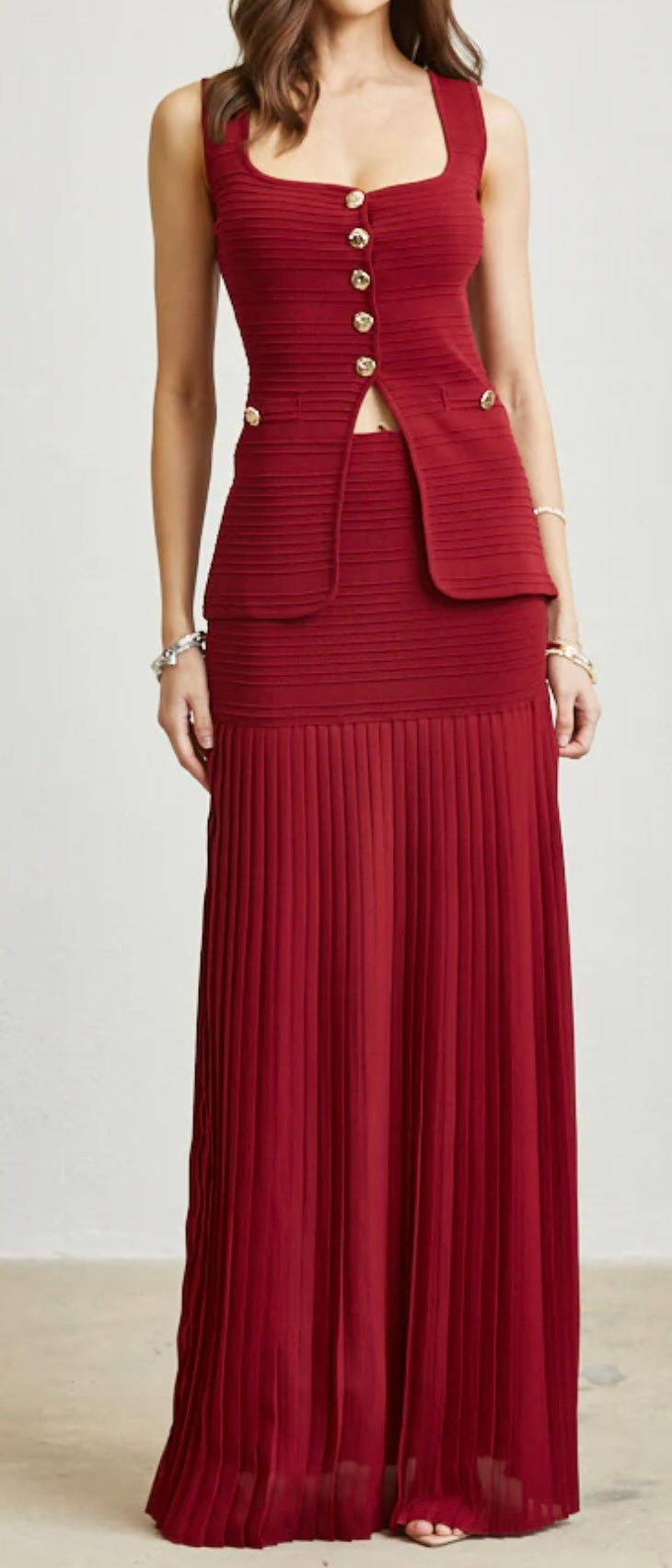 Ribbed bandage knit top and skirt set, accented with statement gold buttons. The top features a partial button-up front with a chic tie-back detail, while the skirt flows into a chiffon pleated maxi silhouette. Finished with a side zipper closure for a seamless fit.