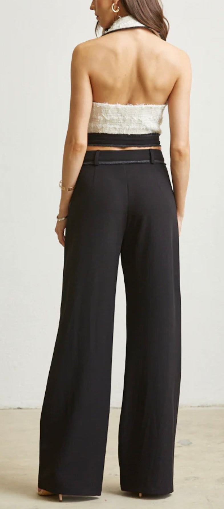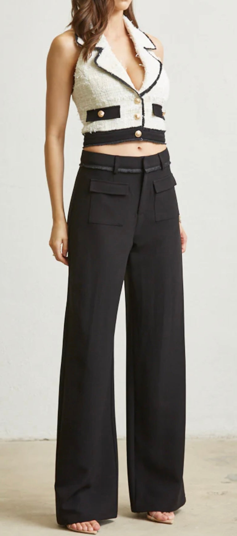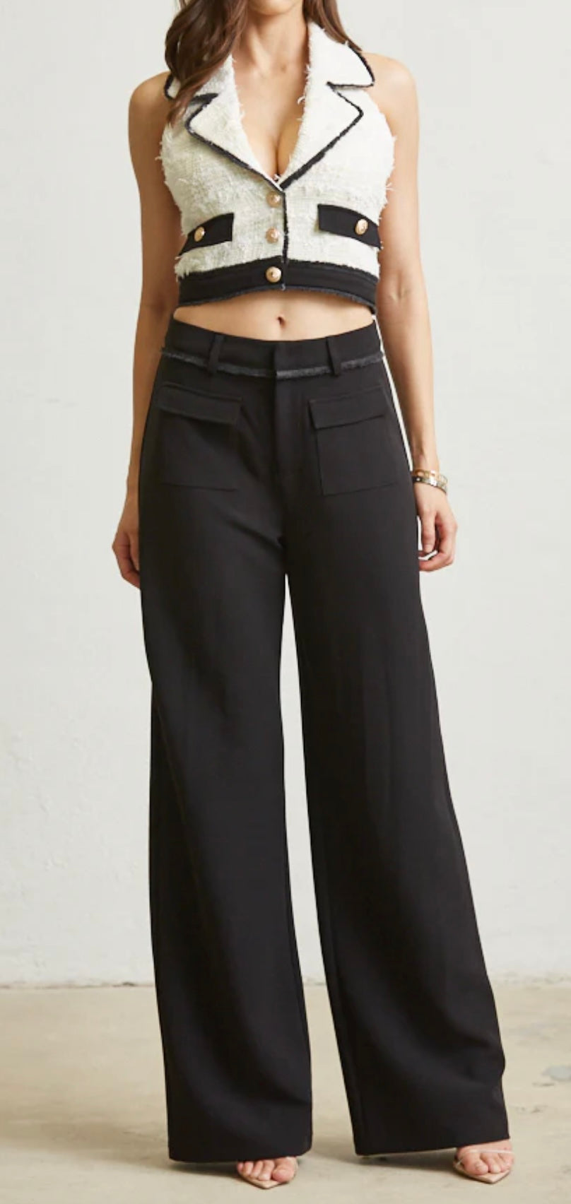 woven tweed halter vest top with frayed detail. Button front and pocket detail. High waisted, wide leg pants set.