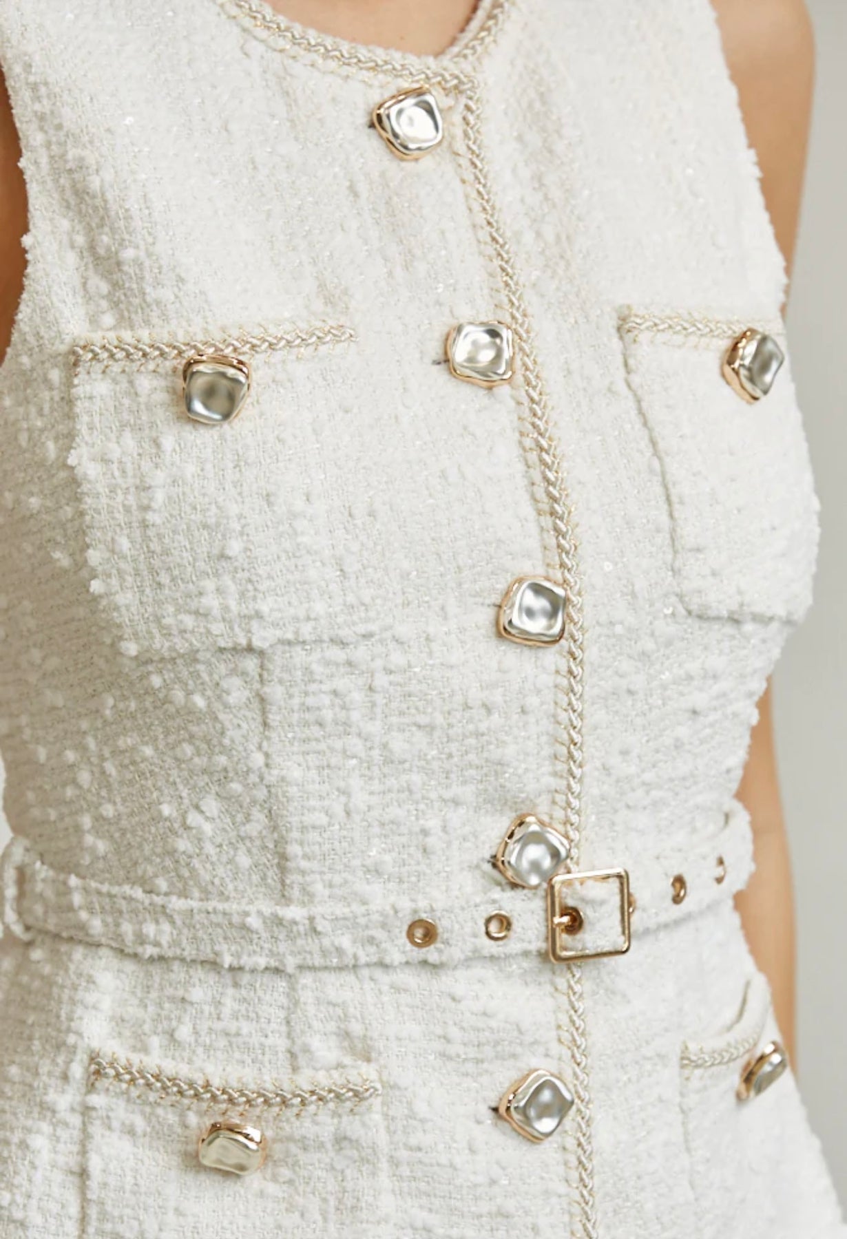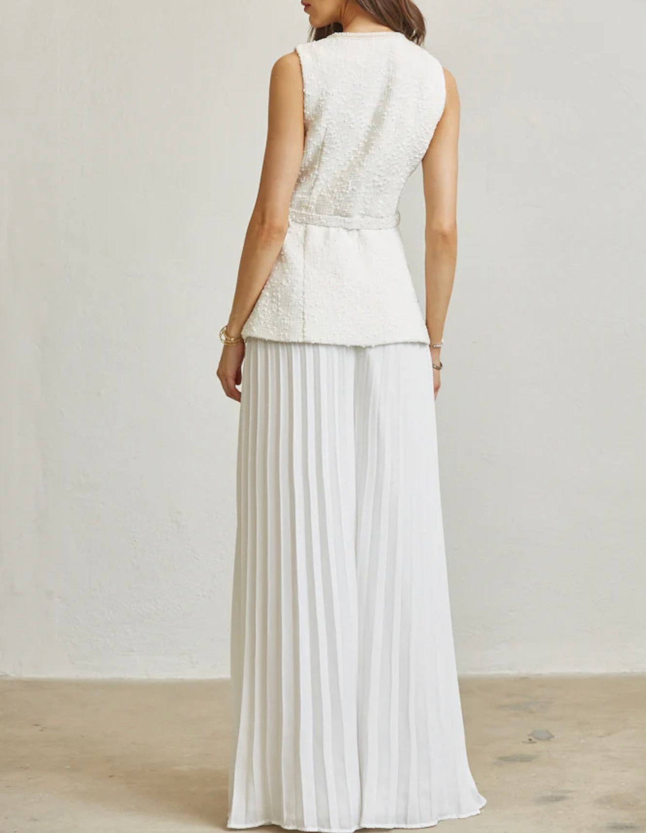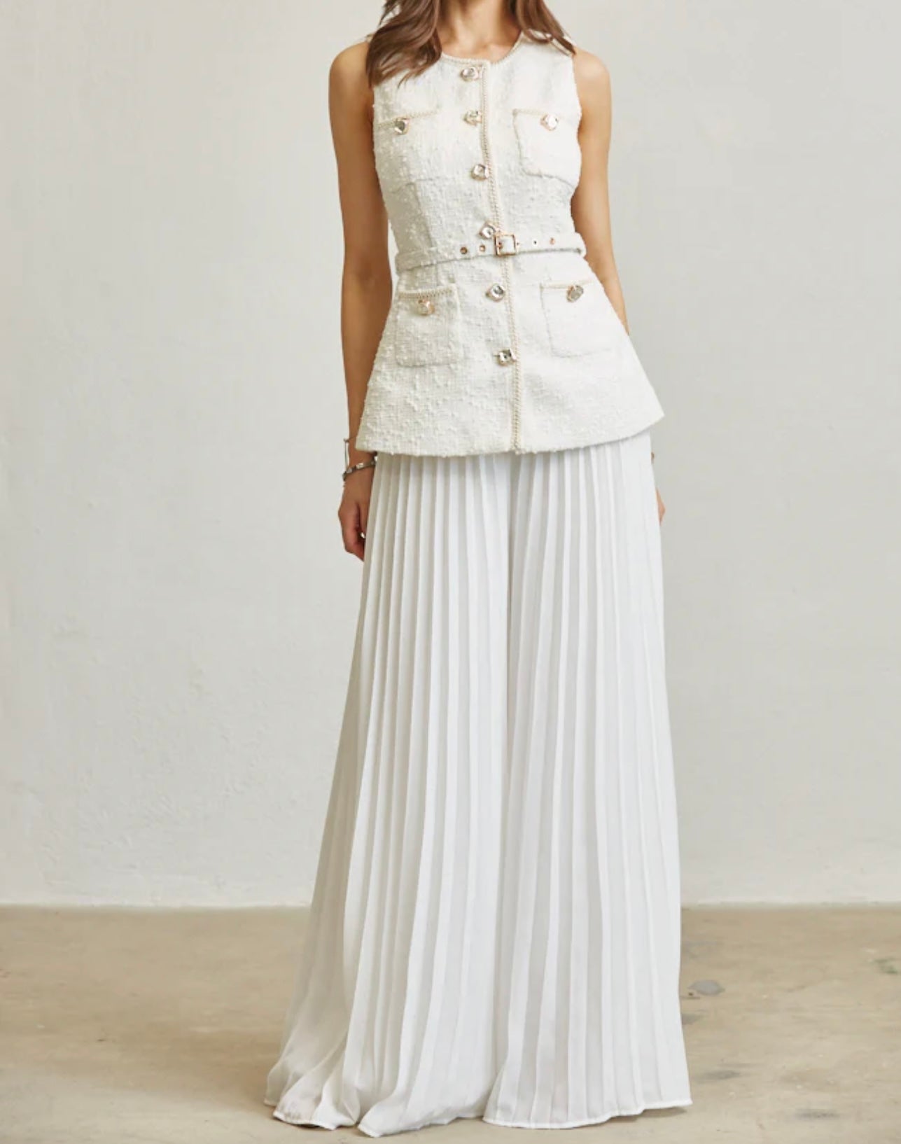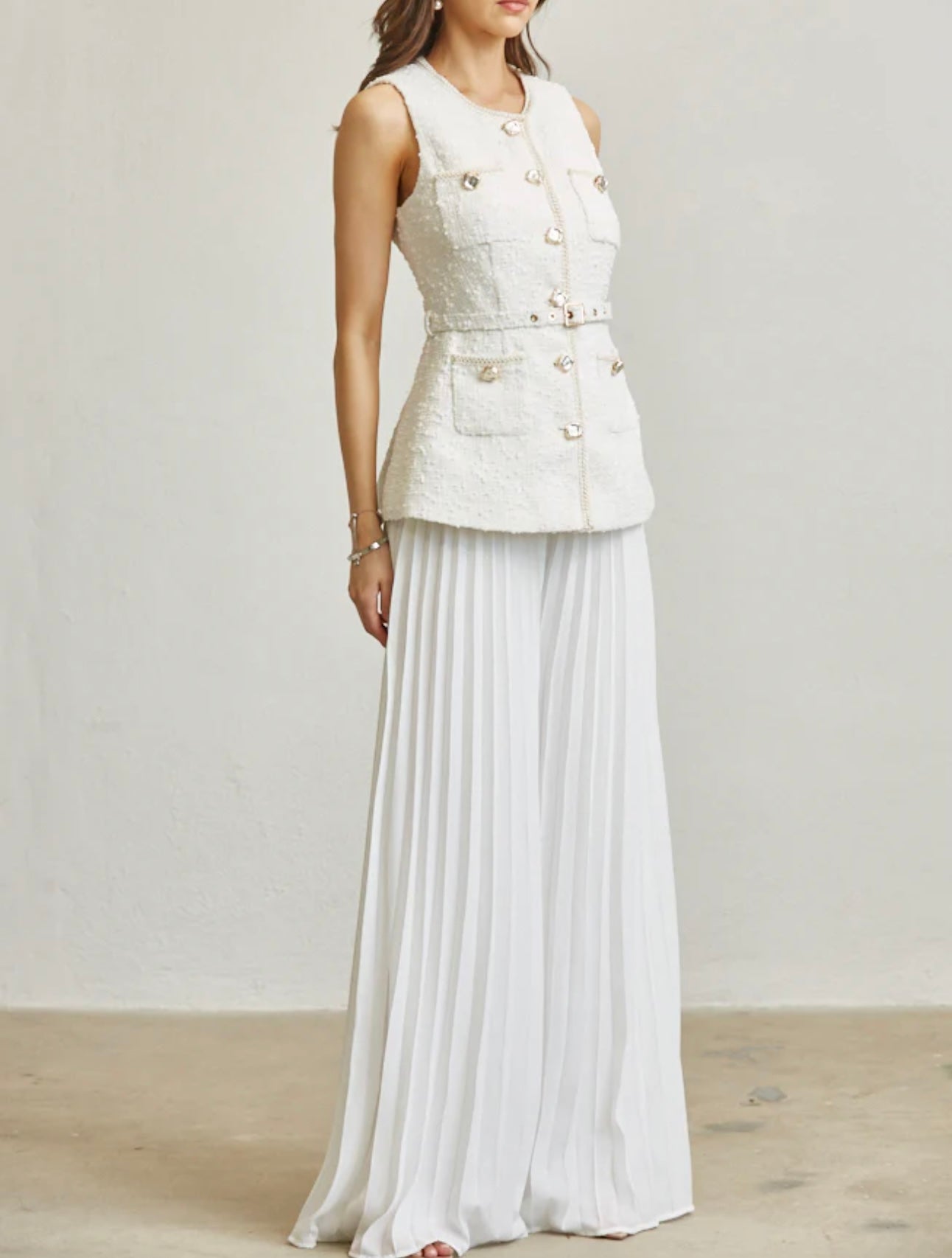 Soft tweed fabric with crushed pearl and gold functional buttons. Faux flap pocket. Besides trim detailing with belt loops and square buckle thin belt. High waist, wide leg pant fit. Accordion pleated. Back zipper closure.