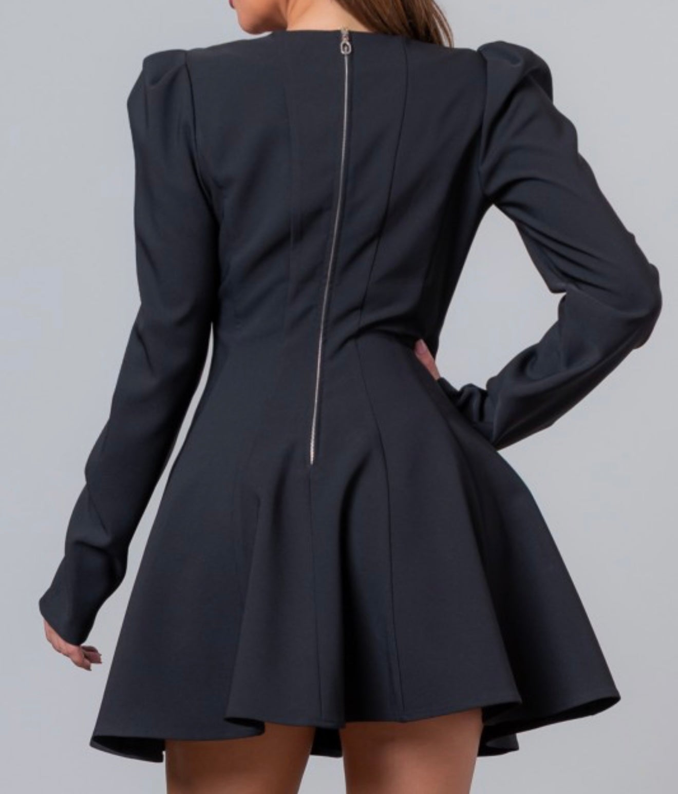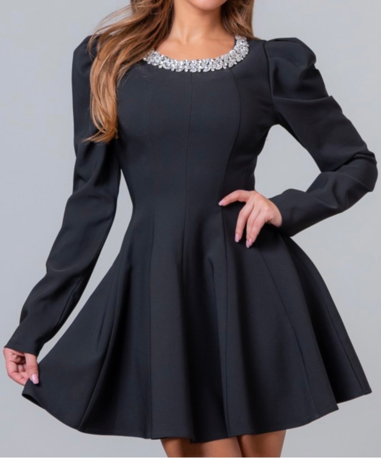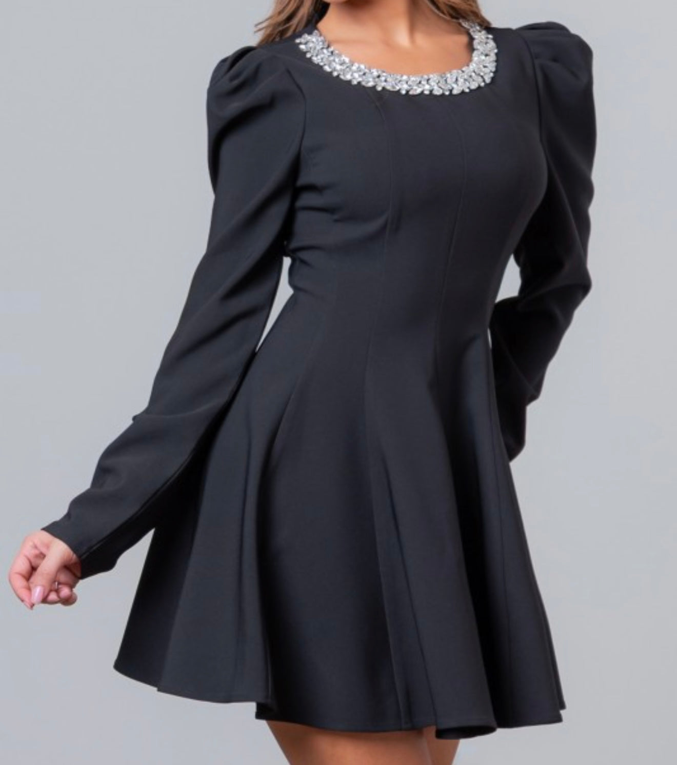 This chic black mini dress features a flattering fit-and-flare silhouette with a cinched waist and elegant pleated skirt. Designed with long puff sleeves and a jeweled neckline, it perfectly blends sophistication with a hint of glam. Finished with a convenient back zipper for a sleek, seamless look.