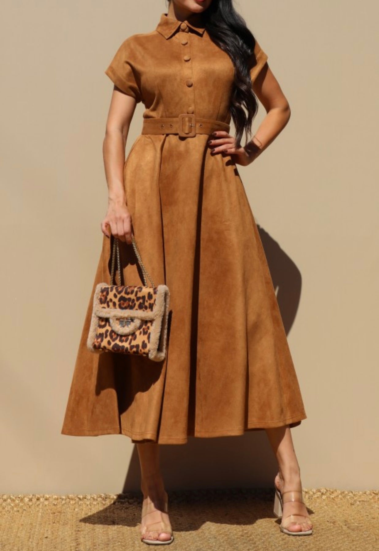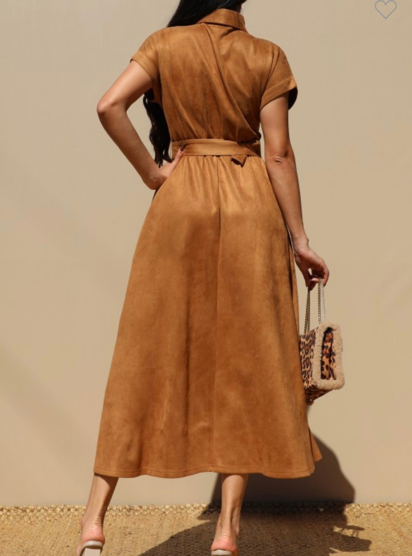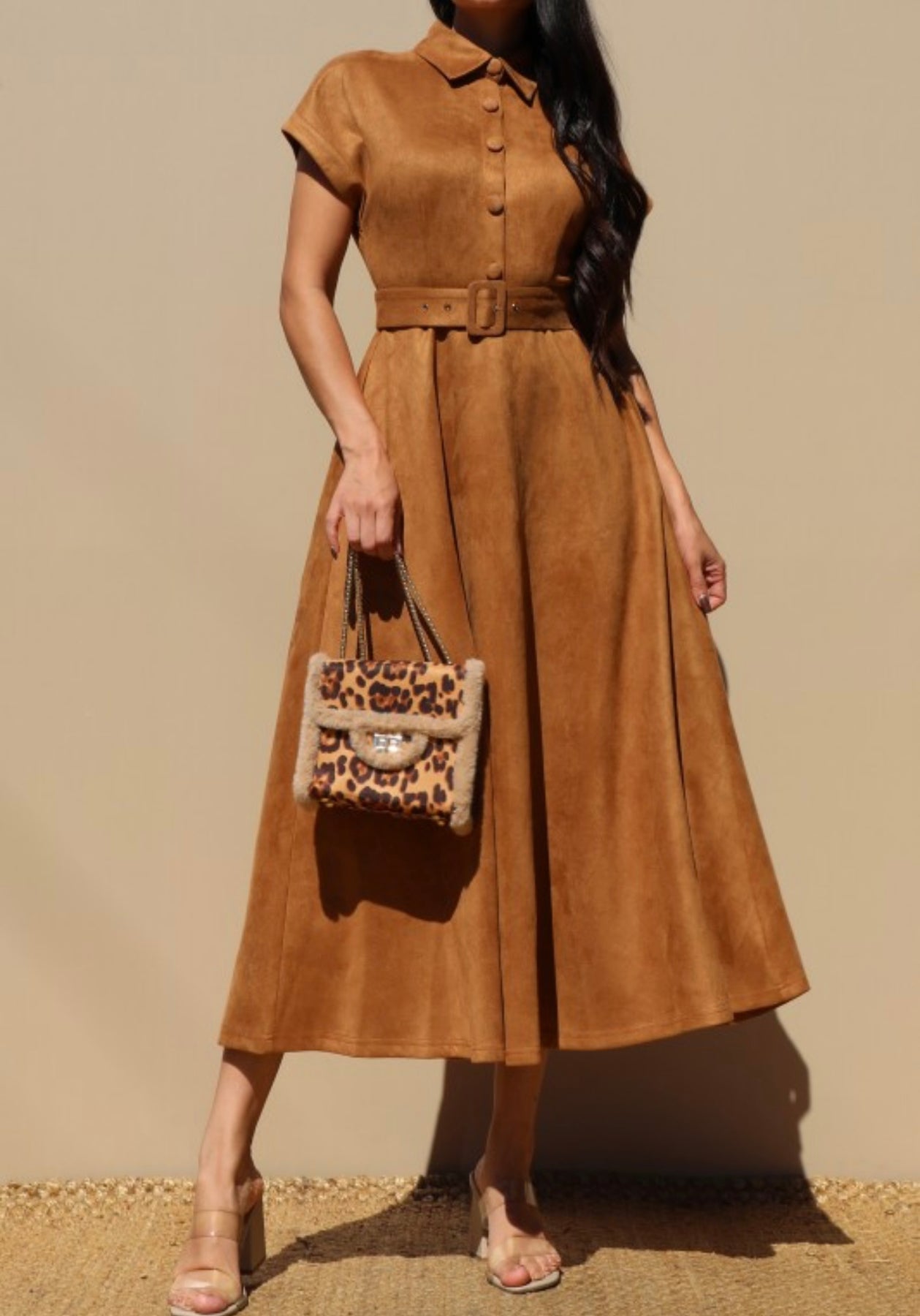 Step out in style with this elegant mocha buttoned down belted dress. Perfect for any occasion, this dress offers a flattering fit and timeless design.