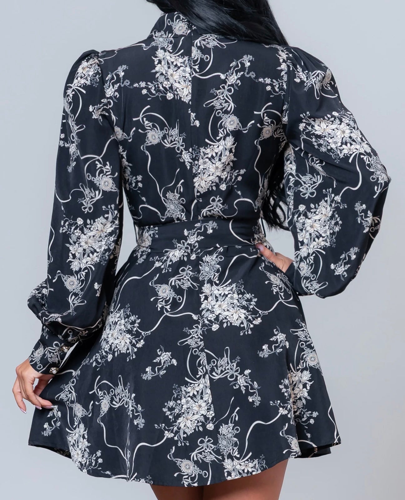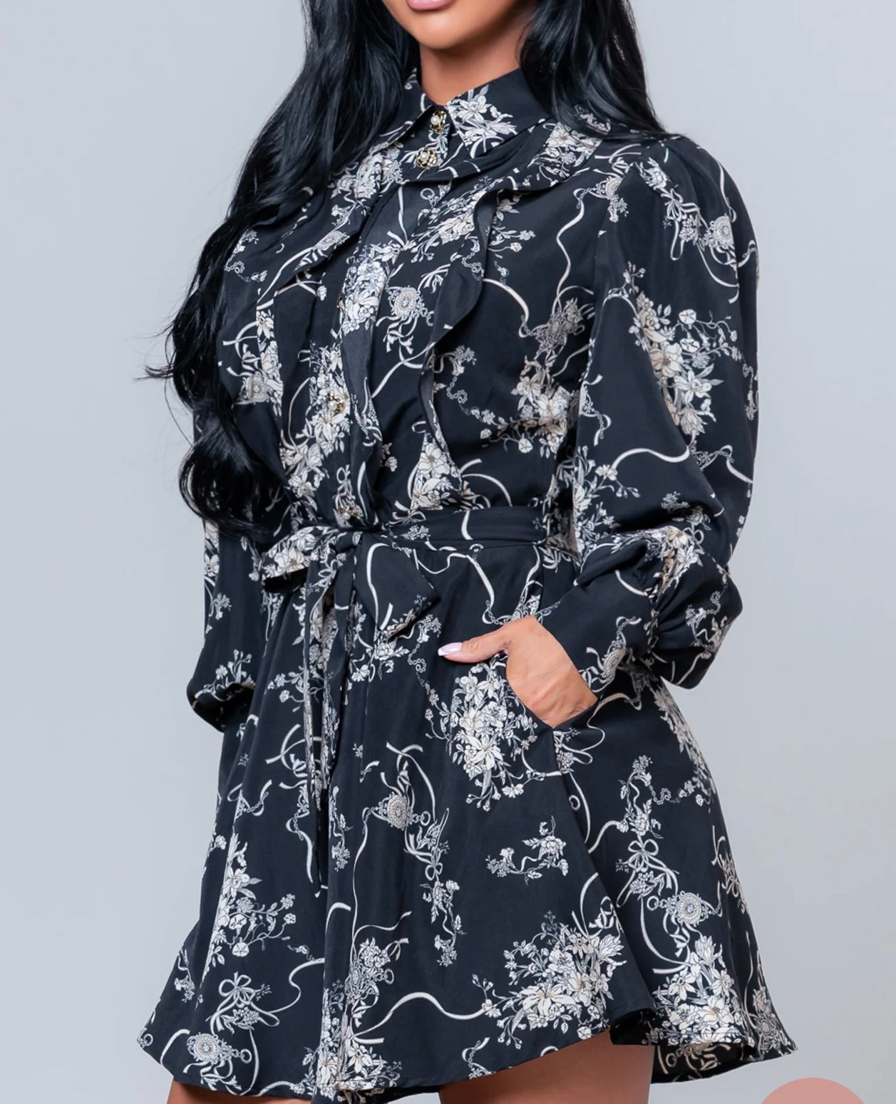 • Details: Adjustable Waist Tie, Ruffle Hem, Mini, Collar, Long Sleeve, Side Pockets, Cuff Sleeve, Back Concealed Zipper.