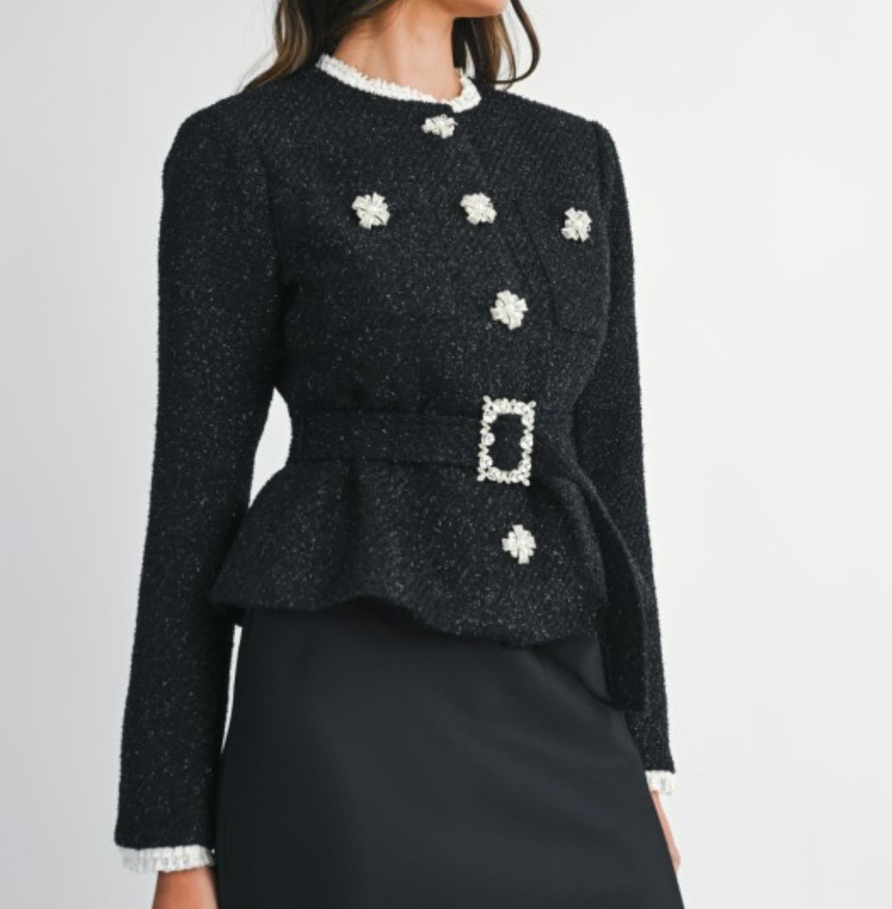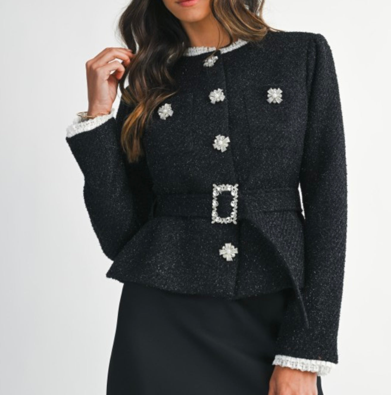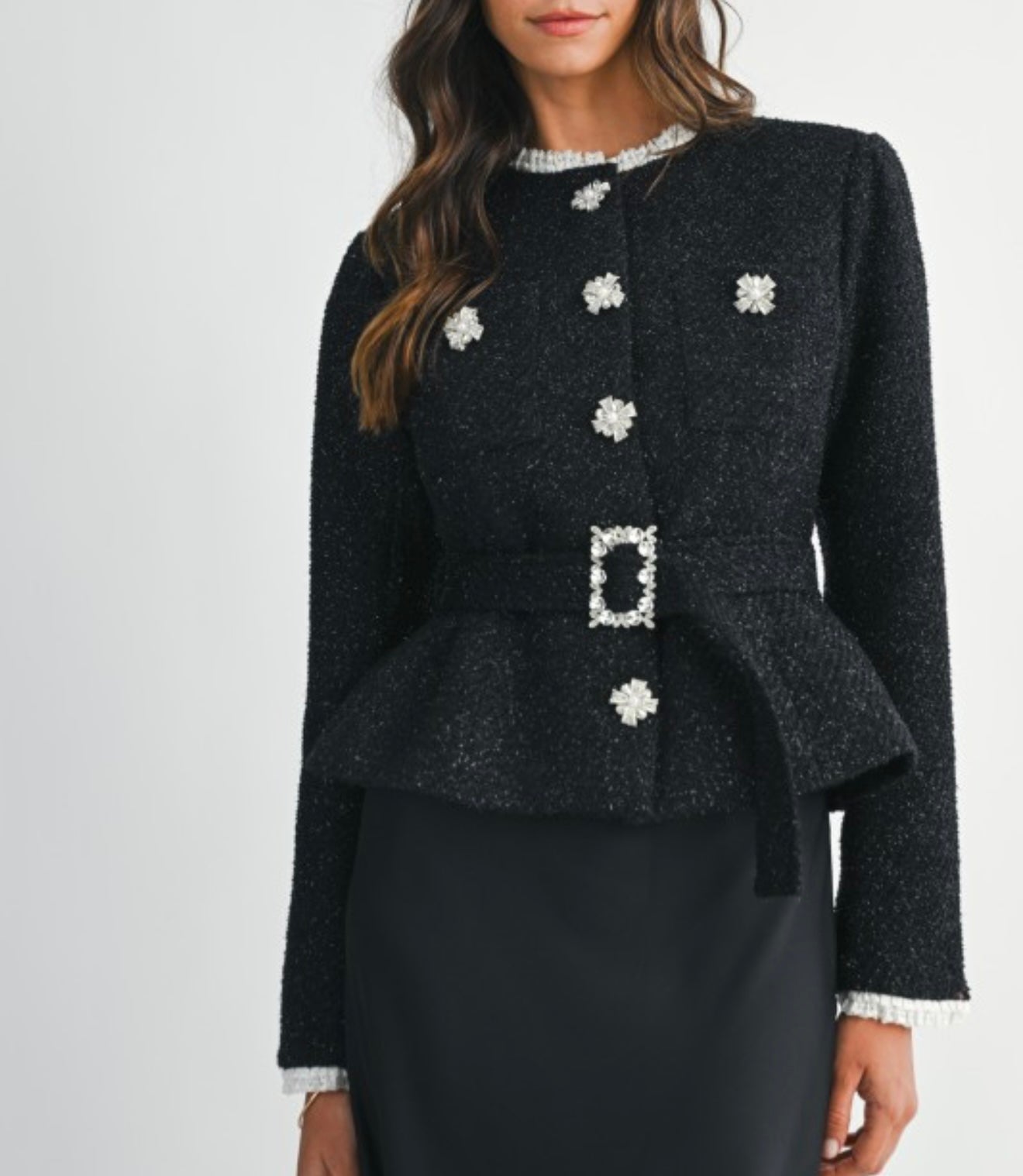 Make a statement in this luxe tweed peplum jacket featuring sparkling jewel buttons and a flattering belted waist. Designed with structured shoulders and a tailored fit, it brings instant elegance to any outfit. Pair it with a sleek pencil skirt or your favorite denim for a look that’s effortlessly glam and totally boss.