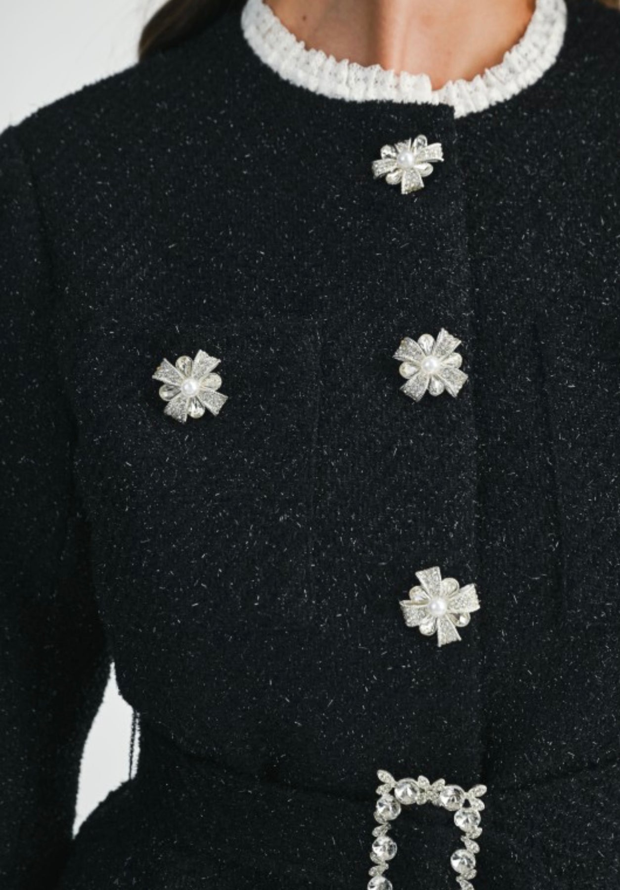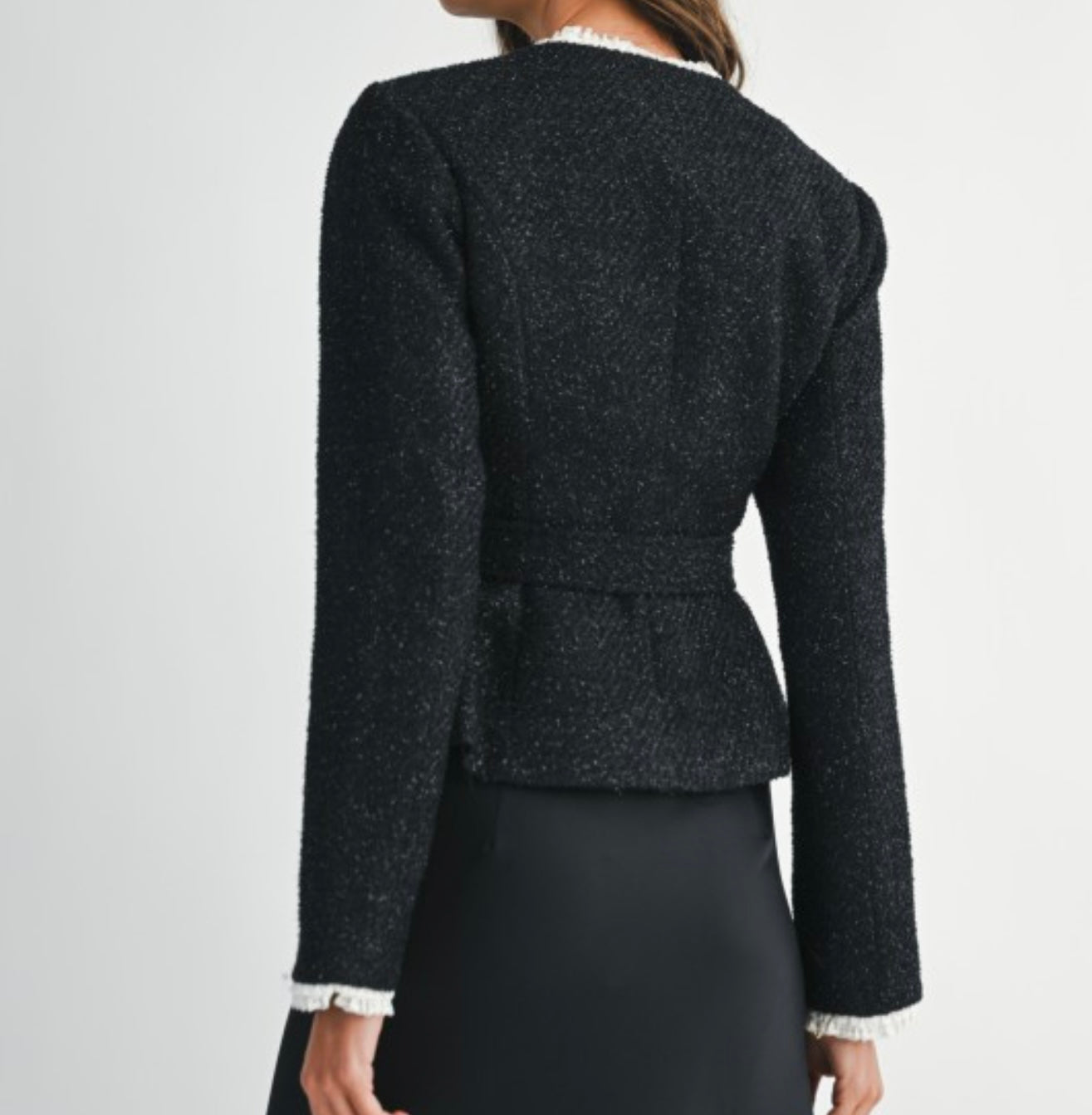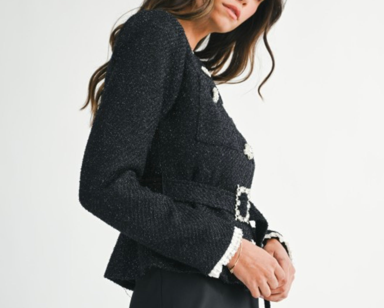 Make a statement in this luxe tweed peplum jacket featuring sparkling jewel buttons and a flattering belted waist. Designed with structured shoulders and a tailored fit, it brings instant elegance to any outfit. Pair it with a sleek pencil skirt or your favorite denim for a look that’s effortlessly glam and totally boss.