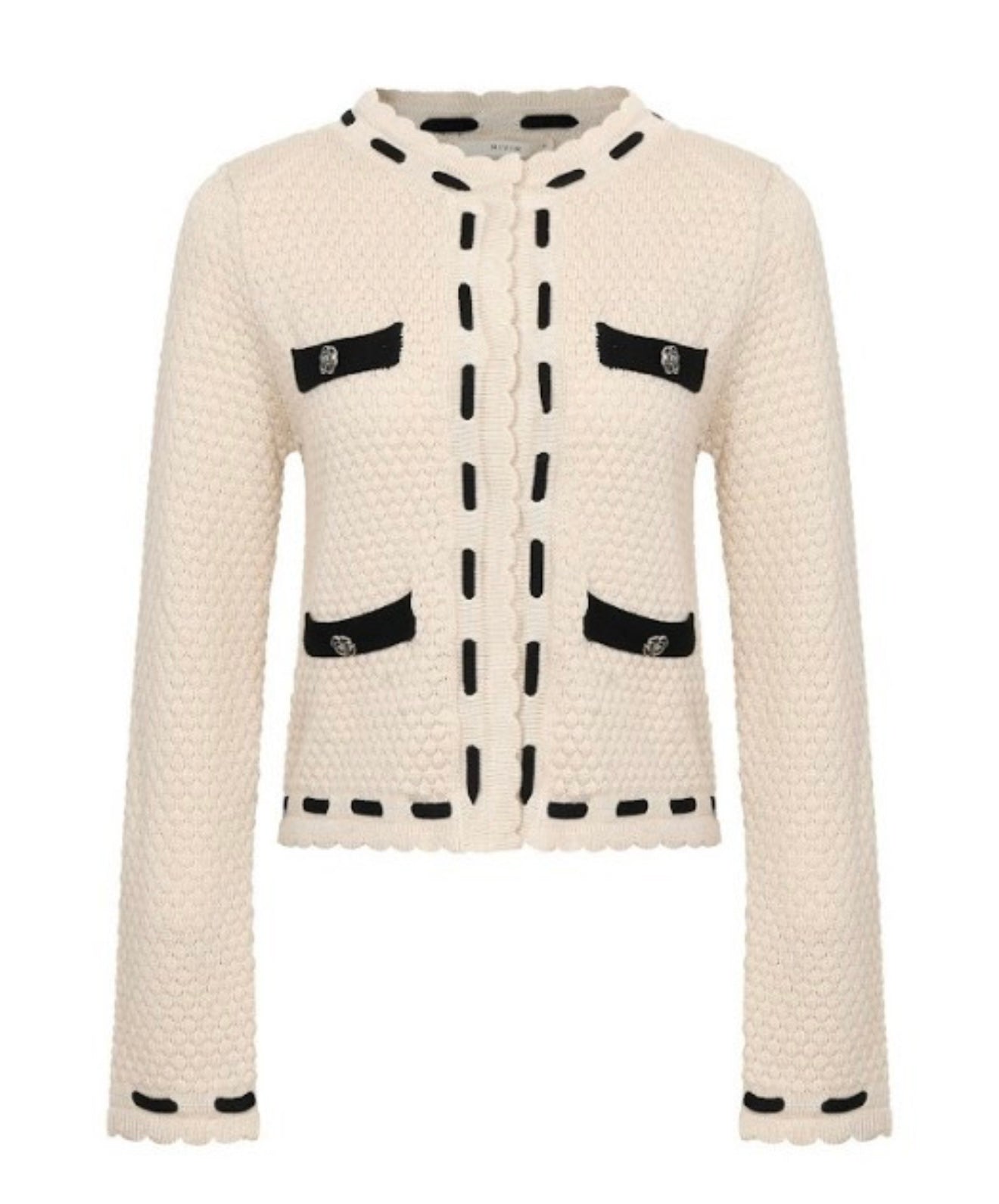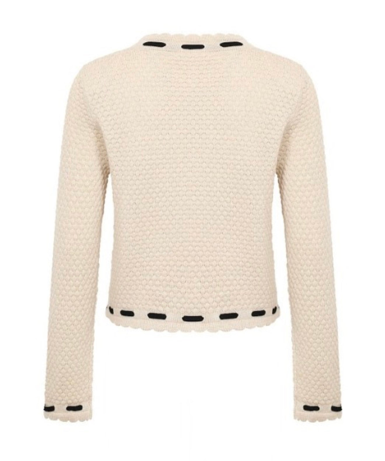 This elegant cream cardigan features stylish black accents, perfect for a sophisticated look. Ideal for any occasion, this jacket combines comfort with chic design.
