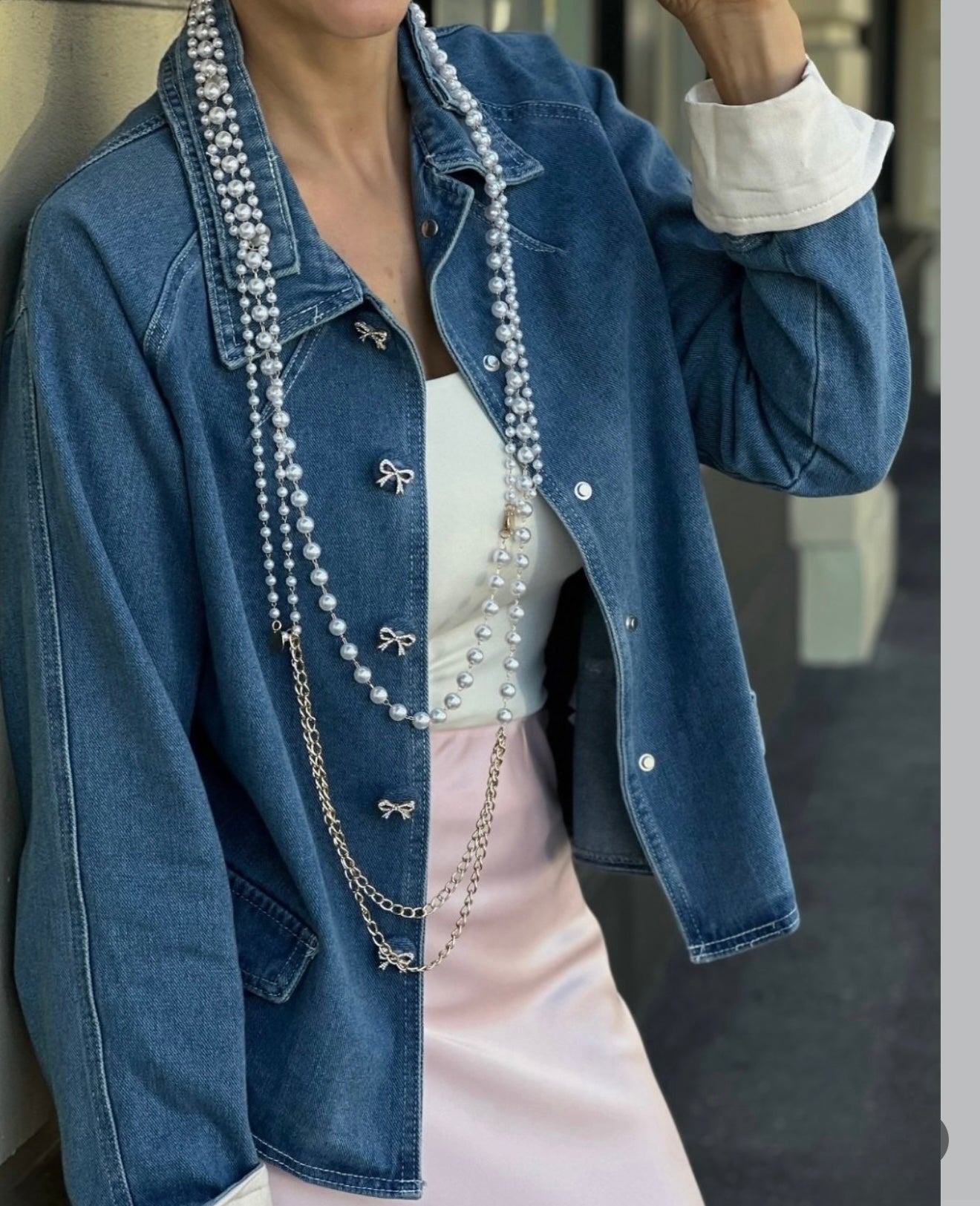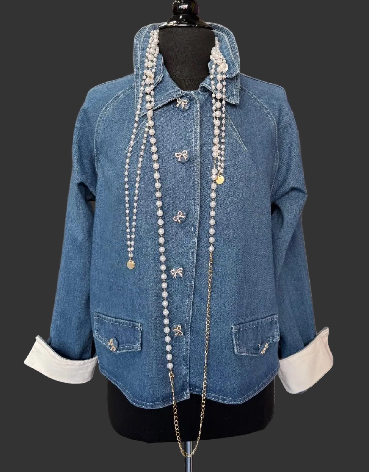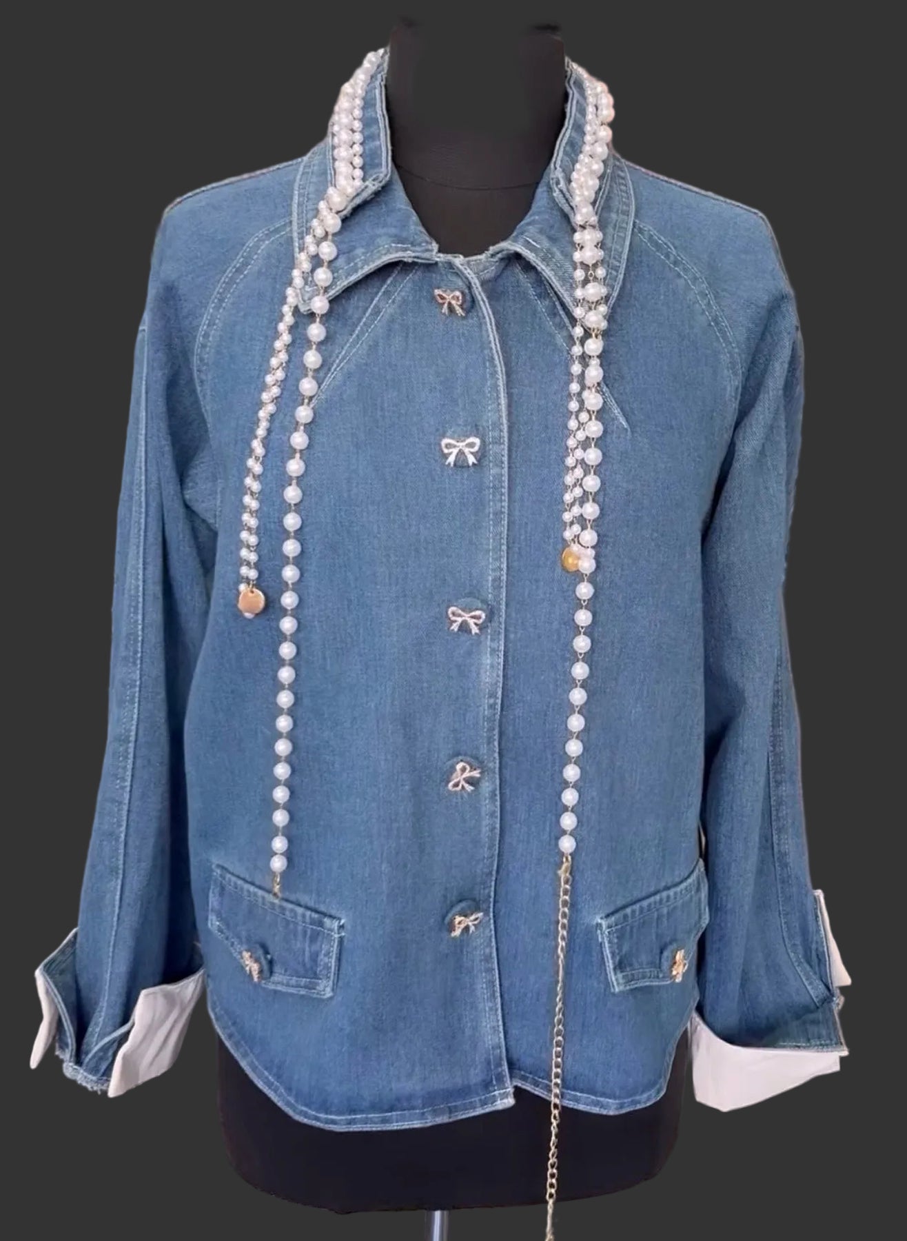 The long sleeves are cuffed with a contrasting light inner lining for a styled, rolled-up look. Two front patch pockets add practicality and balance to the design. The standout touch is the layered pearl-style necklace embellishment draped from the neckline, giving it a sophisticated, boutique-style statement.