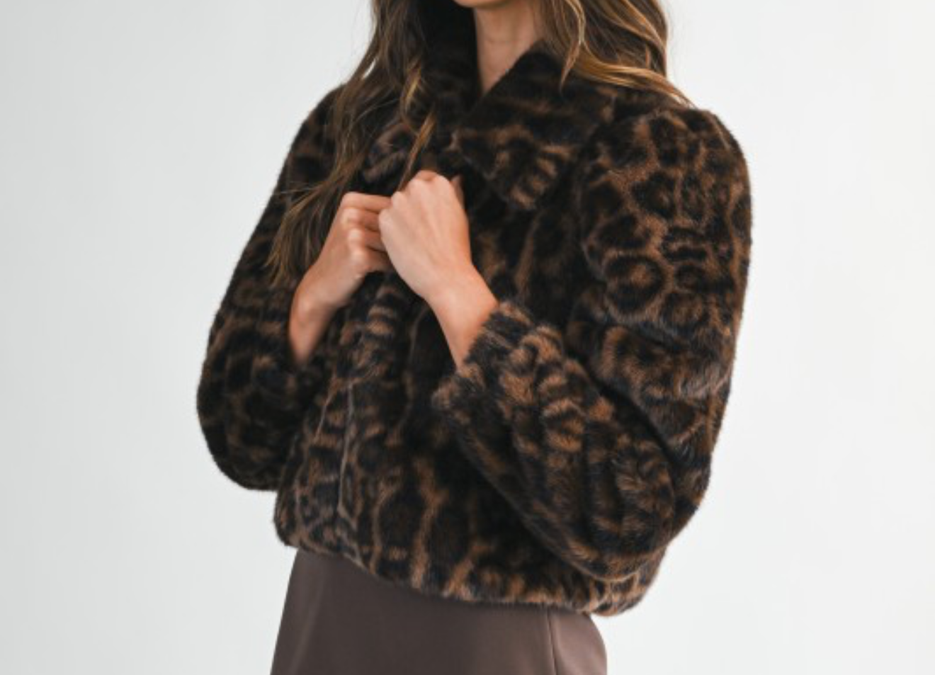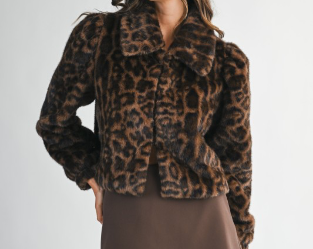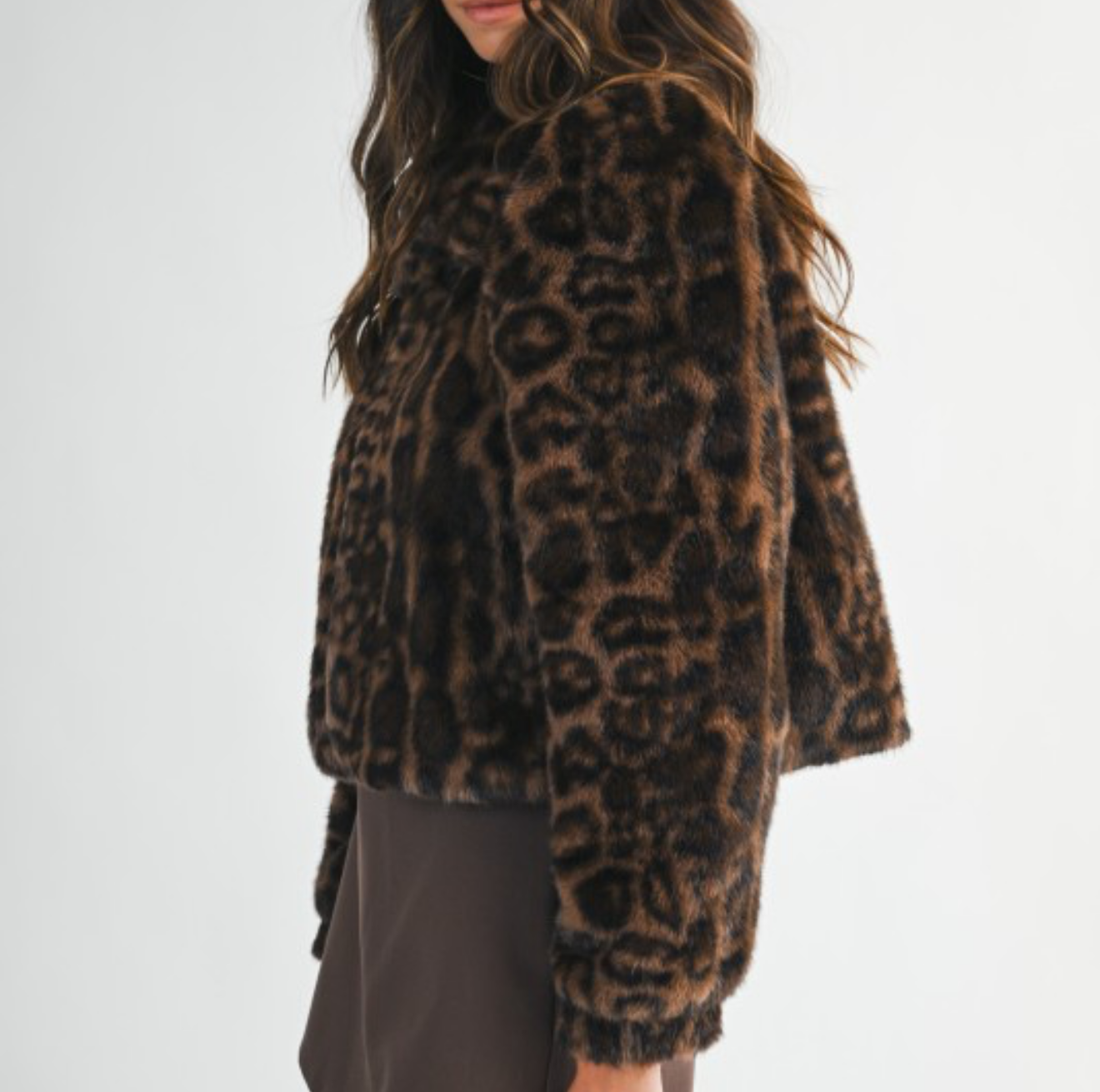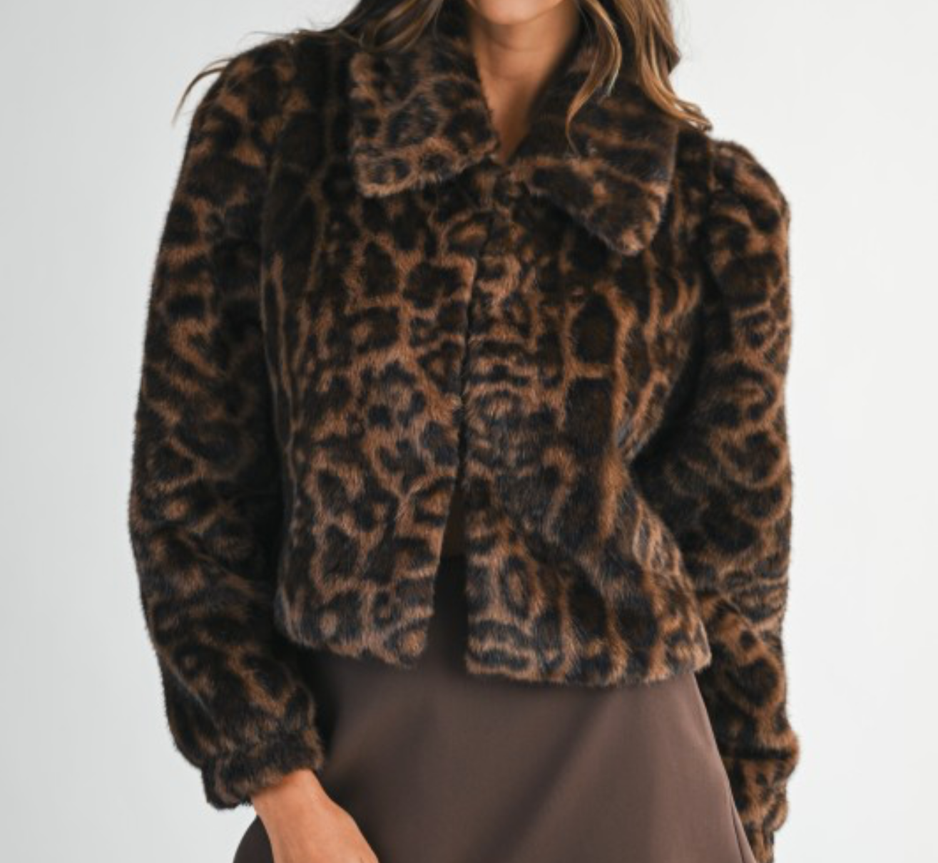 Leopard faux fur collar long sleeve front hook and eye closure crop jacket. Lining.