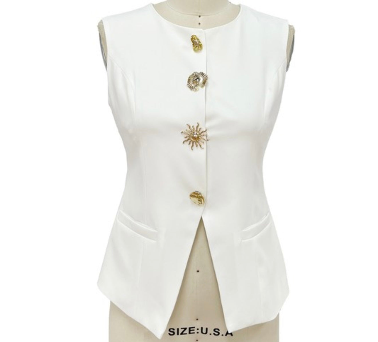 Features four bold metallic gold statement buttons with unique textures.