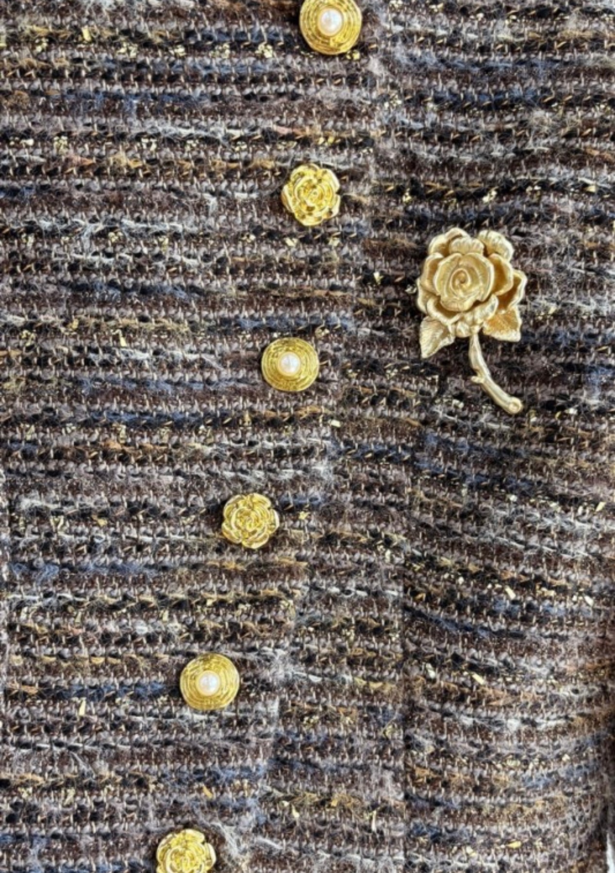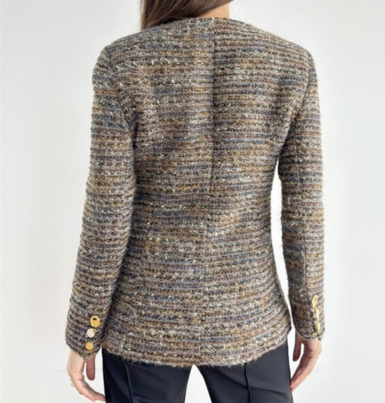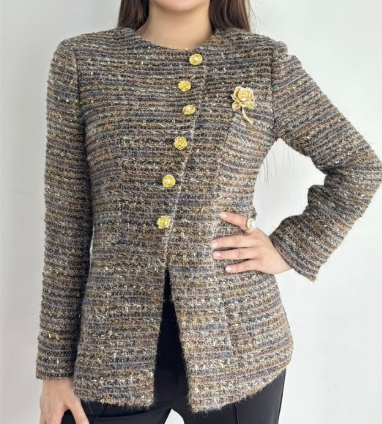 Crafted from an elegant tweed fabric in a rich brown mix, this piece exudes sophistication and warmth. The flattering tailored silhouette is designed to accentuate your shape with soft, feminine curves, while the long sleeves feature matching jewel-style buttons for a cohesive, polished finish.