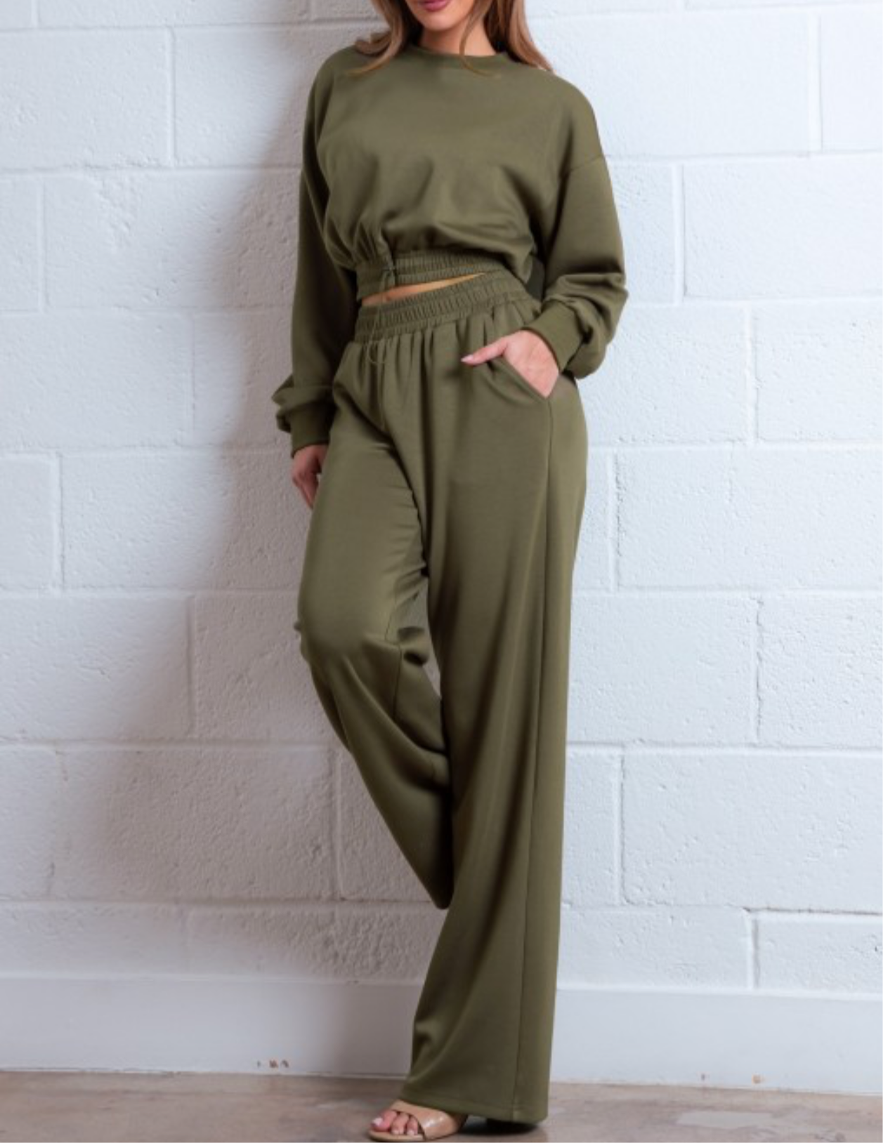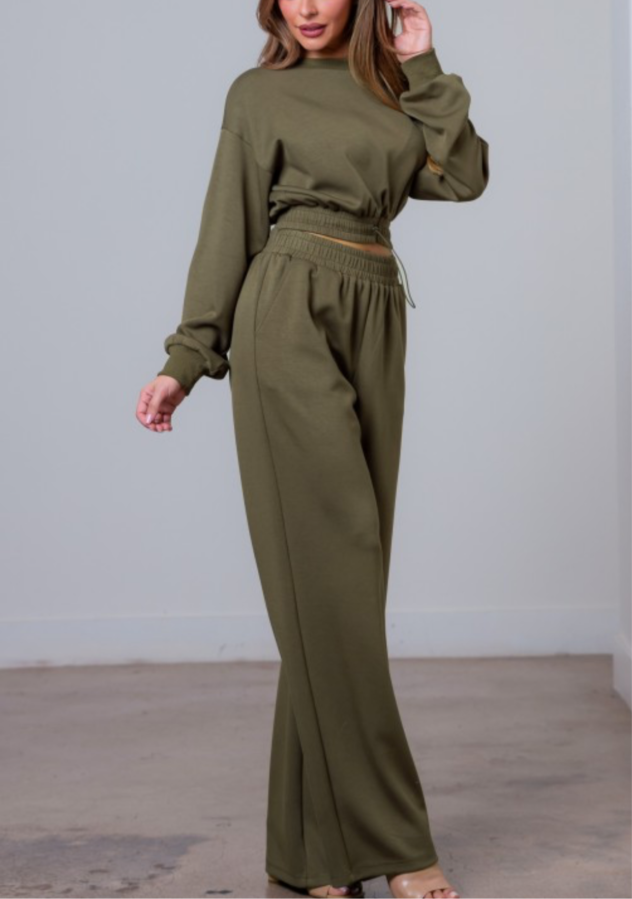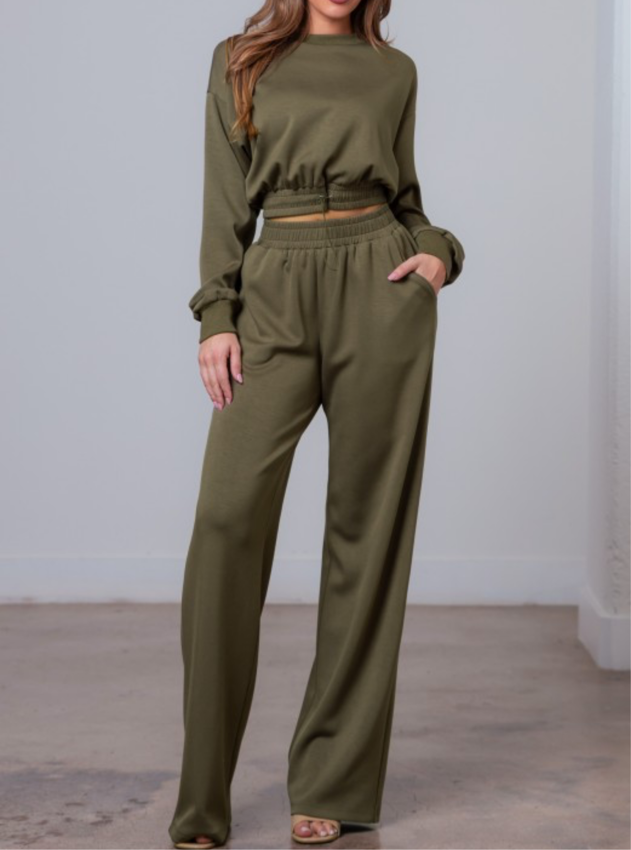 Effortlessly elegant two-piece set designed for modern comfort and style. Features a refined round neckline, long sleeves with soft drape, and wide-leg pants with an elastic drawstring waist and functional side pockets. The cropped top adds a subtle, flattering edge to the relaxed silhouette.