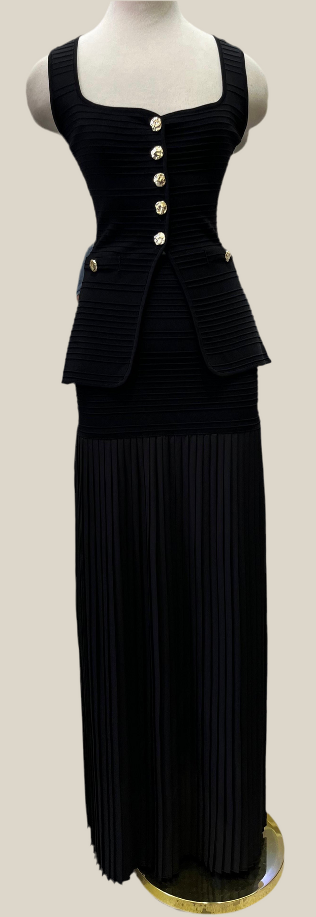 Ribbed bandage knit top and skirt set, accented with statement gold buttons. The top features a partial button-up front with a chic tie-back detail, while the skirt flows into a chiffon pleated maxi silhouette. Finished with a side zipper closure for a seamless fit.